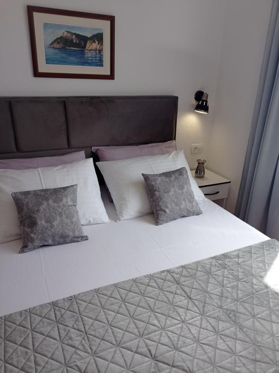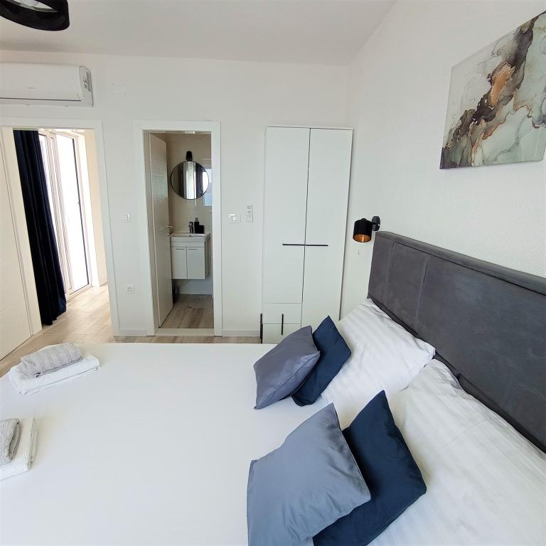 A4 superior - apartament nou, modern la etajul 2 al casei, cu vedere frumoasă la mare, insule și oraș. Capacitate 2+2. Complet echipat și cu aer condiționat în fiecare cameră. A4+2 superior - apartament nou, modern la etajul 2. Două dormitoare, două băi, bucătărie, sufragerie, living și o terasă mare cu vedere la mare și la insule. Aer condiționat în fiecare cameră. A4+4 - apartament mare si spatios la etajul 1 al casei. Complet echipat și cu aer condiționat în fiecare cameră. Este compus din doua dormitoare mari (cu bai), living, bucatarie, sufragerie, trei bai, terasa si balcon cu vedere minunata la mare si insule. A4+1 - apartament la parter. Este compus din două dormitoare spațioase, o baie și o bucătărie cu o sufragerie. De pe terasa mare, care este la umbră naturală, se vede vedere la mare și la insule. A2+2 - apartament la parter, cu terasa. Se compune din dormitor, baie, hol, bucatarie si sufragerie cu pat. Cu aer condiţionat. Vedere la mare.