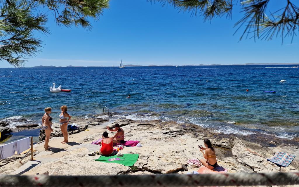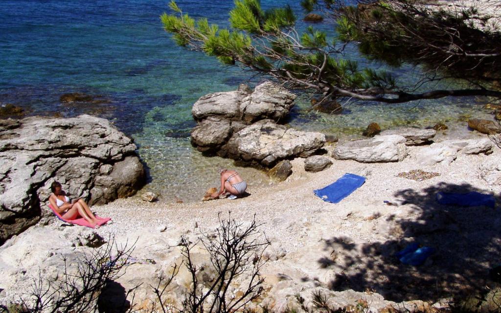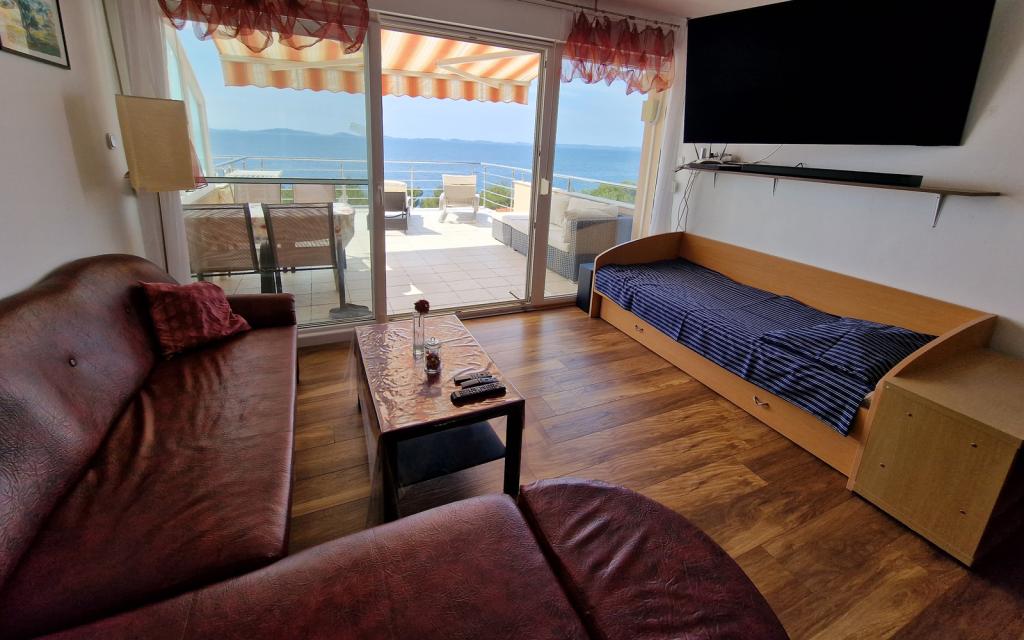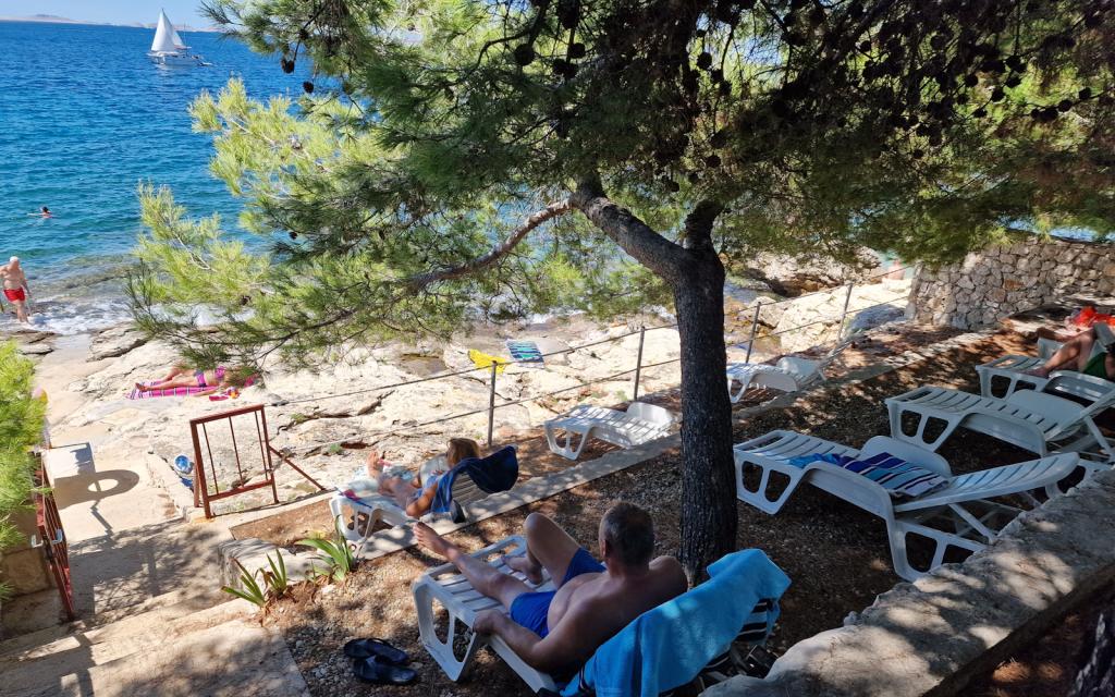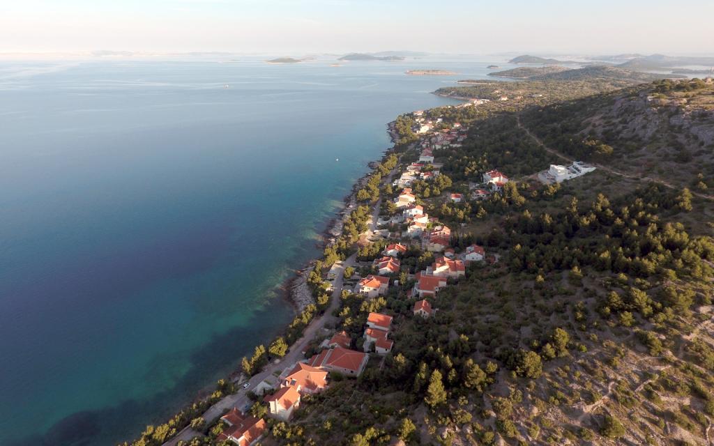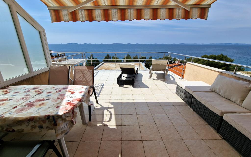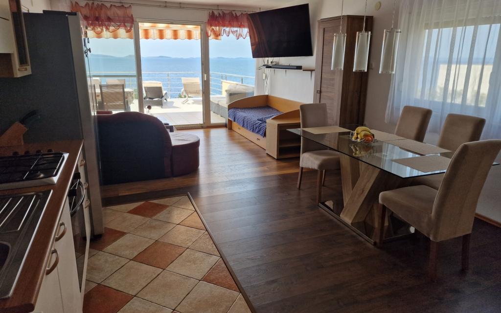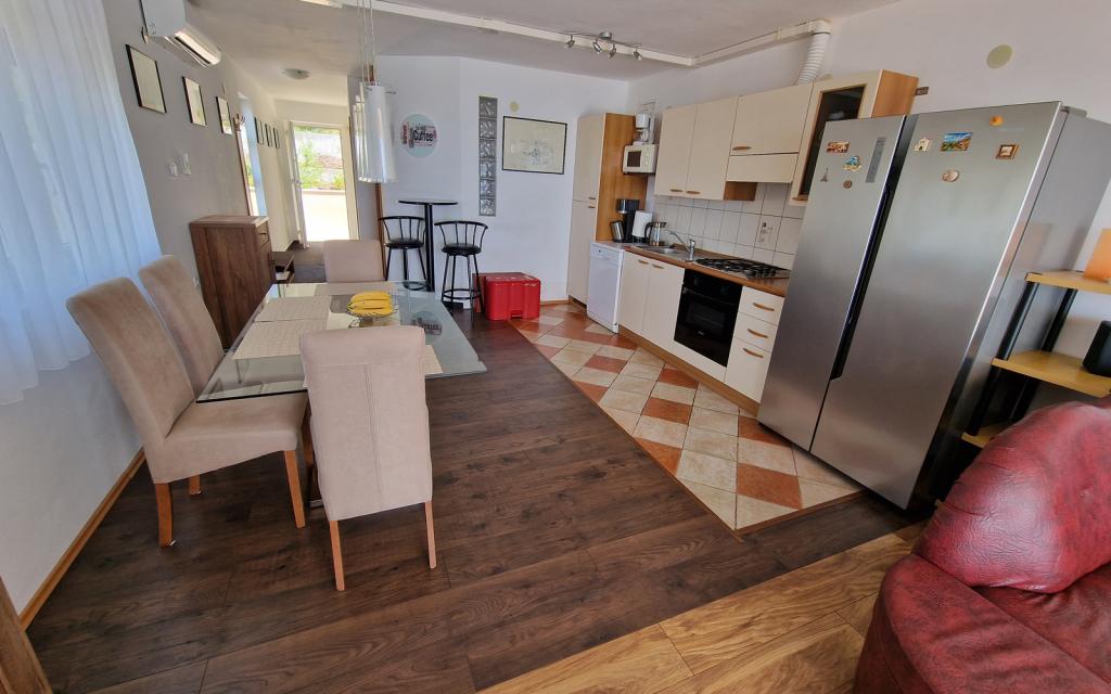 Apartamentul G1 este situat deasupra casei superioare pe partea de vest. Are o suprafață de 50 m2 cu încă 20 m2 de terasă. Este destinat unui sejur confortabil de 2 până la 3 persoane, cu o terasă mare și vedere panoramică la Kornati și la marea deschisă între Kornati și Murter. Apartamentul are un dormitor și o baie cu toaletă și o zonă comună mare deschisă vizual complet către terasă și vedere panoramică la mare. În acest spațiu comun există o bucătărie cu o sufragerie și un living. Apartamentul este dotat cu aer conditionat puternic, internet WiFi, programe prin satelit si serviciu de streaming (netflix). Lângă apartament este disponibil un loc de parcare și o zonă umbrită lângă plajă cu șezlonguri.