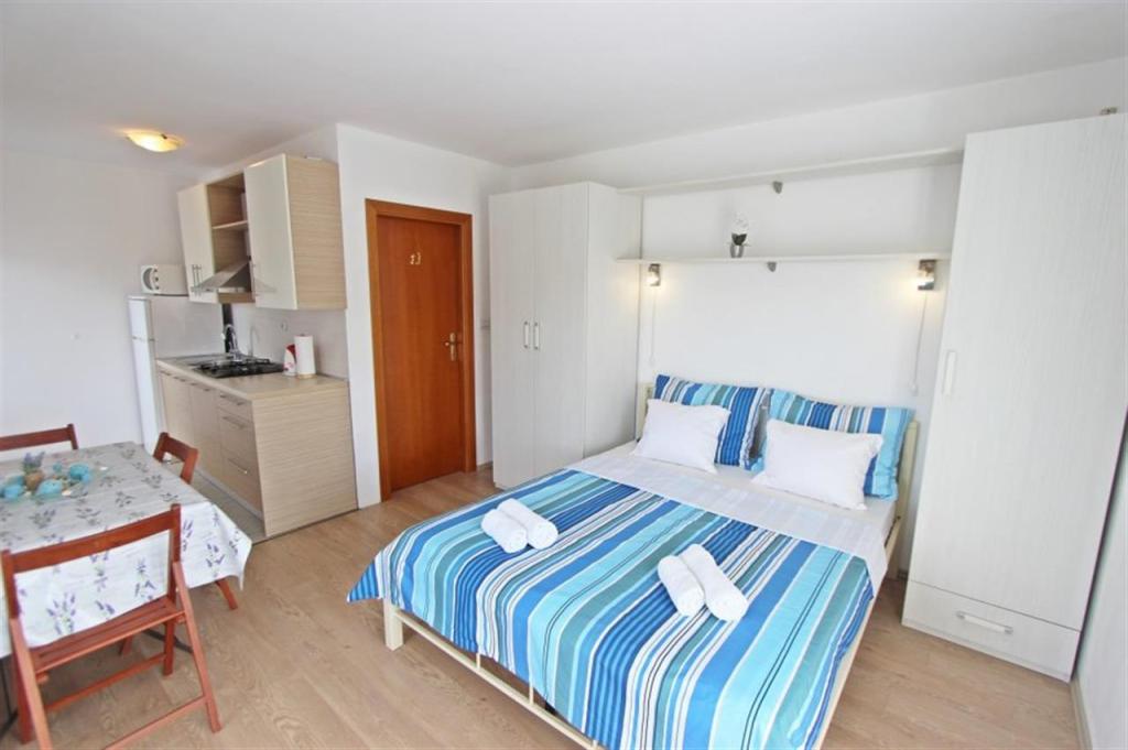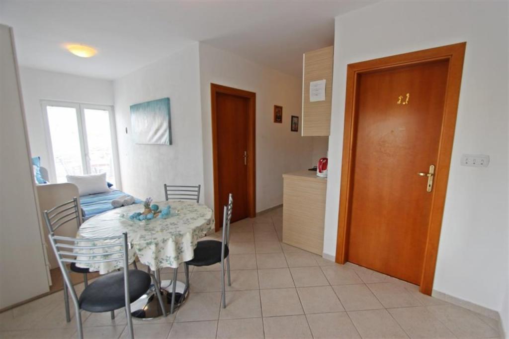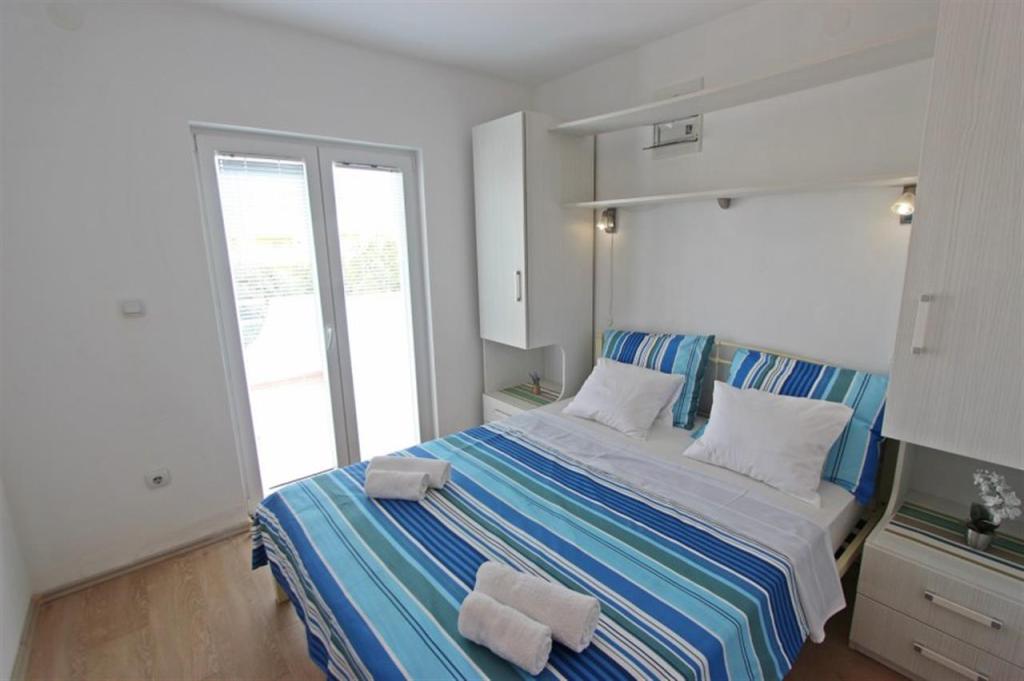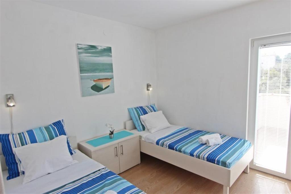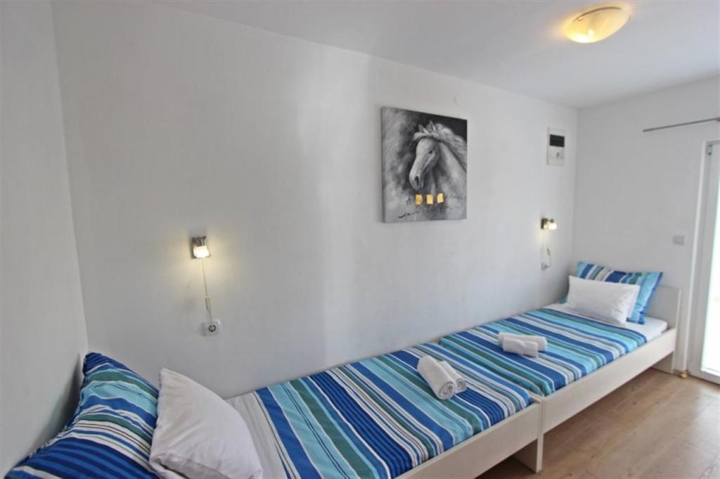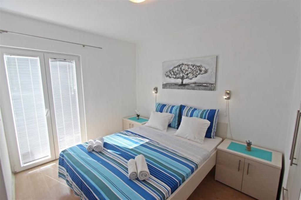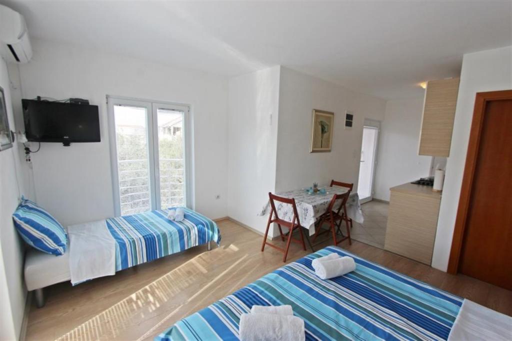 Apartamente pentru patru persoane 2 + 2 sau garsoniere 2 + 1. Acestea constau dintr-un dormitor (un pat dublu) si o camera cu doua paturi de o persoana (dimensiuni 200x90) sau un dormitor si un pat in living, in timp ce garsonierele constau dintr-un pat dublu cu pat suplimentar, bucatarie, baie si terasa mare. (15m2 / 18m2). De asemenea, la parter se afla o camera cu masina de spalat rufe pe care oaspetii o pot folosi. Apartamentele sunt dotate cu televizor si aer conditionat, wi-fi, cuptor cu microunde si frigider cu congelator. In fata apartamentului avem un gratar exterior pe care oaspetii il pot folosi oricand. Parcarea este asigurata si situata in curte. Distanța până la prima plajă și magazine este de 250 m, iar centrul este la 1 km