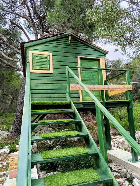 Resortul Zen este situat pe insulița Mali Vinik din golful Hramina, în apropierea centrului orașului Murter, unde se poate ajunge cu barca, călătoria durând 5 minute. Cazarea este formată din două clădiri, o casă de piatră cu o suprafață de 40m2 și o „căsuță în copac” auxiliară din lemn (izolată termic), cu o suprafață de 9m2, care este folosită ca dormitor pentru două persoane (cost suplimentar - 60 de euro pe noapte). Casa din lemn este dotată cu electricitate de 220V, smart TV, difuzor BT, ventilator și aer condiționat. Casa principală, din piatră, este formată dintr-un dormitor, situat la galerie, cu un smart TV care poate găzdui 2 adulți. Livingul are o canapea extensibilă, care poate fi folosită ca pat pentru două persoane, dotată cu iluminat, televizor, soundbar. Baia este dotată cu toaletă, chiuvetă și un duș spațios. Suprafața balconului/terasei este de 40m2. Casa pescarului este dotată cu două televizoare, IPtv, încălzire/răcire AC, wifi. Parcarea este asigurată și inclusă în preț. Casa pescarului are propriul doc pentru bărci.