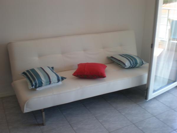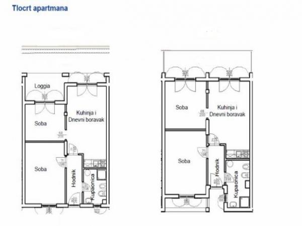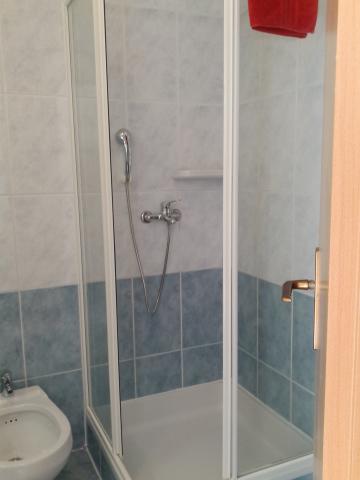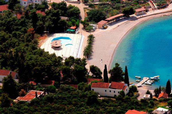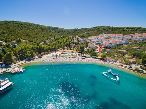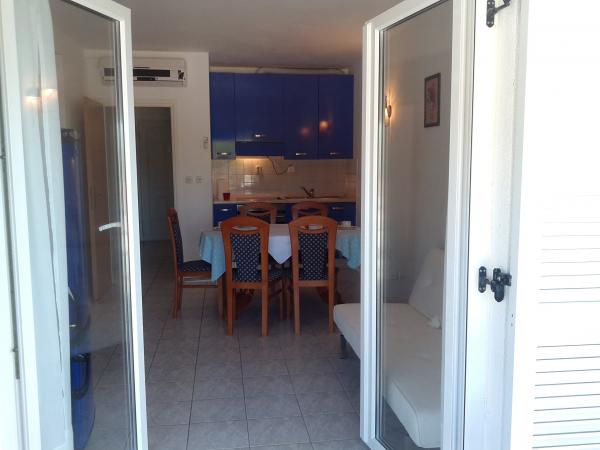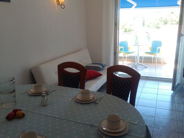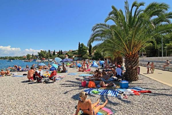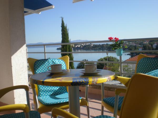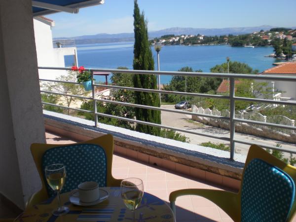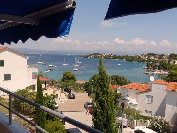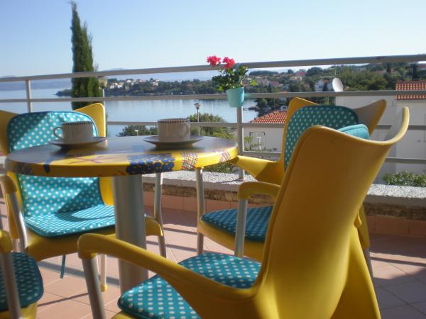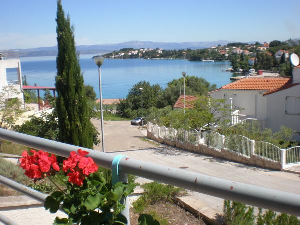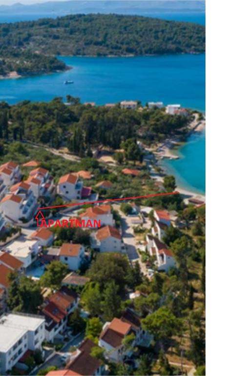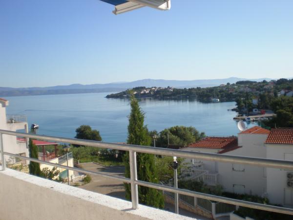 Apartament complet utilat si modern in imediata apropiere a plajei cu pietris. Unitatea este situată la 2 minute de mers pe jos de plajă și de centrul orașului. Este compus dintr-un hol de intrare, doua dormitoare, o baie, un living cu bucatarie si un balcon mare. Din balcon se vede plaja, padurea de pini, golful si in departare insula Čiovo si orasul Split. În dormitorul mai mare, există paturi pentru trei persoane: un pat mare pentru două persoane și un pat pentru o persoană. Camera mai mica este dotata cu un pat pentru doua persoane a carui orientare permite oaspetelui sa se trezeasca cu vedere la mare din pat. Bucătăria este dotată cu toate electrocasnicele necesare: frigider, cuptor, aragaz, mașină de spălat vase, mașină de spălat, ceainic și alte ustensile de bucătărie. Oaspeții au la dispoziție grătare electrice și cu cărbune. În living există o masă mare de bucătărie, canapea și televizor. Există o parcare publică lângă apartament, care este gratuită, dar nu este posibilă rezervarea.
