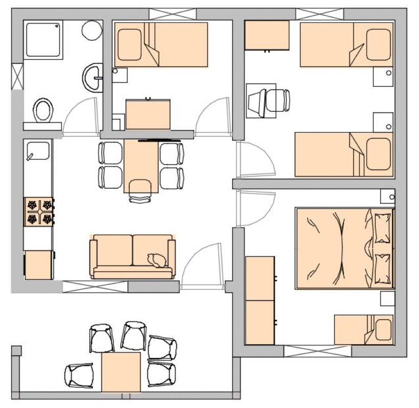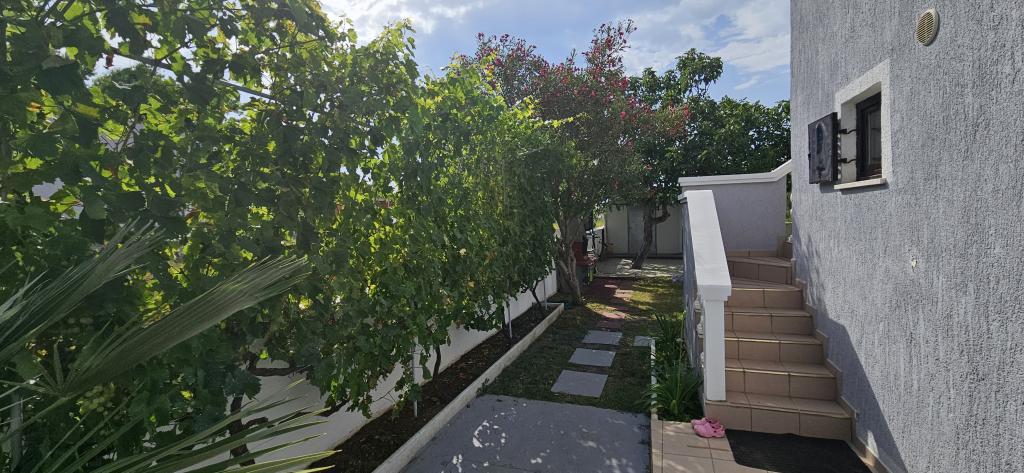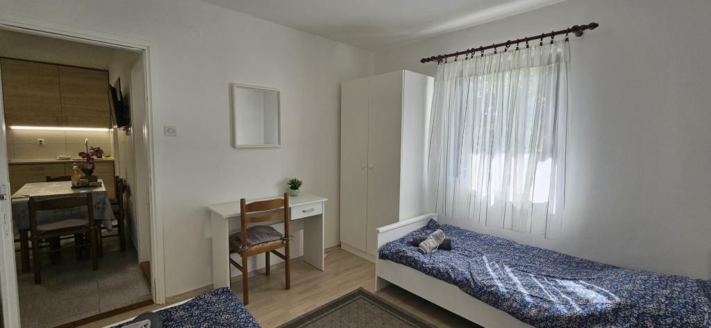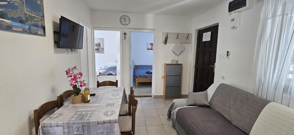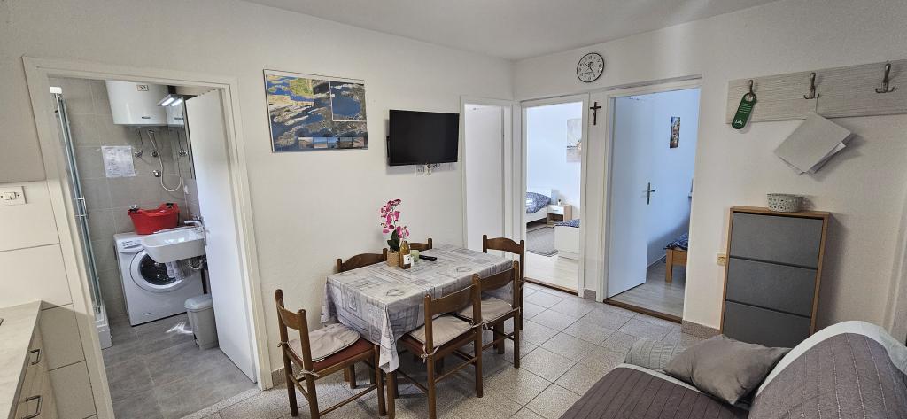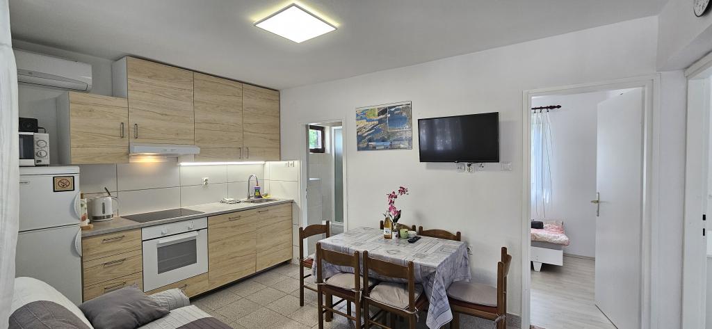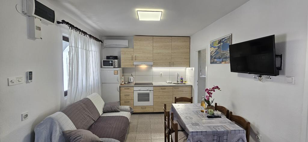 Apartament pentru 5 persoane la parterul casei din satul Vrsi Zukve cu intrare separata si terasa. Apartamentul are 56 m2 si este compus din: 3 dormitoare (camera 1: pat dublu mare, dulap cu patru aripi, patut; camera a 2-a: doua paturi de o persoana, dulap dublu, birou; camera a 3-a: pat de o persoana, dulap), living cu masa pentru 6 persoane, set canapea si TV LED, bucatarie noua cu electrocasnice incorporabile (plita, cuptor, masina de spalat vase), frigider si congelator combinat, cuptor cu microunde, ceainic, toaster; baie noua cu dus si terasa exterioara acoperita cu masa si scaune in umbra naturala. Casa este situata pe un teren de 380 m2, intr-o zona linistita, cu multa verdeata si departe de trafic. Loc de parcare la umbra si gratar in curte. Utilizări duș exterior și curte. Distanța de la plaja cu nisip este de 450 m. Este disponibil WiFi