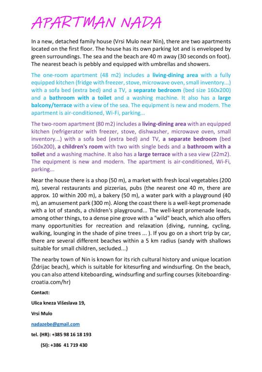Taxa de rezidenta este inclusa in pret. Document de confirmare a rezervării la rezervareIn apropierea apartamentului se afla un magazin (50 m), o piata (200 m), cateva restaurante, pizzerii si baruri. Dacă nu vrei să gătești, poți comanda o masă gata făcută acasă. Pentru distracția tinerilor, există un parc acvatic cu loc de joacă (40 m), un parc de distracții (300 m). De-a lungul coastei sunt amenajate o promenadă cu tarabe, un loc de joacă pentru copii și un colț de recreere. Promenada duce într-o pădure deasă de pini cu plaje „sălbatice” care oferă și numeroase oportunități de recreere și relaxare (scufundări, jogging, ciclism, plimbare sau culcat la umbra pinilor...). Zona mai largă are 34 km de plaje diferite - nisipoase, pietricele, stâncoase, multe golfuri ascunse și umbră în pădurea de pini. Nin, care se află în apropiere, este cunoscut ca un oraș antic cu vestigii romane și are, de asemenea, zone cu noroi curativ pentru kiteboarding. Zona mai largă are piste de biciclete bine întreținute. De la noi sunt organizate excursii la Parcul Național Kornati, Telaščica, Zrmanja, Paklenica, precum și excursii mai scurte în împrejurimi.