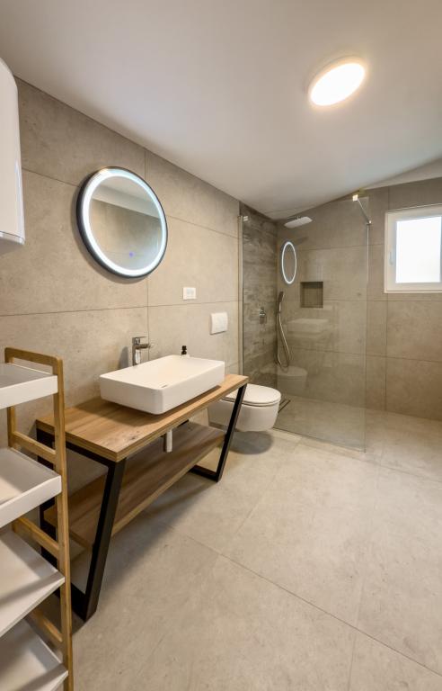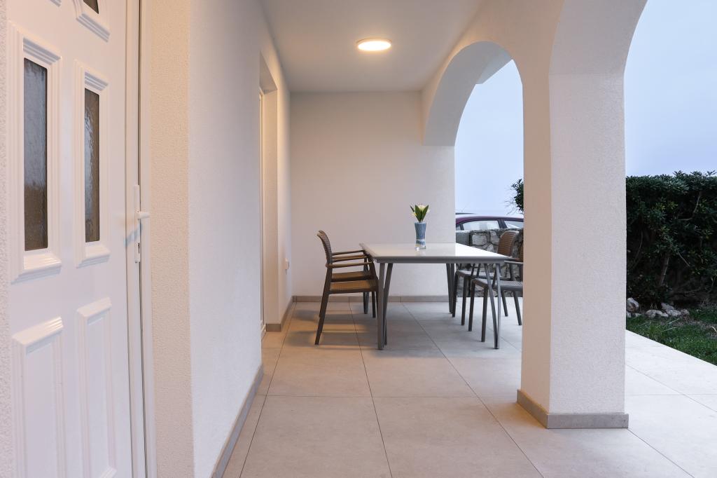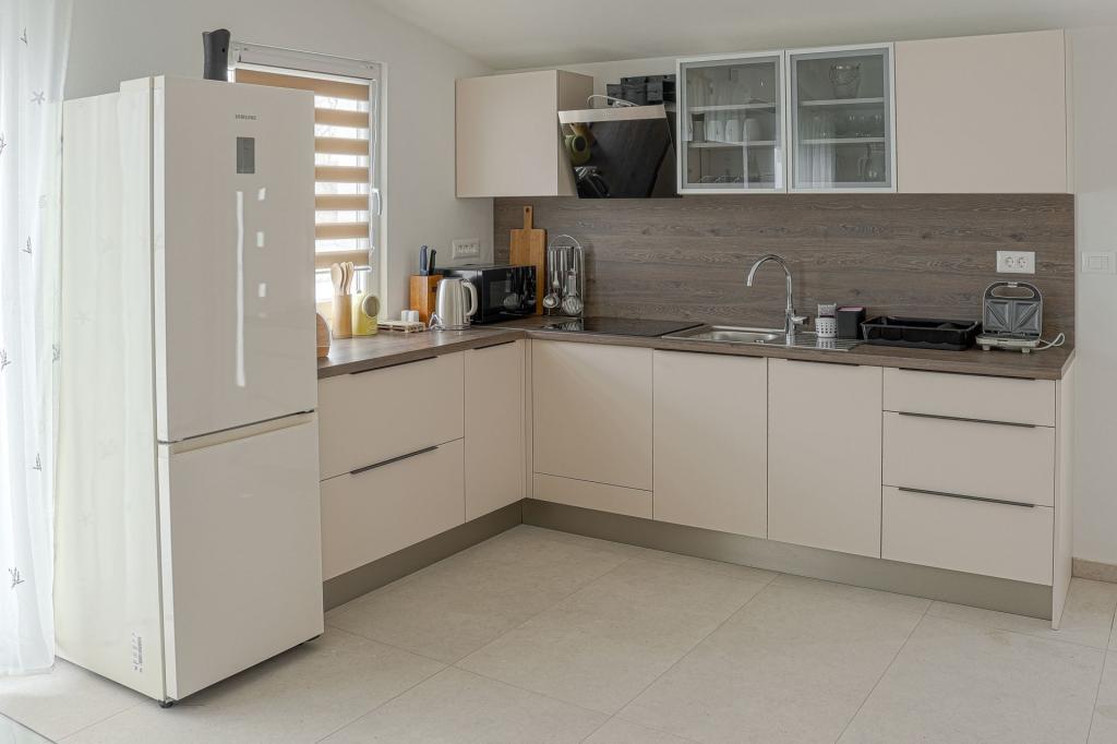 Apartamente spațioase, recent renovate și complet echipate, situate la doar 15 metri de mare. Apartamentul 1 se află la parter (100 m² inclusiv terasa) și dispune de o grădină privată, în timp ce Apartamentul 2 este situat la etaj (70 m² cu un balcon de 50 m²), fiind ideale pentru familii și grupuri de prieteni. Fiecare apartament are două dormitoare, un living, o bucătărie și o baie. Oaspeții beneficiază de aer condiționat, TV și Wi-Fi. Proprietatea oferă, de asemenea, parcare privată și duș exterior. Un punct de atracție special îl reprezintă apusurile magice și priveliștea spectaculoasă asupra Munților Velebit.