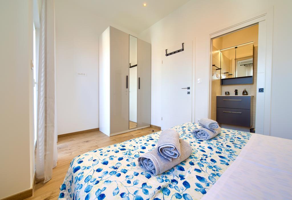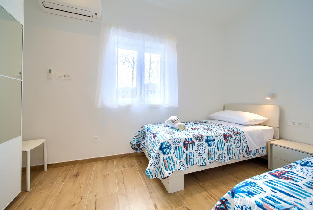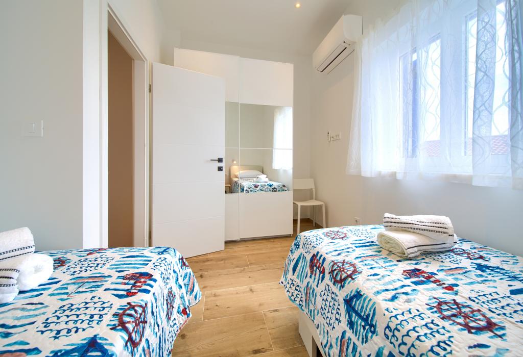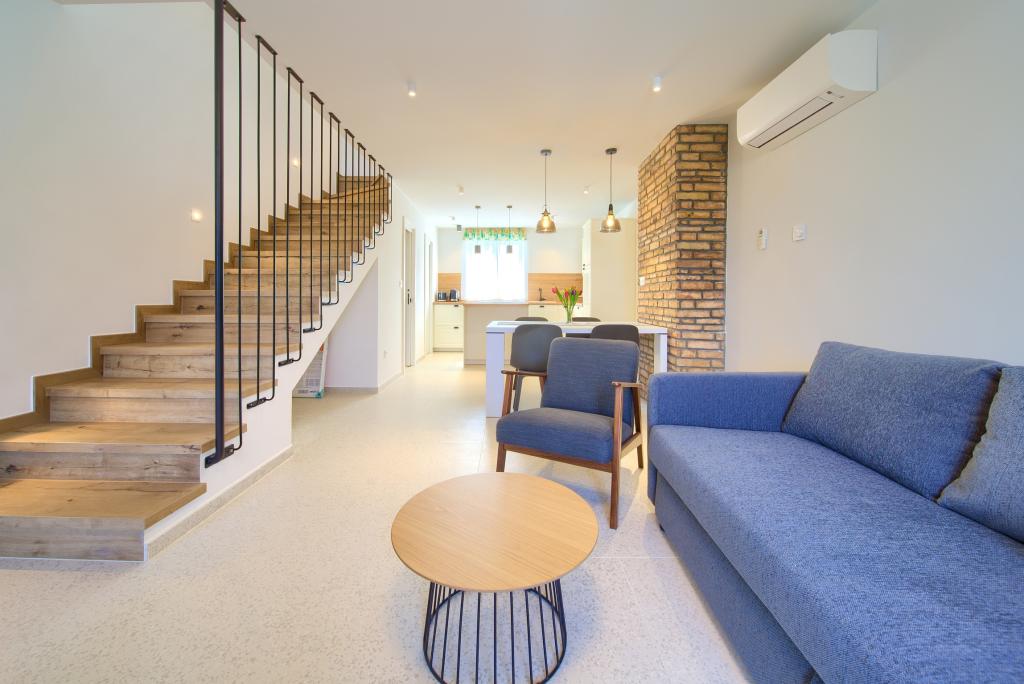 Apartamente modern utilate într-o zonă liniștită, situate în centrul orașului. Apartamentul este pe două etaje, cu o suprafață totală de 70m2, la primul etaj fiind dormitoare, fiecare cu baie proprie. La parter se află o bucătărie spațioasă cu un living și o toaletă mică. Proprietatea este situată la 2 minute de mers pe jos de plajă, magazine și centru. Suprafața totală este de 70m2. Parcarea pentru trei mașini se află în interiorul proprietății și este gratuită. Animalele de companie sunt permise cu acordul prealabil și sub supravegherea constantă a proprietarului.