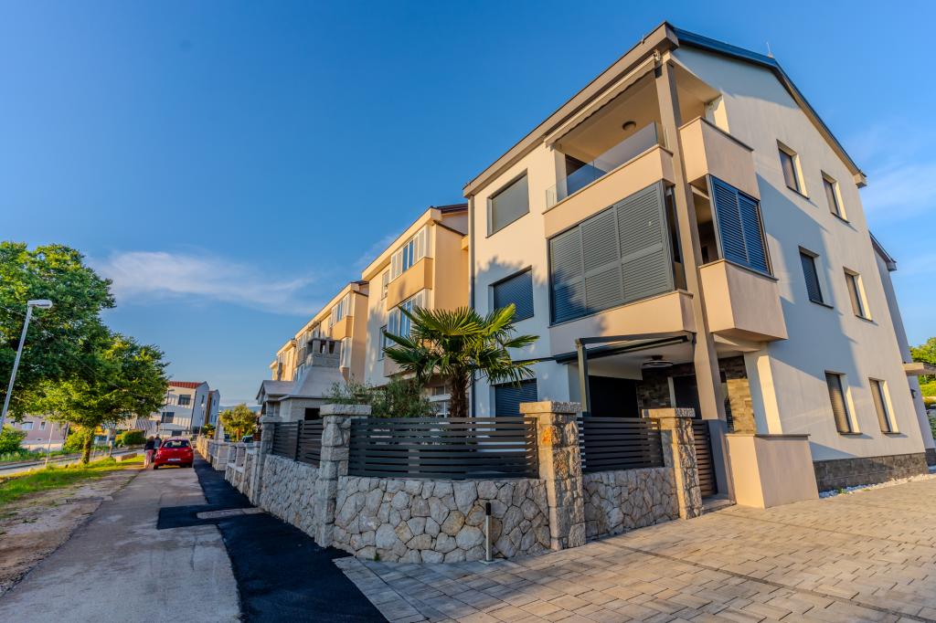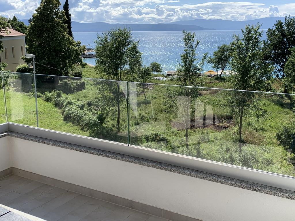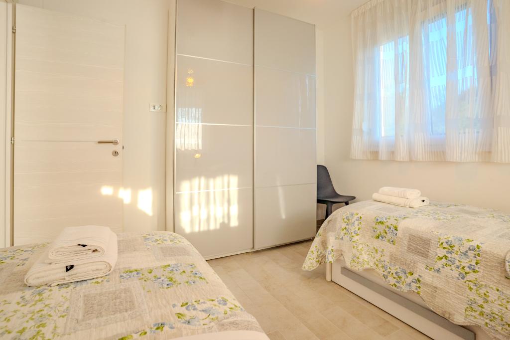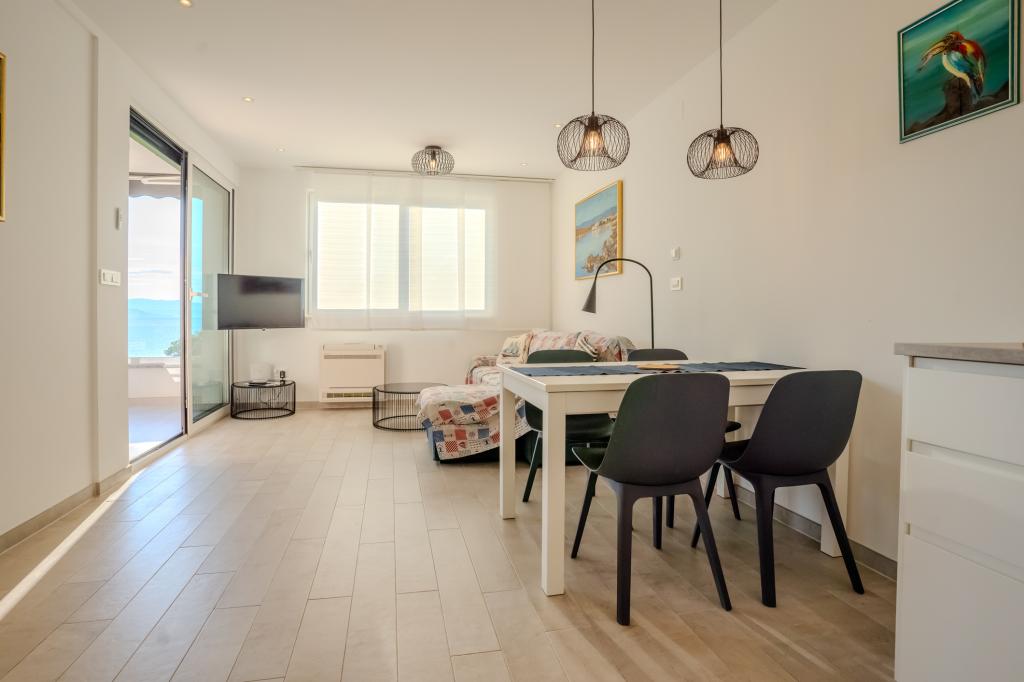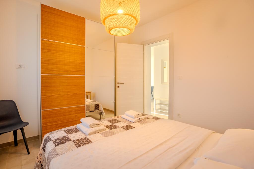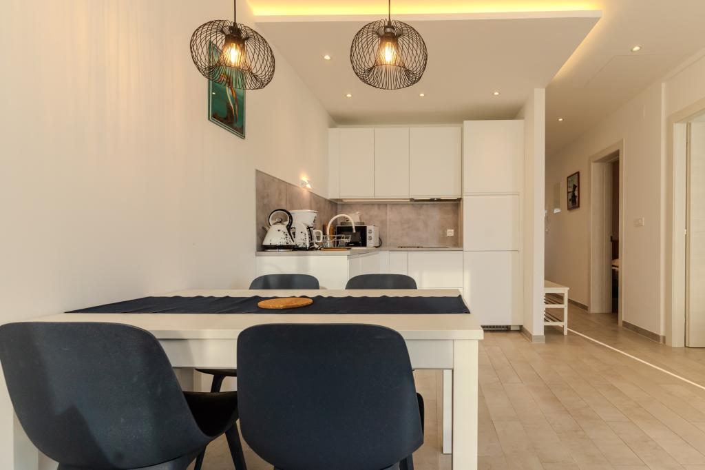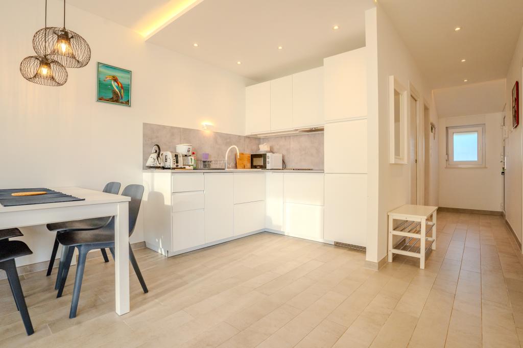 Apartament modern utilat, într-o zonă liniștită, situat în primul rând la mare. Proprietatea este situată la 2 minute de mers pe jos de plajă, magazine și centru. Apartamentul este nou și dotat cu mobilier nou. Are două dormitoare, o baie, un living cu bucătărie și sufragerie și o terasă acoperită. Suprafața totală este de 68 m2. Parcarea pentru trei mașini se află în curtea proprietății și este gratuită.
