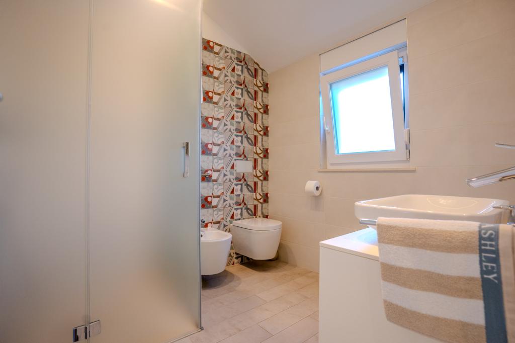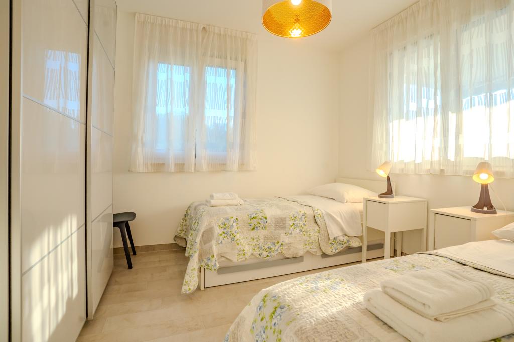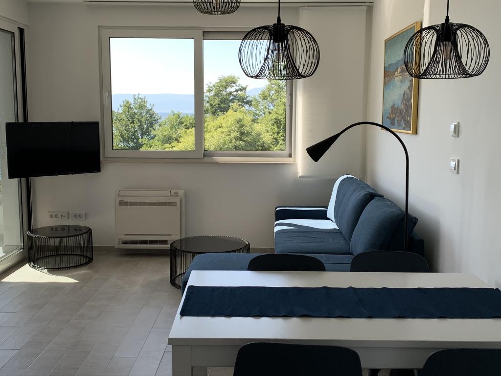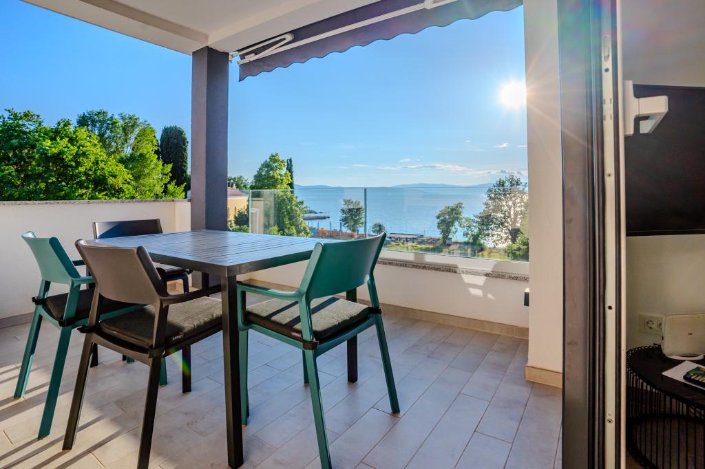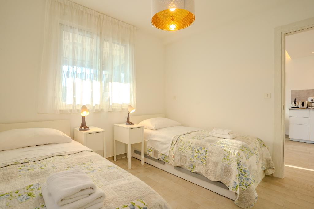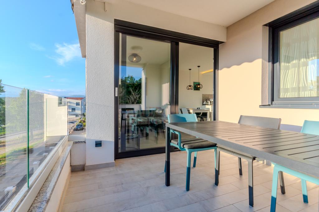 Apartament modern utilat, într-o zonă liniștită, situat în primul rând la mare. Proprietatea este situată la 2 minute de mers pe jos de plajă, magazine și centru. Apartamentul este nou și dotat cu mobilier nou. Are două dormitoare, o baie, un living cu bucătărie și sufragerie și o terasă acoperită. Suprafața totală este de 68 m2. Parcarea pentru trei mașini se află în curtea proprietății și este gratuită.