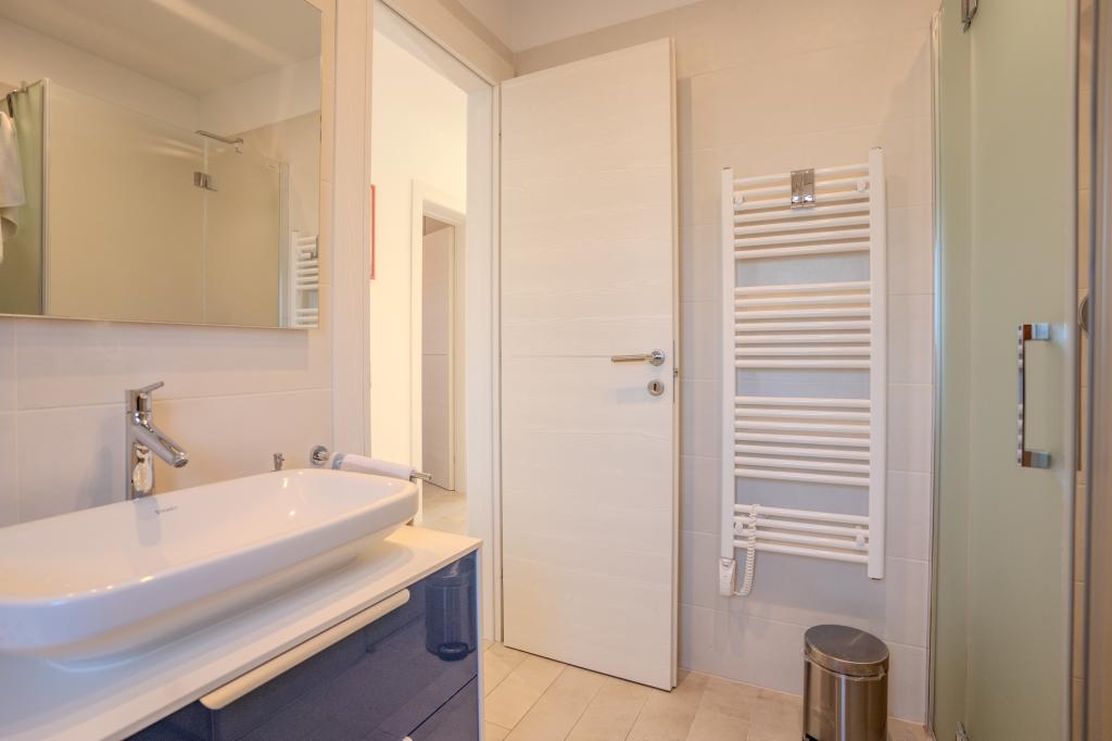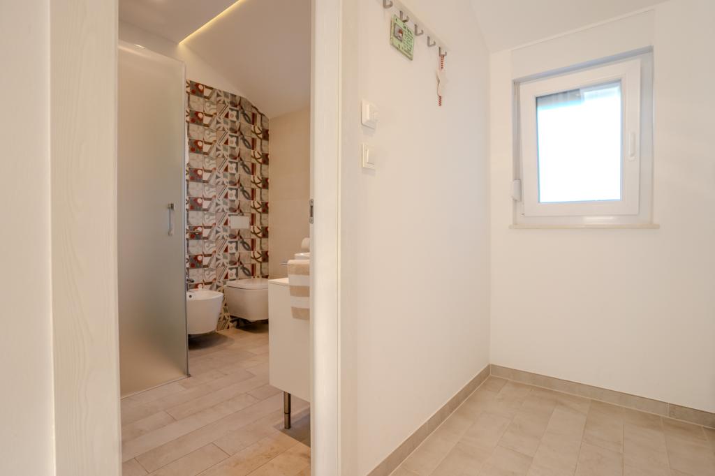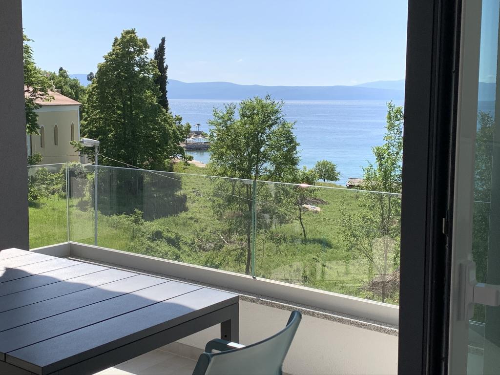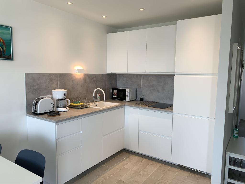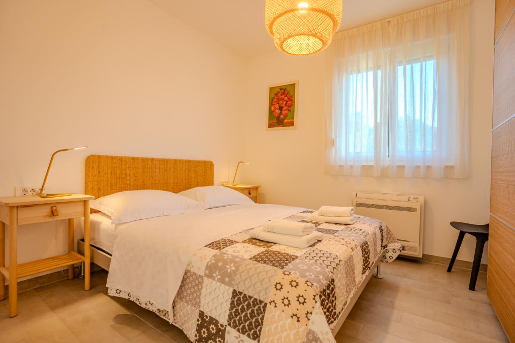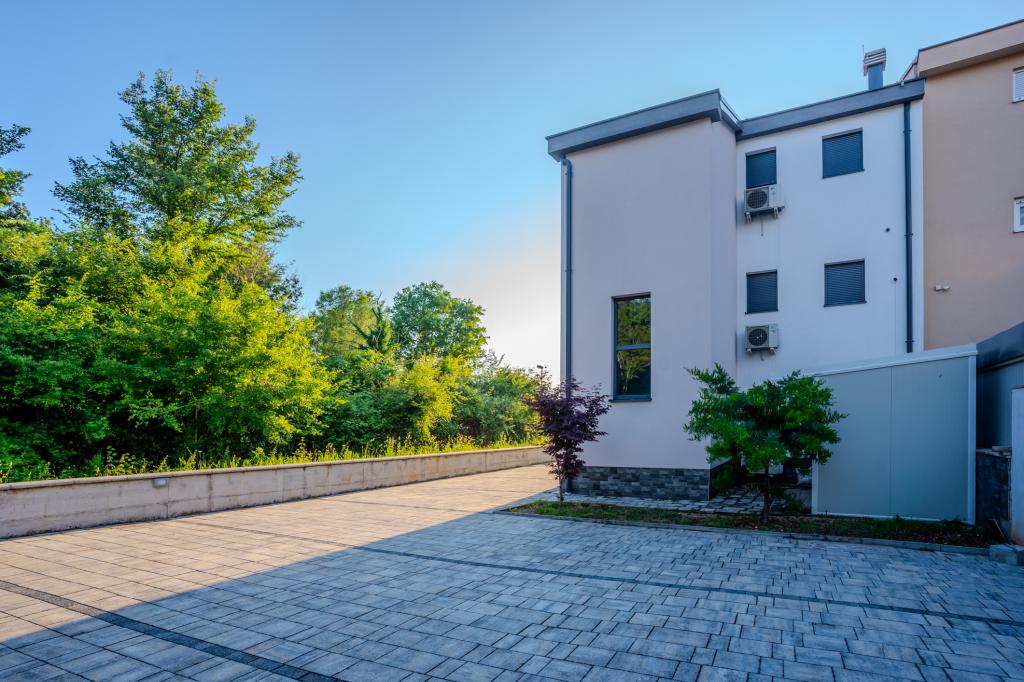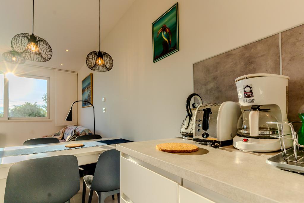 Apartament modern utilat, într-o zonă liniștită, situat în primul rând la mare. Proprietatea este situată la 2 minute de mers pe jos de plajă, magazine și centru. Apartamentul este nou și dotat cu mobilier nou. Are două dormitoare, o baie, un living cu bucătărie și sufragerie și o terasă acoperită. Suprafața totală este de 68 m2. Parcarea pentru trei mașini se află în curtea proprietății și este gratuită.