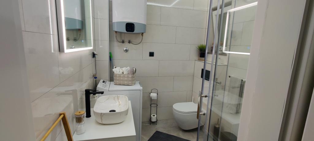 Apartament nou decorat în Novalja, pe insula Pag. Insula este conectată printr-un pod. Este situat la etajul 1 al unui bloc rezidential. Apartamentul dispune de loc de parcare. Apartamentul este dotat cu aer conditionat, WiFi gratuit, aparat de cafea Dolce Gusto, ceainic, seif.