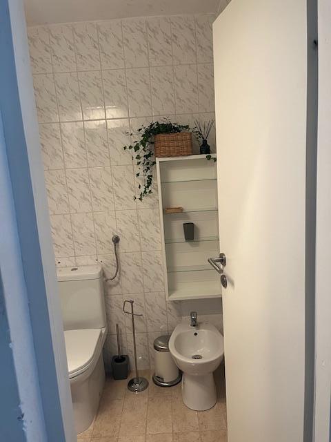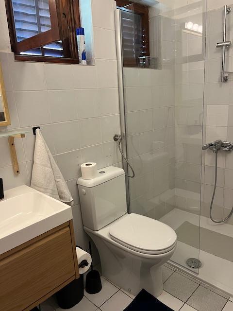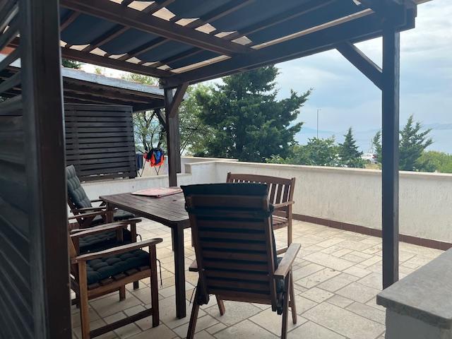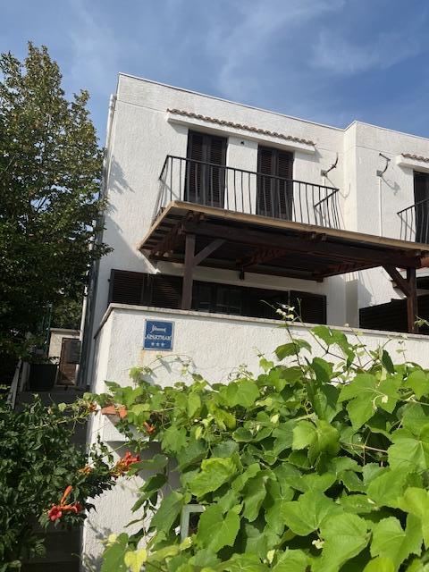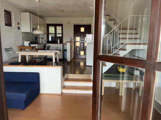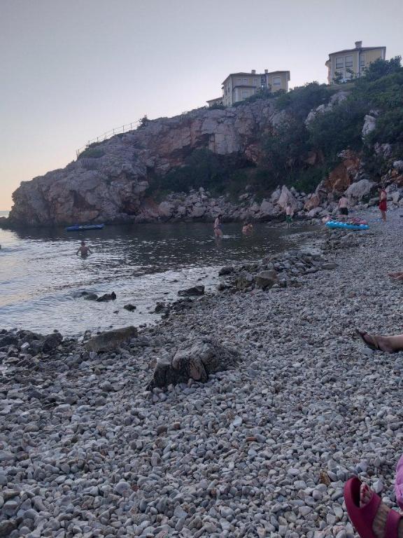 Apartament cu două etaje 70m2 + terasa mare 20m2 cu vedere la mare. La etaj se afla un living cu acces la terasa, o bucatarie si o toaleta. La etaj se află o baie cu toaletă și duș, trei dormitoare (două cu vedere la mare și un balcon). Intrare separata, intimitate. 3 minute jos pe scări până la plajă.