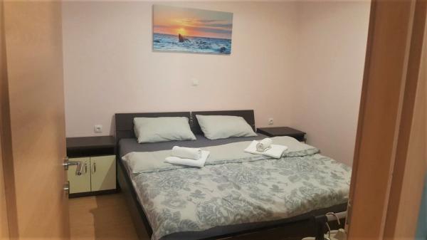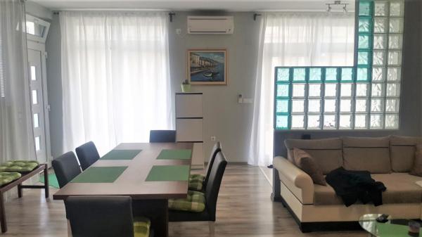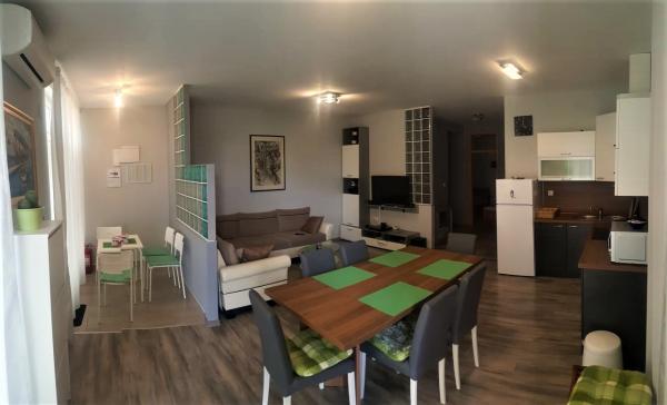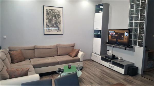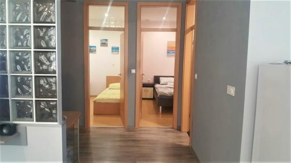 O băutură de bun venit este inclusă în preț. Apartamentul este climatizat și dotat cu un SMART TV și home cinema în living, conectat la WIFI, cu o bucătărie modernă. Spațiul conectat, fără pereți despărțitori, de 35 m2, format dintr-un living, bucătărie cu zonă de luat masa, loggie și hol, oferă confort pentru până la 6 persoane în același timp. Dormitorul este dotat cu un pat mare și un dulap pentru depozitarea hainelor, iar camera copiilor cu două paturi separate și un televizor. Setul din living, după ce este scos, oferă spațiu de dormit pentru două persoane. Baia are o mașină de spălat și un încălzitor și un încălzitor de apă instantaneu modern, care oferă posibilitatea de a face duș mai multor persoane la rând. Pe lângă toate acestea, există și o cameră de depozitare de 4 m2 pentru depozitarea lucrurilor suplimentare.
