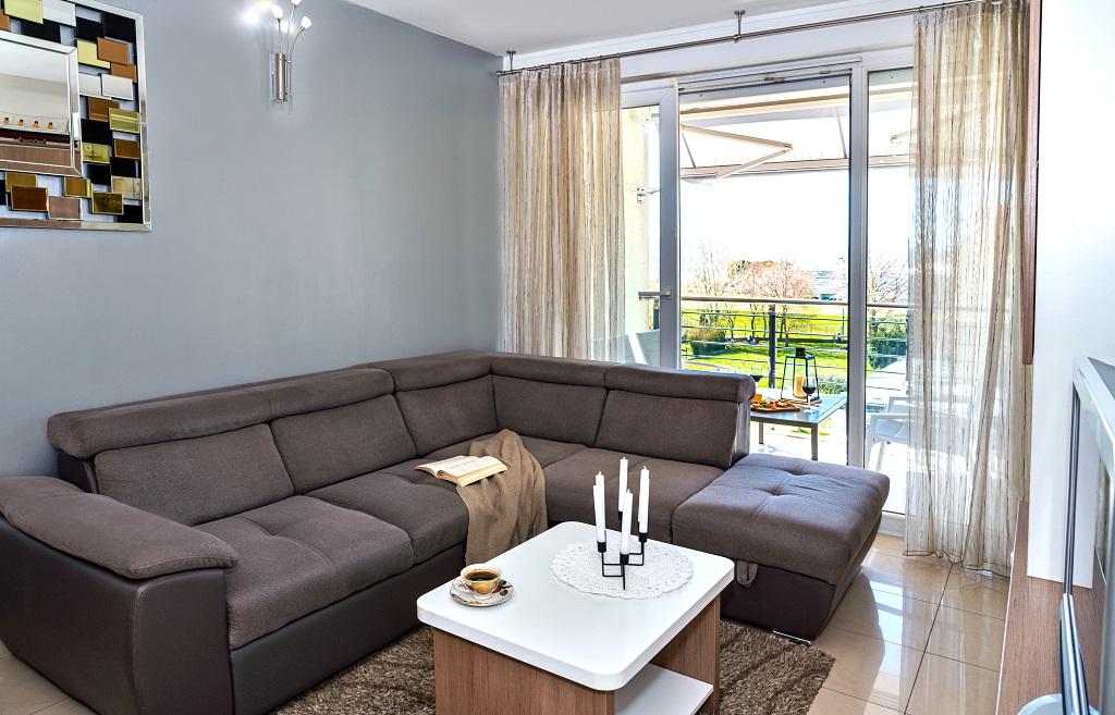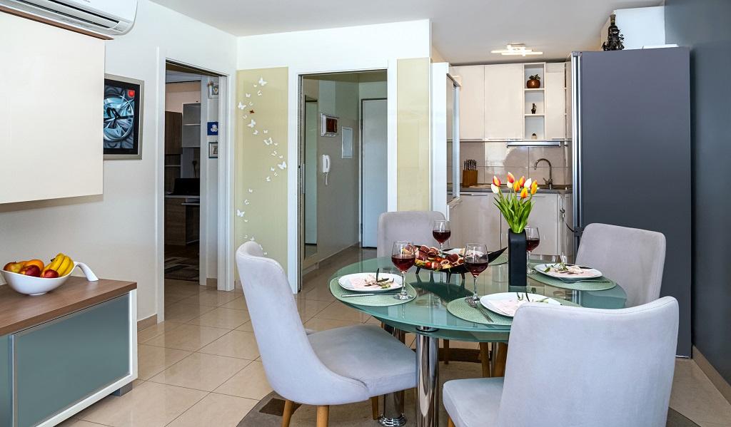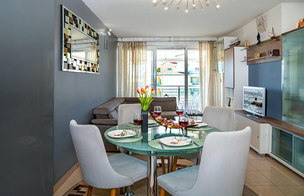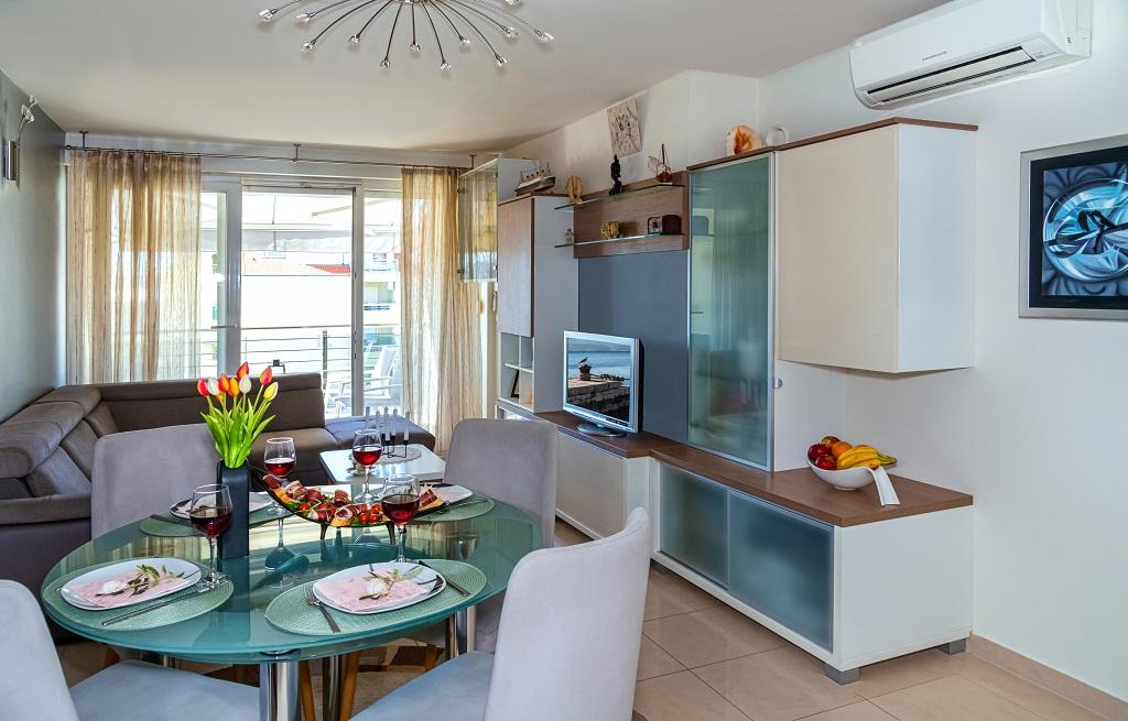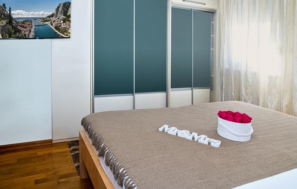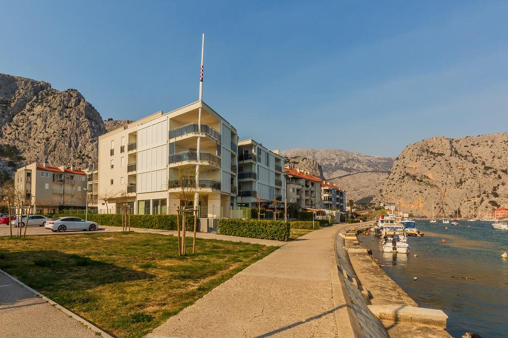 Un apartament nou, modern, în imediata apropiere a râului Cetina și a Mării Adriatice. Cu o suprafață de 65 m2, poate găzdui confortabil până la 4+1 persoane, iar balconul oferă vedere la râu și la estuarul Cetinei. Apartamentul este situat la etajul trei. Cladirea dispune de lift. Apartamentul este format din două dormitoare, o baie, o bucătărie bine utilată cu zonă de luat masa, un living și un balcon acoperit cu vedere la râu. Primul dormitor are un pat mare (180 x 200) pentru 2 persoane, noptiere si spatiu de depozitare pentru haine si bagaje. Al doilea dormitor are doua paturi (90 x 200) pentru 2 persoane, noptiere si spatiu de depozitare pentru haine si bagaje. Ambele dormitoare sunt luminoase și au multă lumină naturală prin luminator. Dormitoarele au aer conditionat. Este compus dintr-un living si o sufragerie intr-un singur spatiu, si o bucatarie foarte moderna, deschisa. Există, de asemenea, o bucătărie nouă cu electrocasnice de ultimă generație, inclusiv o plită electrică cu 4 arzătoare, cuptor electric, frigider congelator, ceainic și toată vesela necesară pentru self-catering. Chiar langa bucatarie este o sufragerie cu o masa pentru 4 persoane. Există, de asemenea, un living cu TV, o canapea extensibilă elegantă și o măsuță de cafea. Are TV si Wi-Fi. Racire si incalzire in living si bucatarie cu aer conditionat. Ușile glisante din sticlă din living se deschid direct spre balcon. Balconul are vedere panoramică la râu și la mare. Dacă veniți cu mașina, în jurul clădirii există o parcare publică. Apartamentul nostru este la 500 de metri de orașul Omiš, care este de fapt la doar 5 minute de mers pe jos de casa noastră. Plaja de nisip (500 de metri distanță) este la câteva minute de mers pe jos.