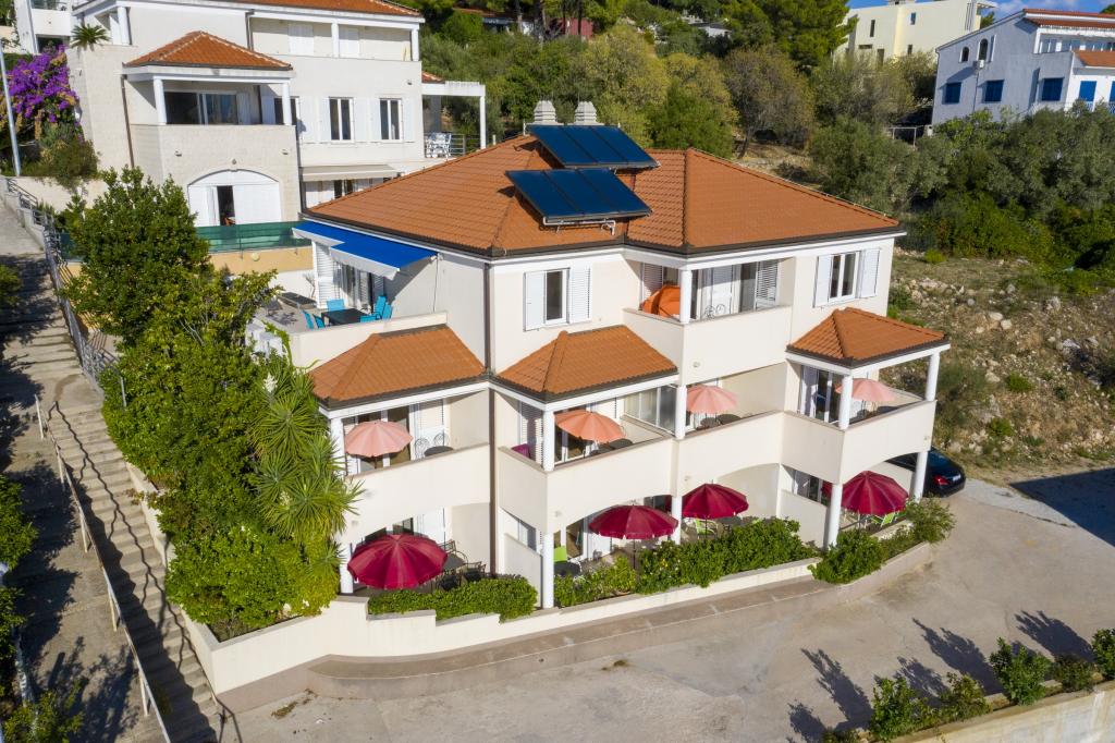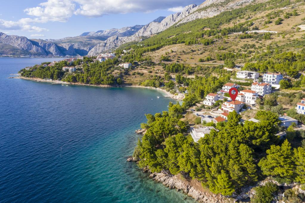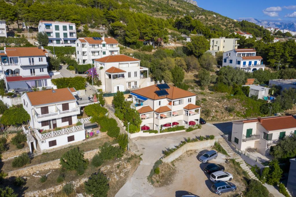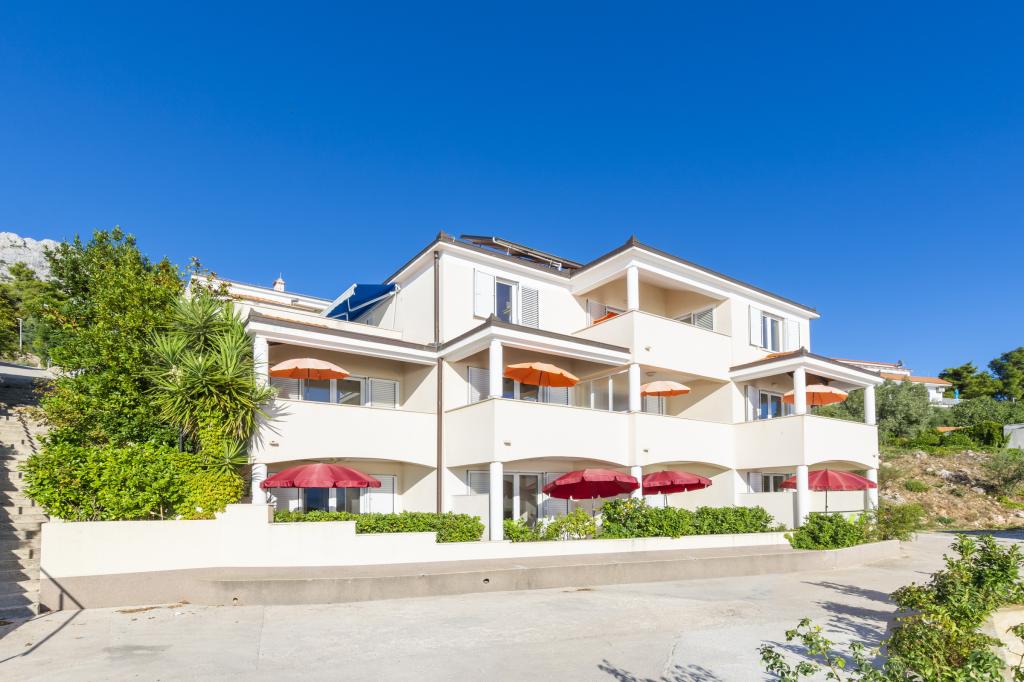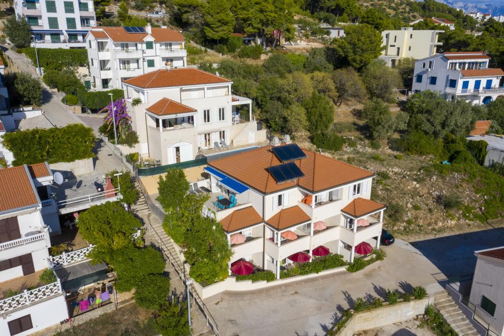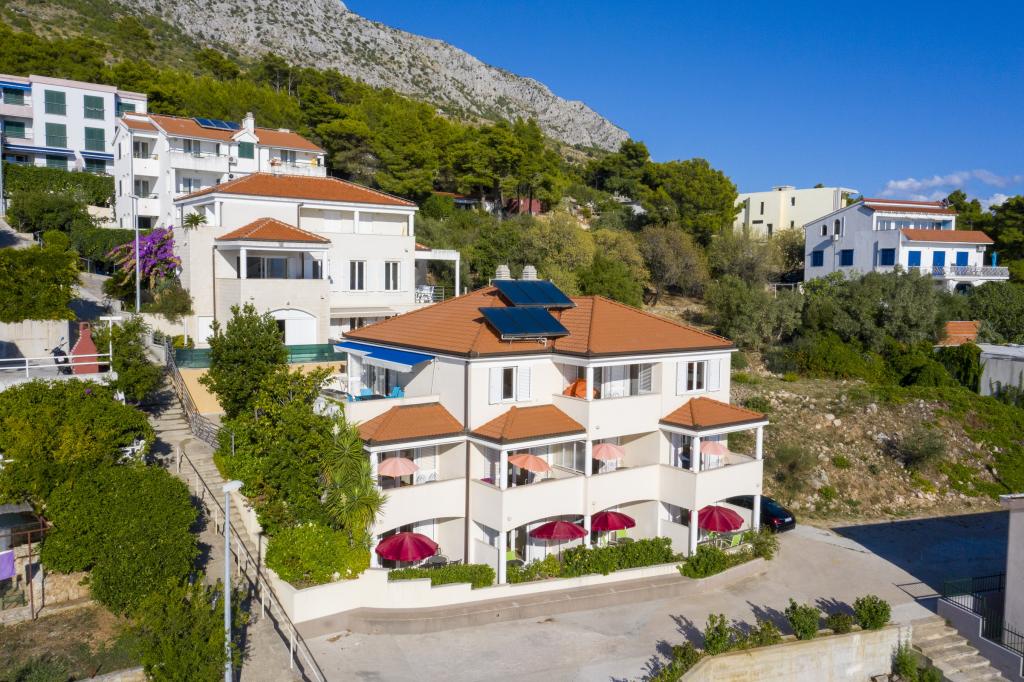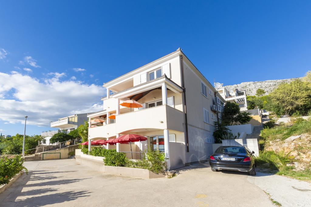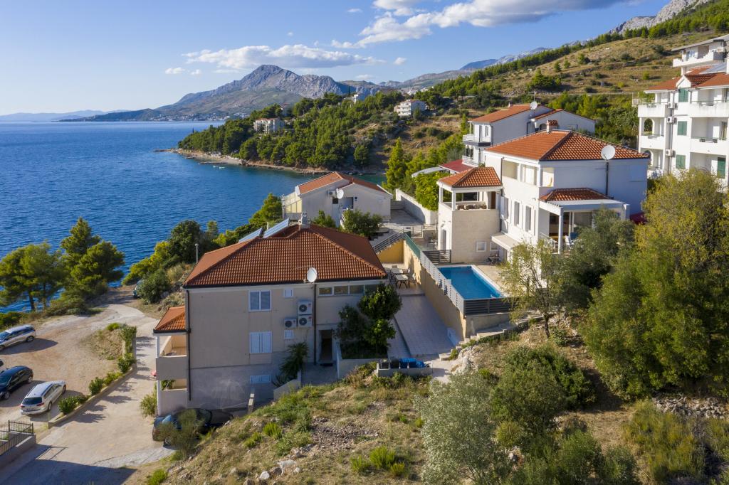Cazare în apartamente nou construite, extrem de confortabile și superb echipate. Facilitatea este situată la 3 km de centrul orașului Omiš. Un total de opt apartamente, situate în primul rând la mare. Toate apartamentele au terase mari cu vedere la mare și la insula Brač. Locuri de parcare chiar lângă vilă. Apartamentele sunt situate sub drumul principal (300 de metri), chiar lângă mare și o plajă mare cu pietriș. Există patru tipuri de apartamente: -- tip 2+2 cu un dormitor dublu separat și un living cu două paturi, -- apartamente tip 2+2 studio mare, -- apartamente luxoase mari, tip 4+2, cu două dormitoare duble și un living mare cu două paturi extensibile și -- apartament de lux mare, tip 14+2, în realitate o vilă pe trei etaje, cu o suprafață de 300 m2, cu o piscină de 9x4 metri cu apă încălzită, cu șapte dormitoare duble, două livinguri mari cu balcoane și terase, patru băi, toaletă separată, grătar în aer liber, saună și sală de sport etc. Piscina este utilizată exclusiv de apartamentul A 14+2. Celelalte apartamente nu.
