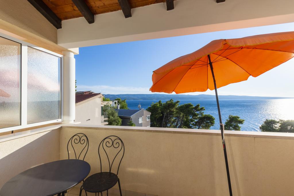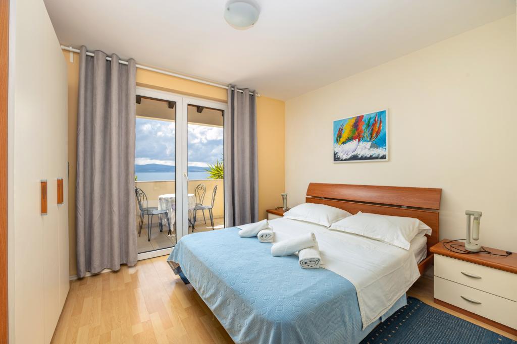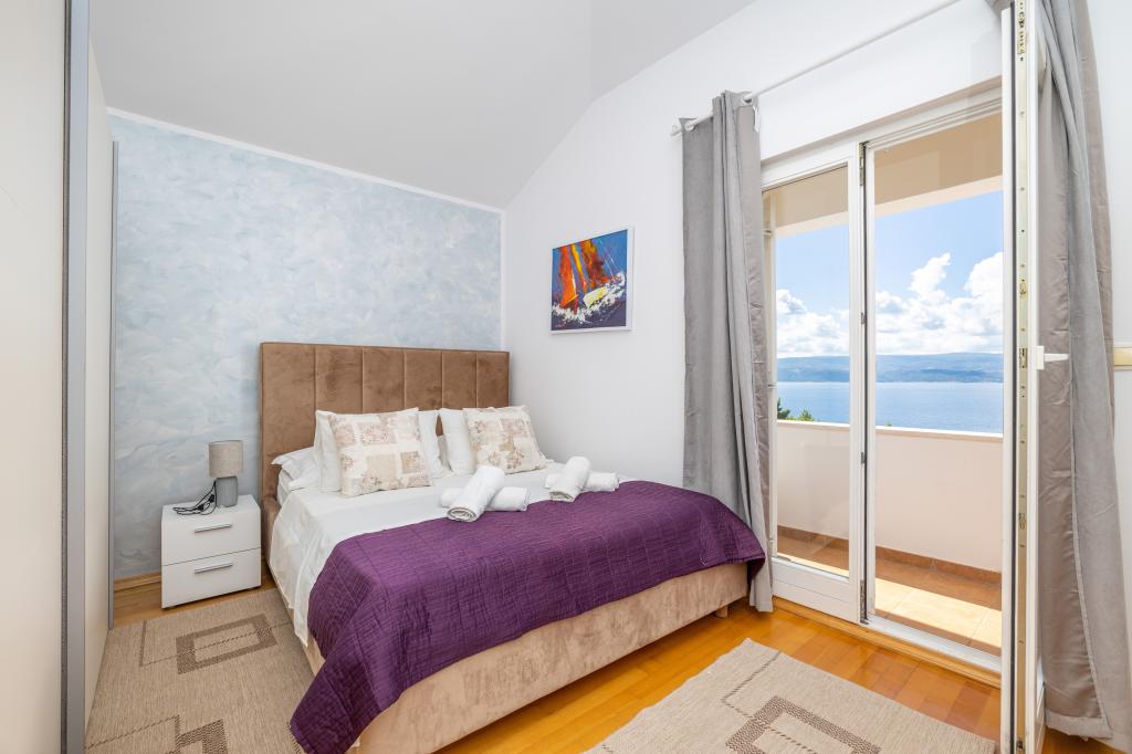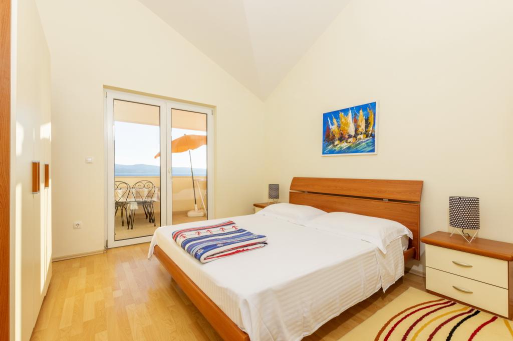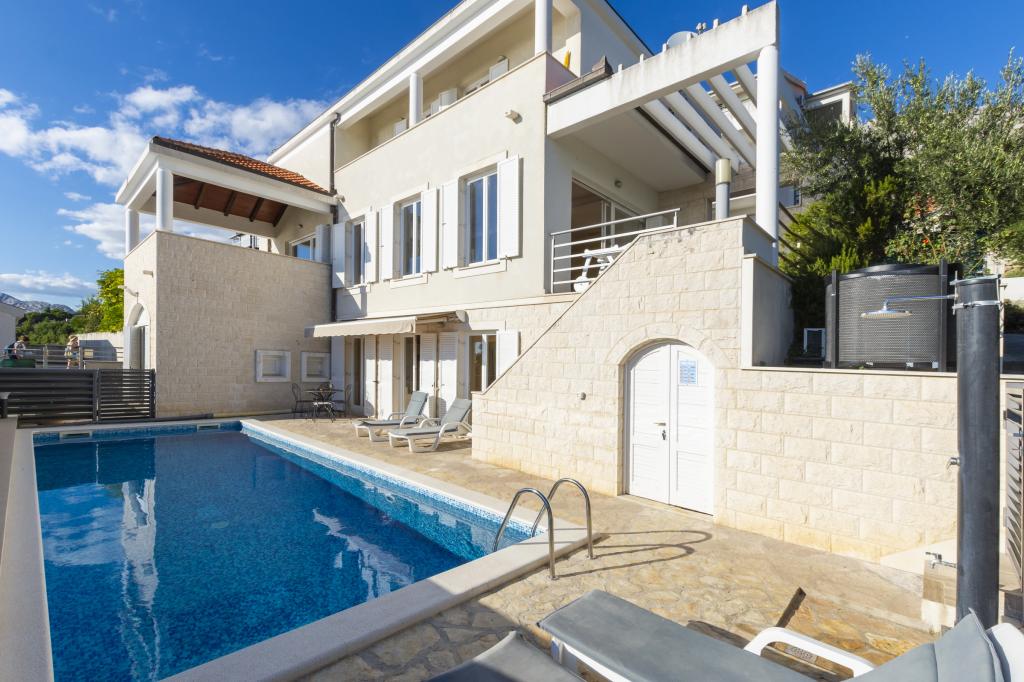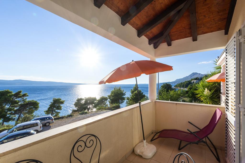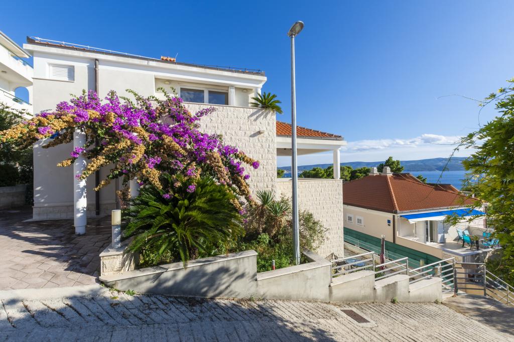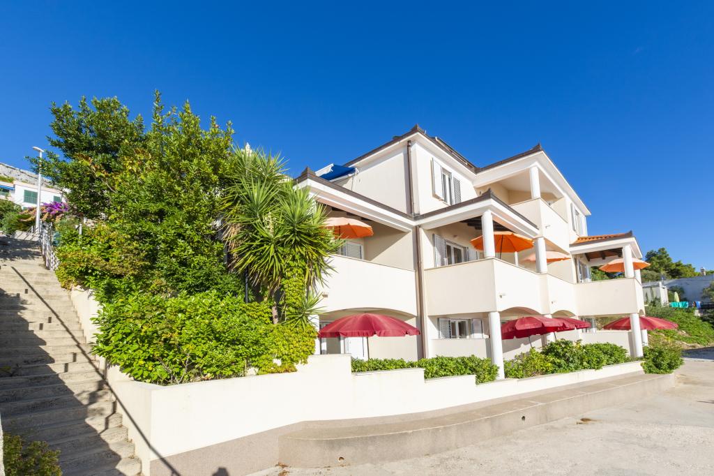 Cazare în apartamente nou construite, extrem de confortabile și superb echipate. Facilitatea este situată la 3 km de centrul orașului Omiš. Un total de opt apartamente, situate în primul rând la mare. Toate apartamentele au terase mari cu vedere la mare și la insula Brač. Locuri de parcare chiar lângă vilă. Apartamentele sunt situate sub drumul principal (300 de metri), chiar lângă mare și o plajă mare cu pietriș. Există patru tipuri de apartamente: -- tip 2+2 cu un dormitor dublu separat și un living cu două paturi, -- apartamente tip 2+2 studio mare, -- apartamente luxoase mari, tip 4+2, cu două dormitoare duble și un living mare cu două paturi extensibile și -- apartament de lux mare, tip 14+2, în realitate o vilă pe trei etaje, cu o suprafață de 300 m2, cu o piscină de 9x4 metri cu apă încălzită, cu șapte dormitoare duble, două livinguri mari cu balcoane și terase, patru băi, toaletă separată, grătar în aer liber, saună și sală de sport etc. Piscina este utilizată exclusiv de apartamentul A 14+2. Celelalte apartamente nu.
