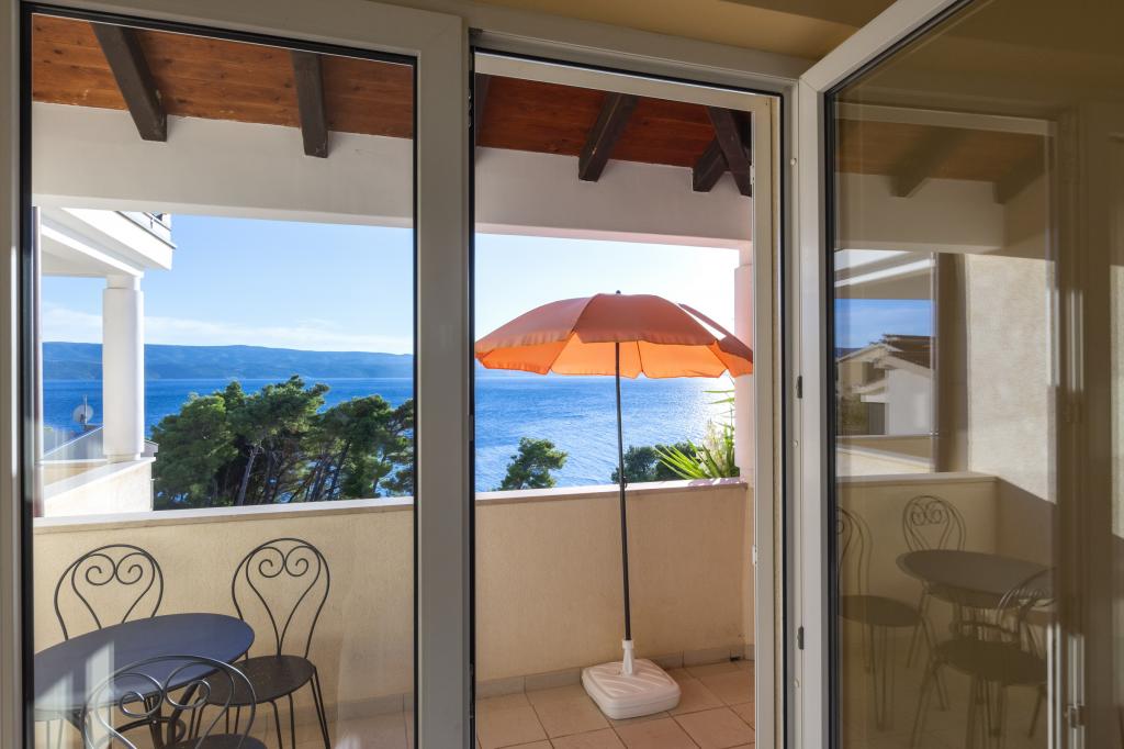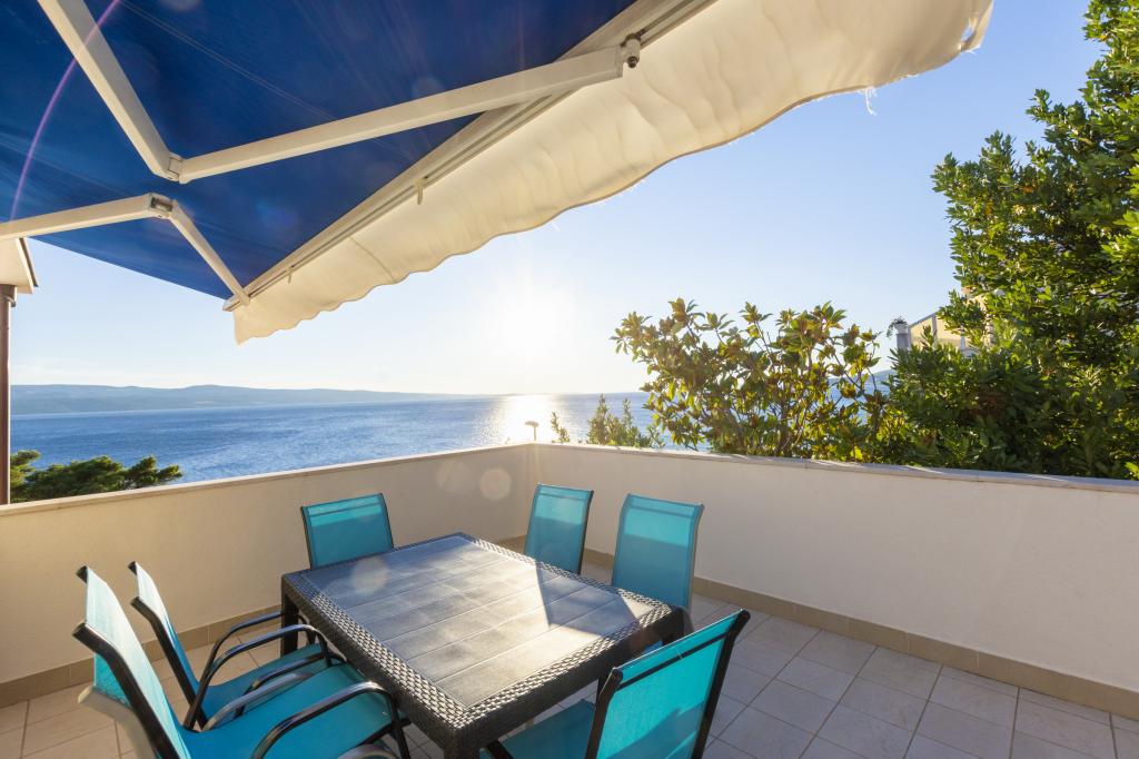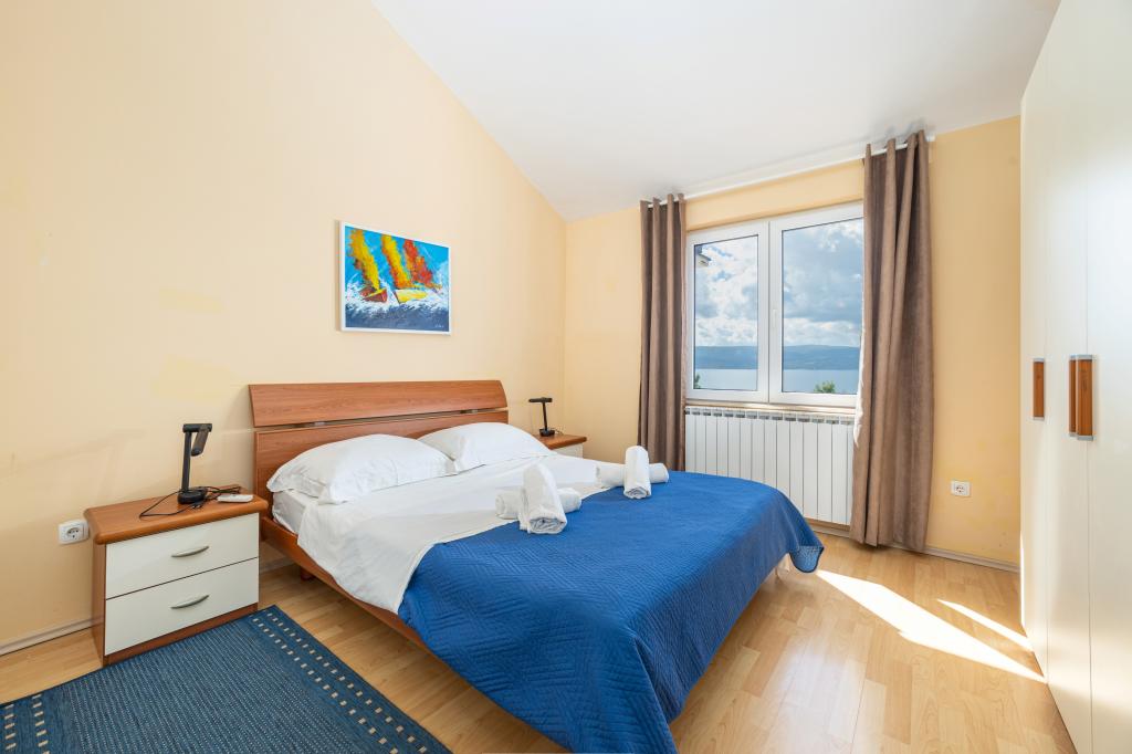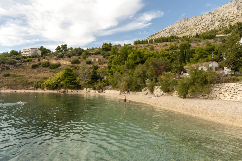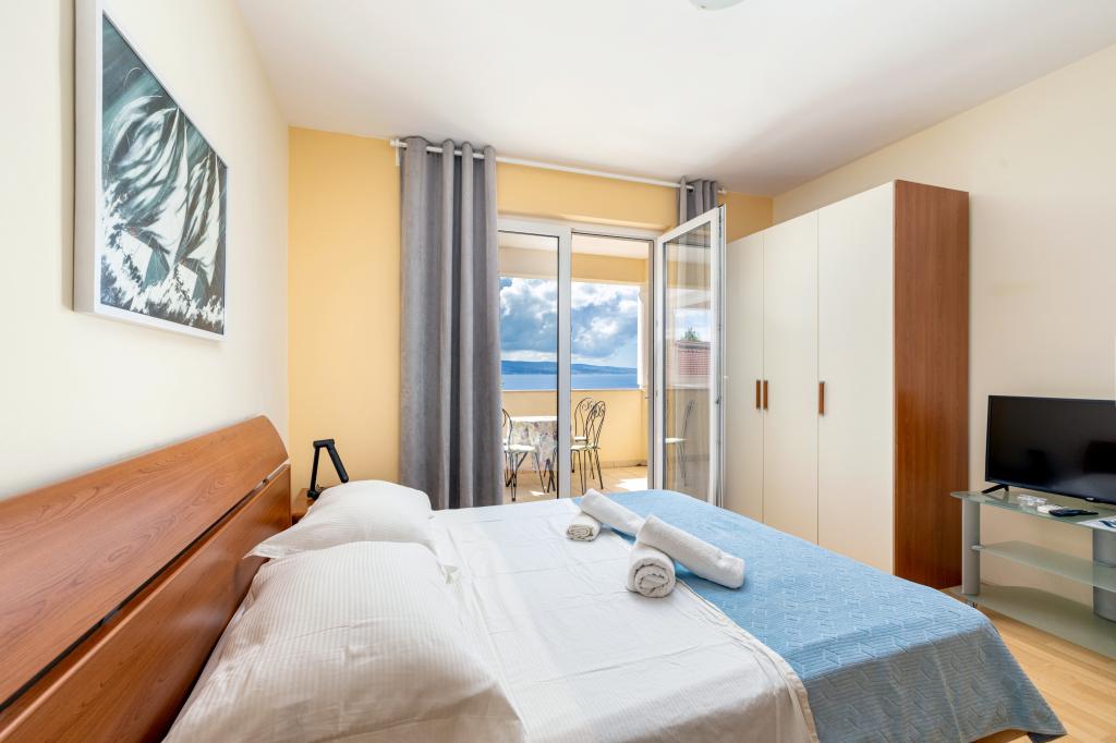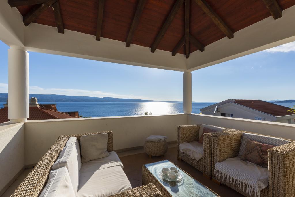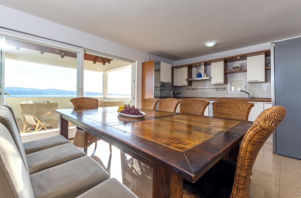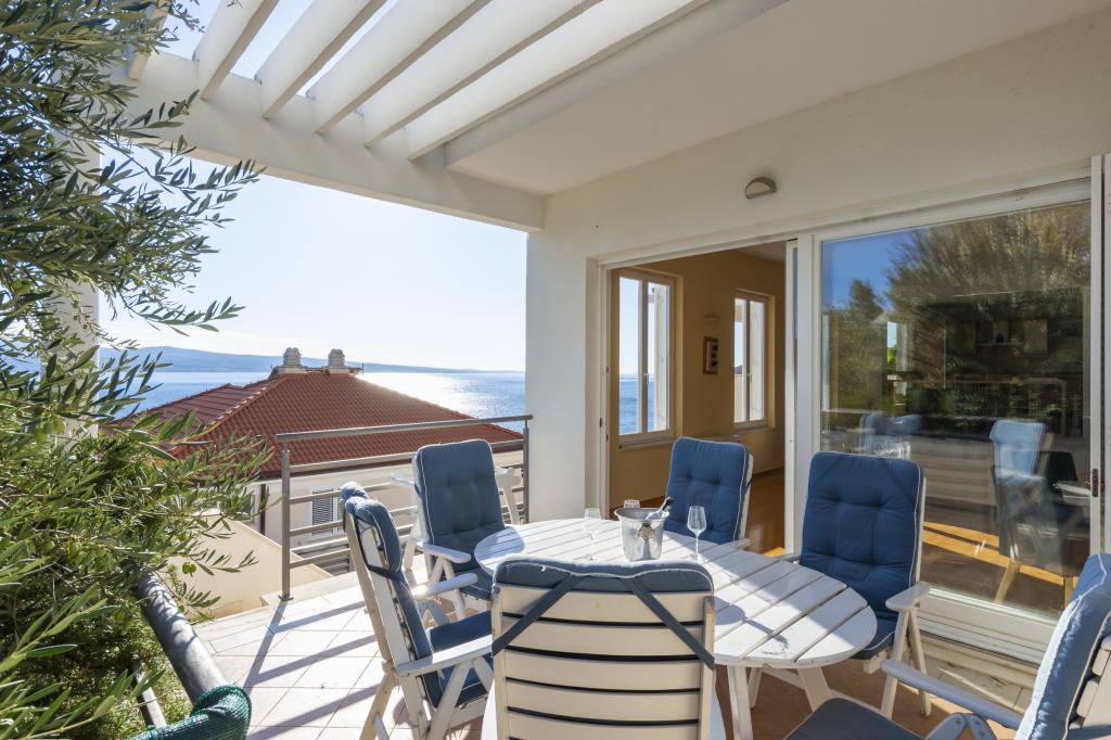 Cazare în apartamente nou construite, extrem de confortabile și superb echipate. Facilitatea este situată la 3 km de centrul orașului Omiš. Un total de opt apartamente, situate în primul rând la mare. Toate apartamentele au terase mari cu vedere la mare și la insula Brač. Locuri de parcare chiar lângă vilă. Apartamentele sunt situate sub drumul principal (300 de metri), chiar lângă mare și o plajă mare cu pietriș. Există patru tipuri de apartamente: -- tip 2+2 cu un dormitor dublu separat și un living cu două paturi, -- apartamente tip 2+2 studio mare, -- apartamente luxoase mari, tip 4+2, cu două dormitoare duble și un living mare cu două paturi extensibile și -- apartament de lux mare, tip 14+2, în realitate o vilă pe trei etaje, cu o suprafață de 300 m2, cu o piscină de 9x4 metri cu apă încălzită, cu șapte dormitoare duble, două livinguri mari cu balcoane și terase, patru băi, toaletă separată, grătar în aer liber, saună și sală de sport etc. Piscina este utilizată exclusiv de apartamentul A 14+2. Celelalte apartamente nu.
