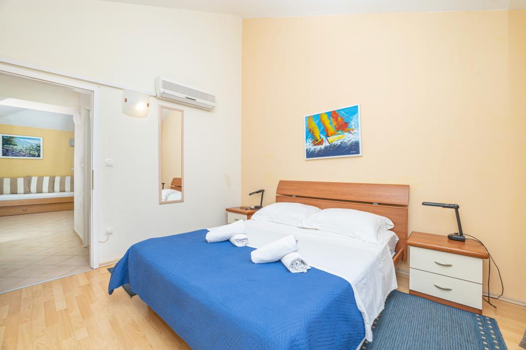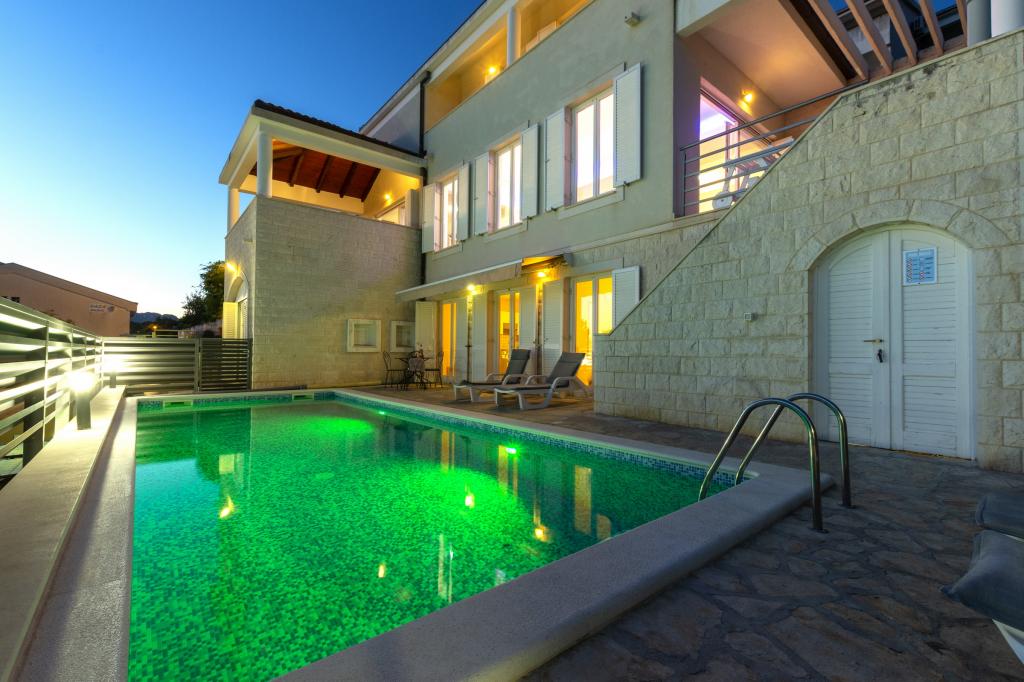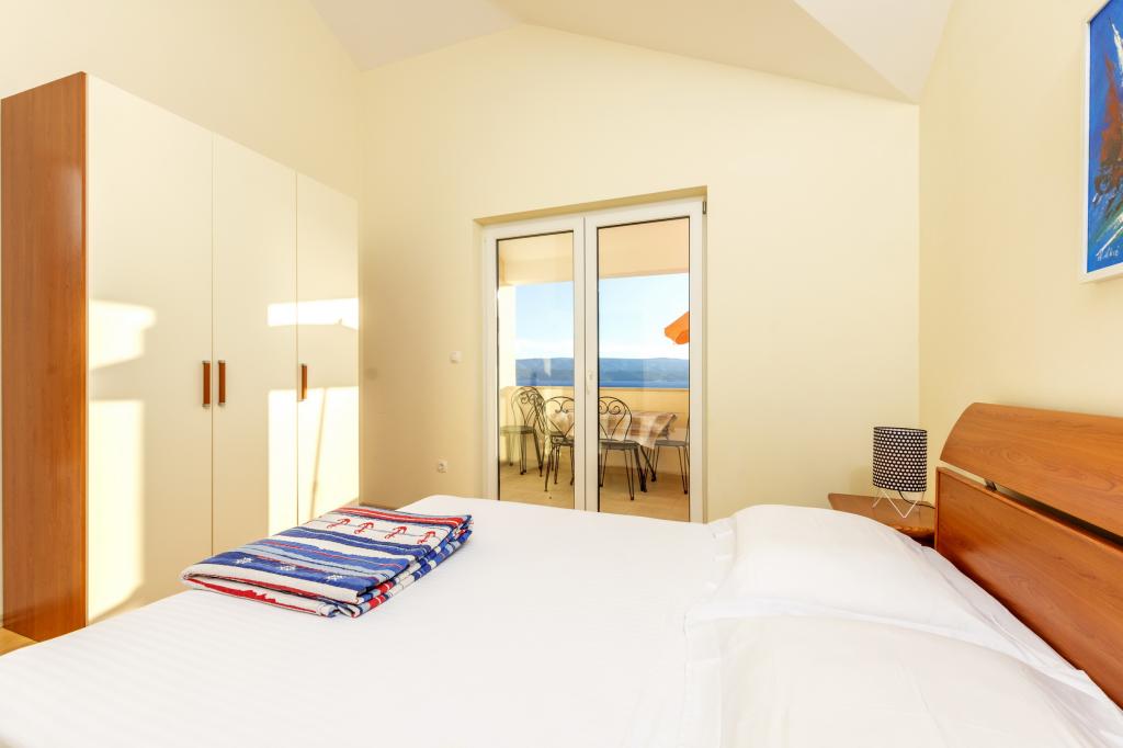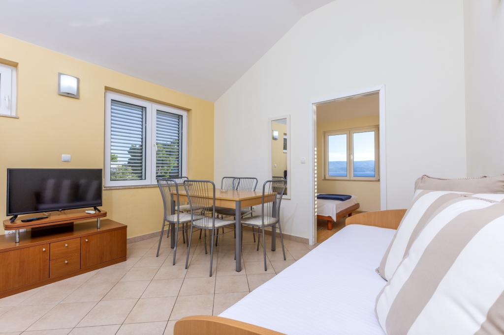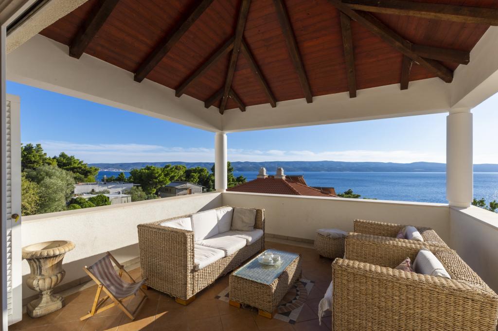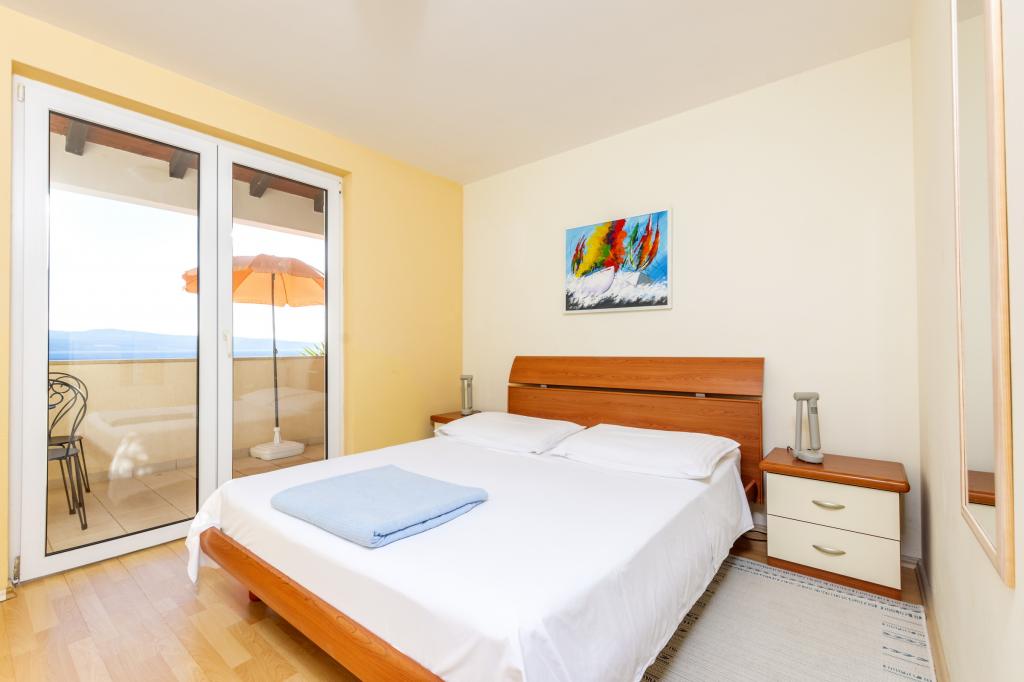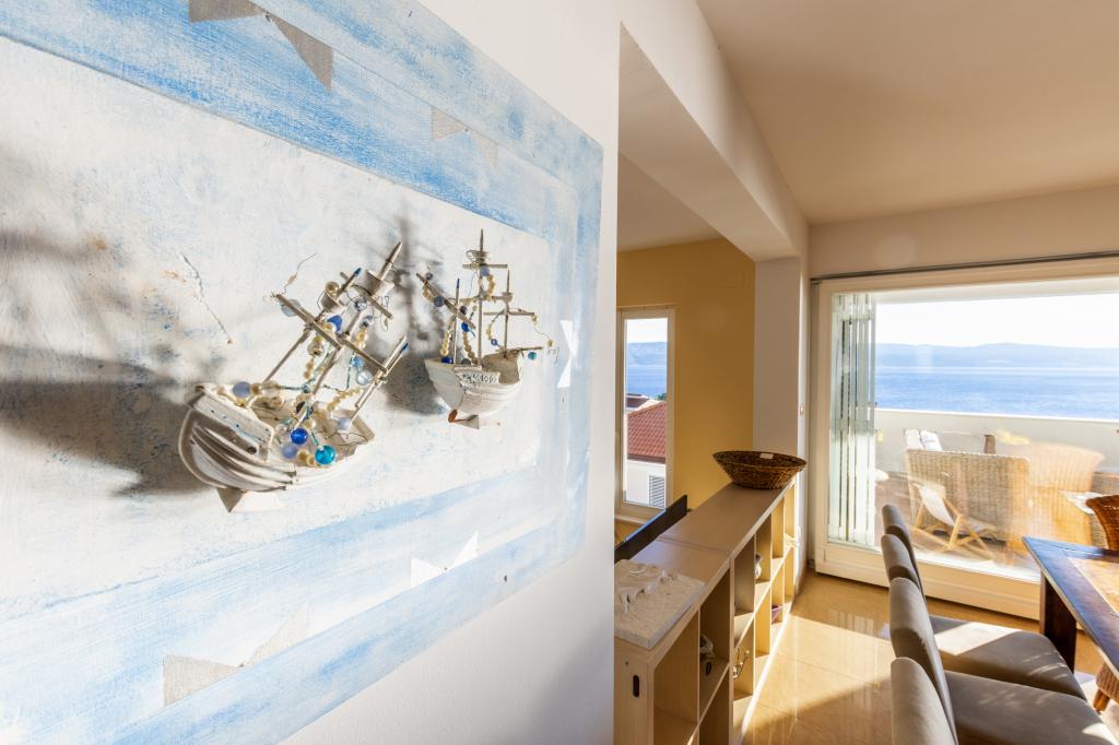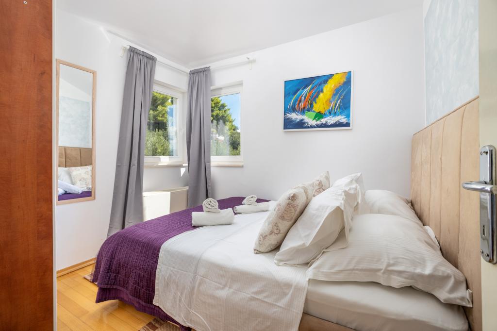 Cazare în apartamente nou construite, extrem de confortabile și superb echipate. Facilitatea este situată la 3 km de centrul orașului Omiš. Un total de opt apartamente, situate în primul rând la mare. Toate apartamentele au terase mari cu vedere la mare și la insula Brač. Locuri de parcare chiar lângă vilă. Apartamentele sunt situate sub drumul principal (300 de metri), chiar lângă mare și o plajă mare cu pietriș. Există patru tipuri de apartamente: -- tip 2+2 cu un dormitor dublu separat și un living cu două paturi, -- apartamente tip 2+2 studio mare, -- apartamente luxoase mari, tip 4+2, cu două dormitoare duble și un living mare cu două paturi extensibile și -- apartament de lux mare, tip 14+2, în realitate o vilă pe trei etaje, cu o suprafață de 300 m2, cu o piscină de 9x4 metri cu apă încălzită, cu șapte dormitoare duble, două livinguri mari cu balcoane și terase, patru băi, toaletă separată, grătar în aer liber, saună și sală de sport etc. Piscina este utilizată exclusiv de apartamentul A 14+2. Celelalte apartamente nu.