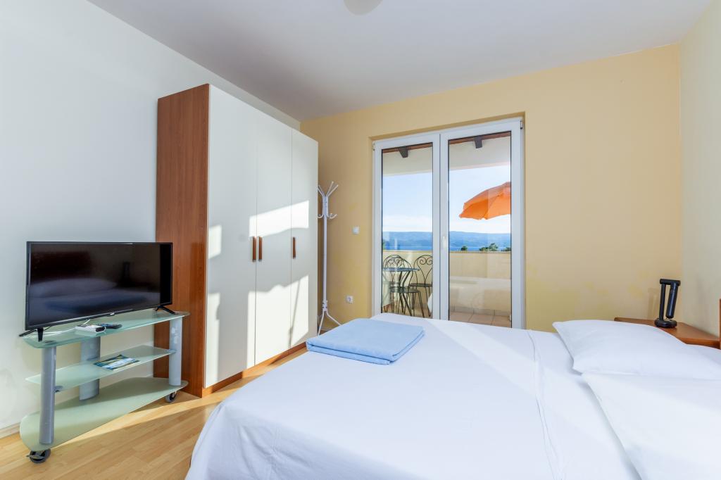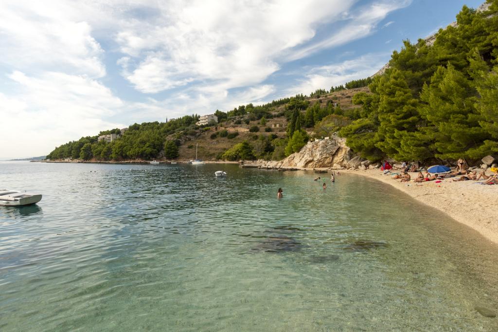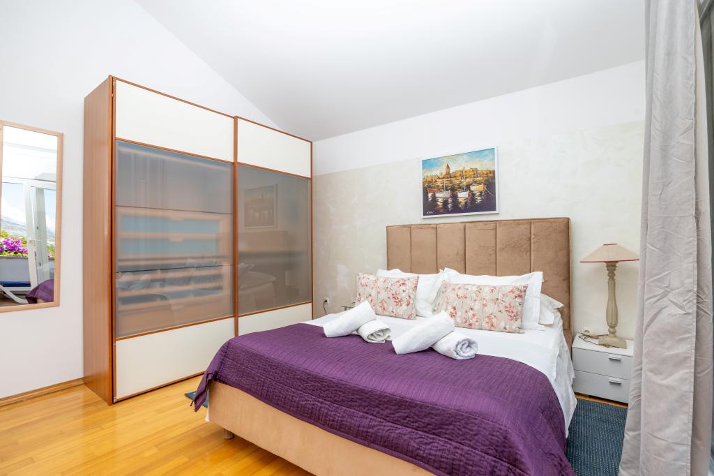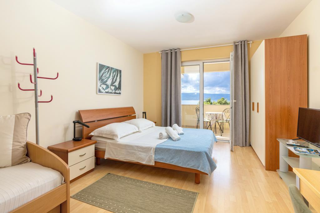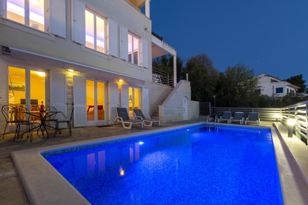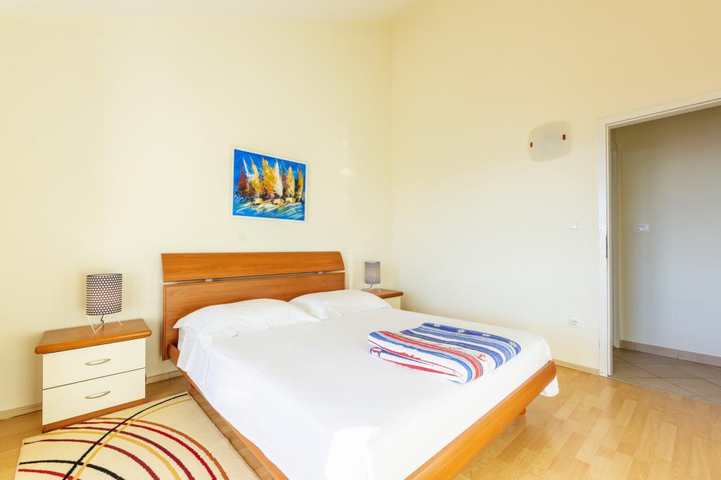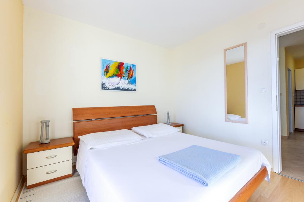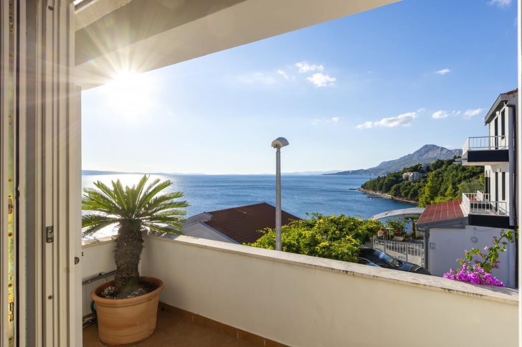 Cazare în apartamente nou construite, extrem de confortabile și superb echipate. Facilitatea este situată la 3 km de centrul orașului Omiš. Un total de opt apartamente, situate în primul rând la mare. Toate apartamentele au terase mari cu vedere la mare și la insula Brač. Locuri de parcare chiar lângă vilă. Apartamentele sunt situate sub drumul principal (300 de metri), chiar lângă mare și o plajă mare cu pietriș. Există patru tipuri de apartamente: -- tip 2+2 cu un dormitor dublu separat și un living cu două paturi, -- apartamente tip 2+2 studio mare, -- apartamente luxoase mari, tip 4+2, cu două dormitoare duble și un living mare cu două paturi extensibile și -- apartament de lux mare, tip 14+2, în realitate o vilă pe trei etaje, cu o suprafață de 300 m2, cu o piscină de 9x4 metri cu apă încălzită, cu șapte dormitoare duble, două livinguri mari cu balcoane și terase, patru băi, toaletă separată, grătar în aer liber, saună și sală de sport etc. Piscina este utilizată exclusiv de apartamentul A 14+2. Celelalte apartamente nu.