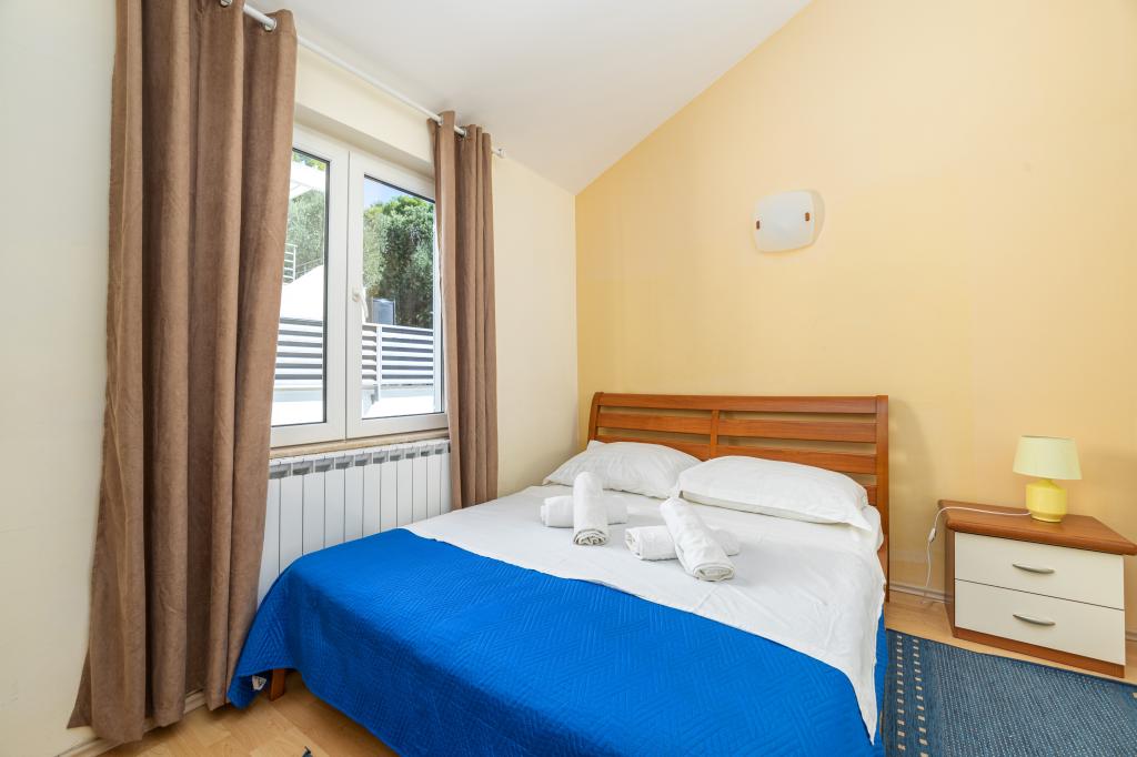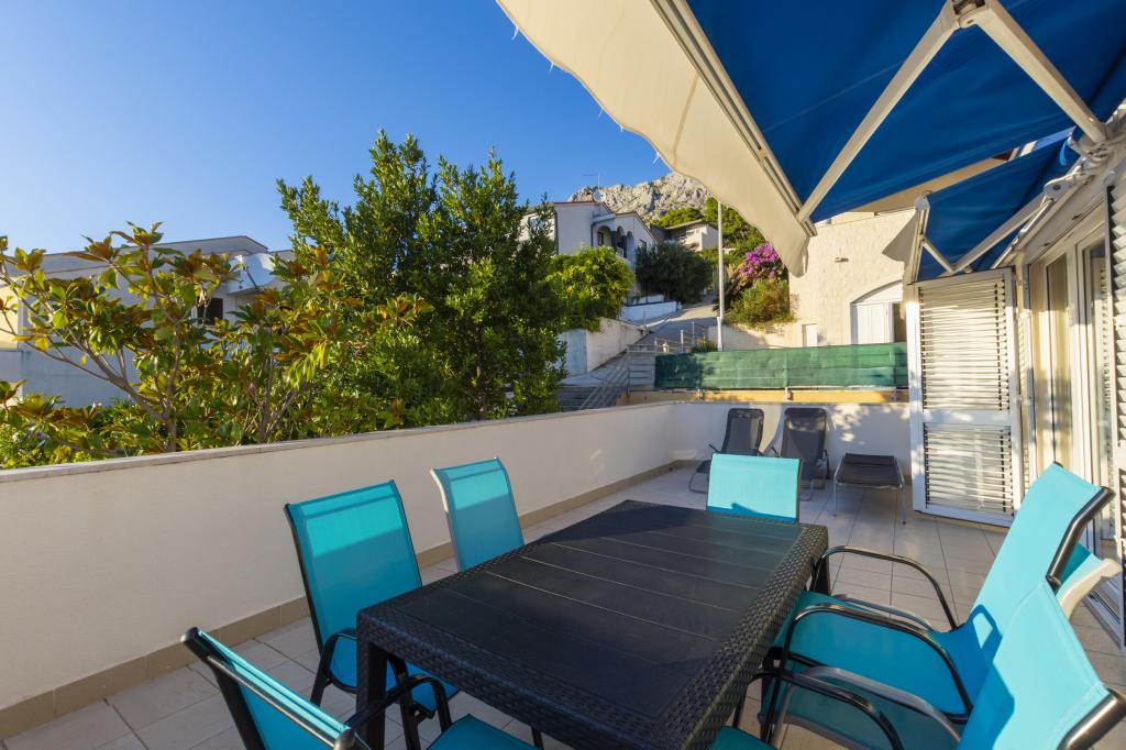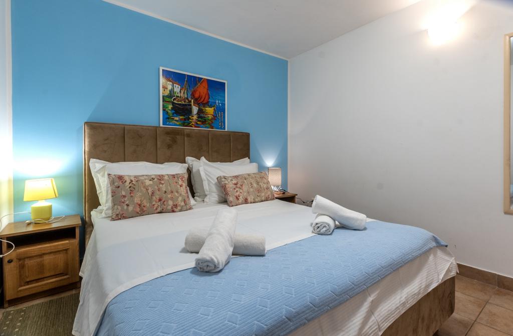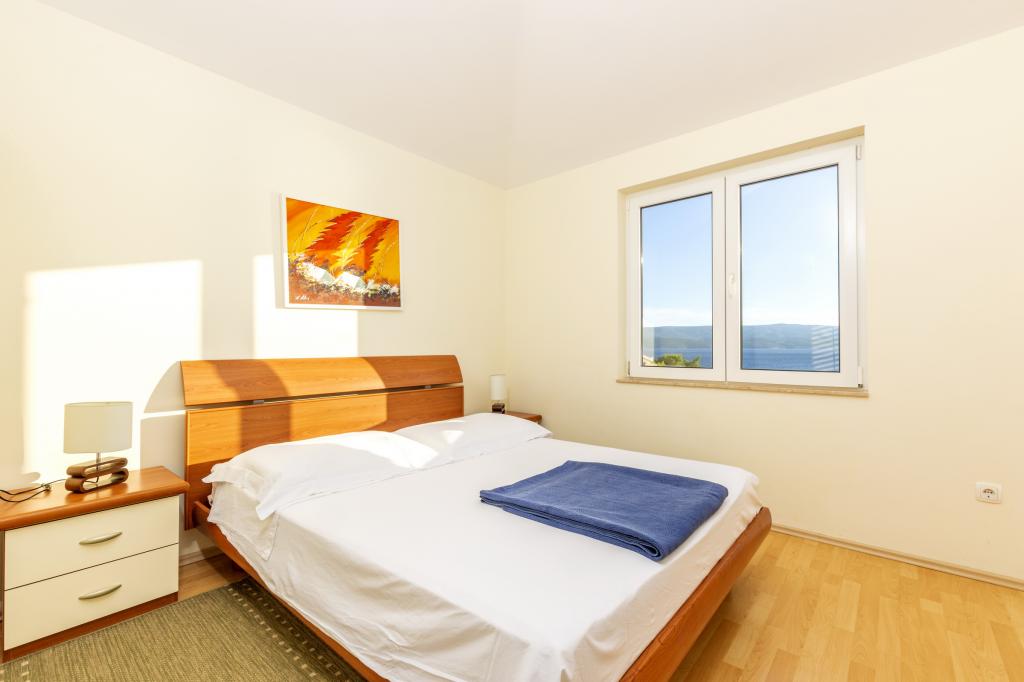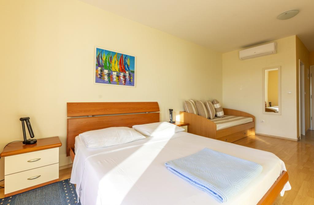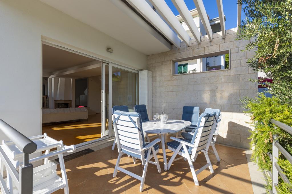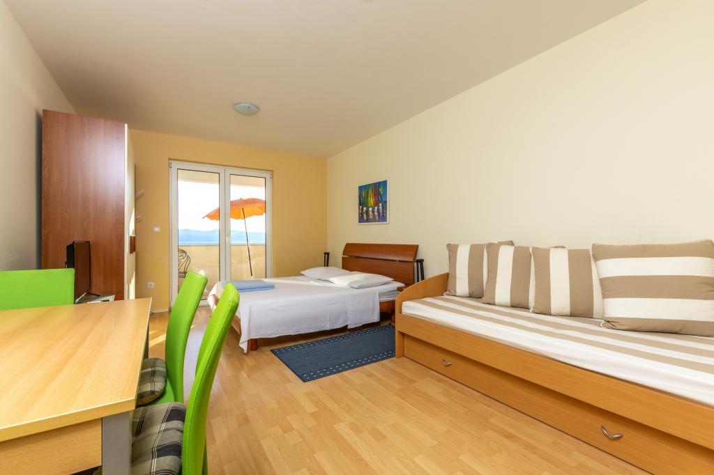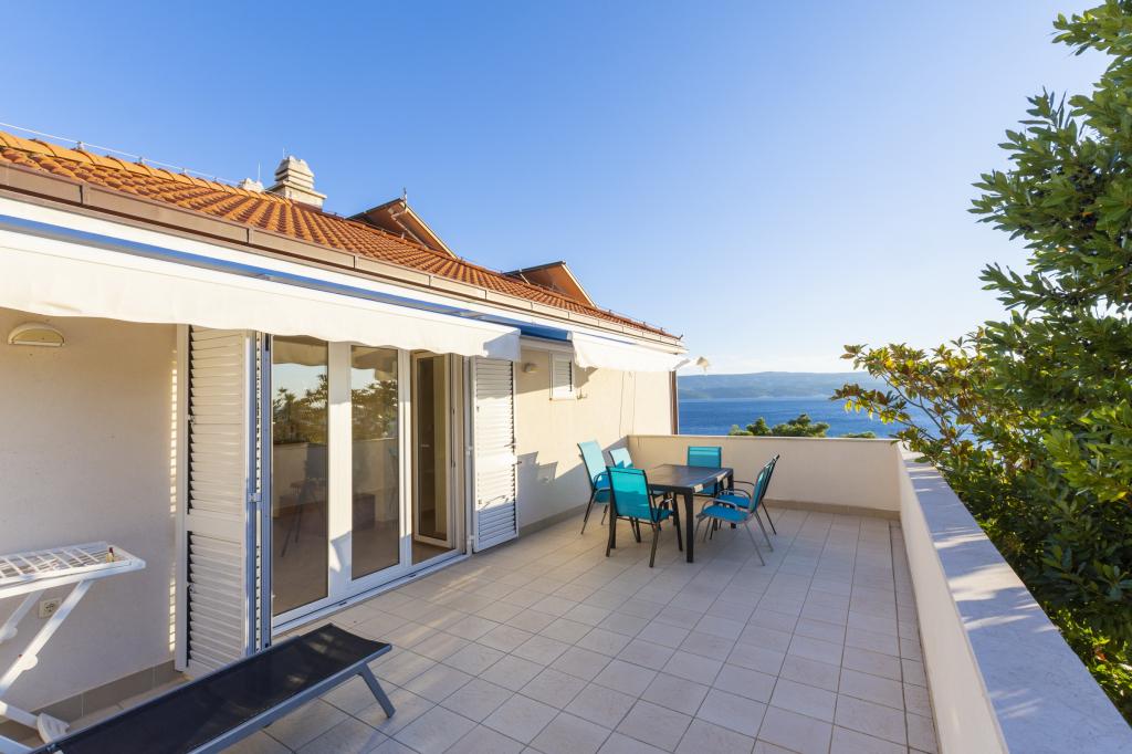 Cazare în apartamente nou construite, extrem de confortabile și superb echipate. Facilitatea este situată la 3 km de centrul orașului Omiš. Un total de opt apartamente, situate în primul rând la mare. Toate apartamentele au terase mari cu vedere la mare și la insula Brač. Locuri de parcare chiar lângă vilă. Apartamentele sunt situate sub drumul principal (300 de metri), chiar lângă mare și o plajă mare cu pietriș. Există patru tipuri de apartamente: -- tip 2+2 cu un dormitor dublu separat și un living cu două paturi, -- apartamente tip 2+2 studio mare, -- apartamente luxoase mari, tip 4+2, cu două dormitoare duble și un living mare cu două paturi extensibile și -- apartament de lux mare, tip 14+2, în realitate o vilă pe trei etaje, cu o suprafață de 300 m2, cu o piscină de 9x4 metri cu apă încălzită, cu șapte dormitoare duble, două livinguri mari cu balcoane și terase, patru băi, toaletă separată, grătar în aer liber, saună și sală de sport etc. Piscina este utilizată exclusiv de apartamentul A 14+2. Celelalte apartamente nu.