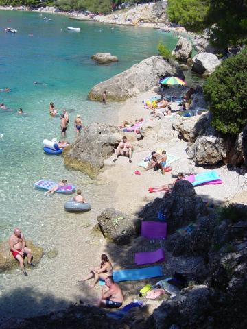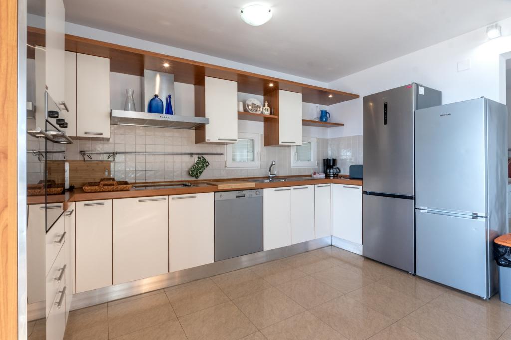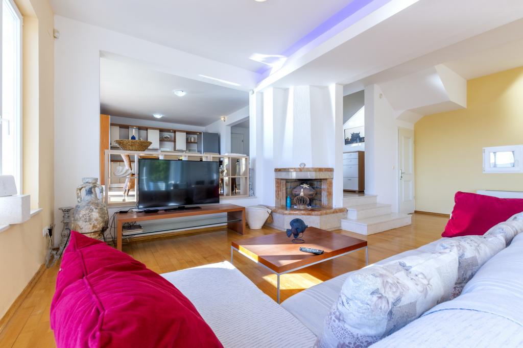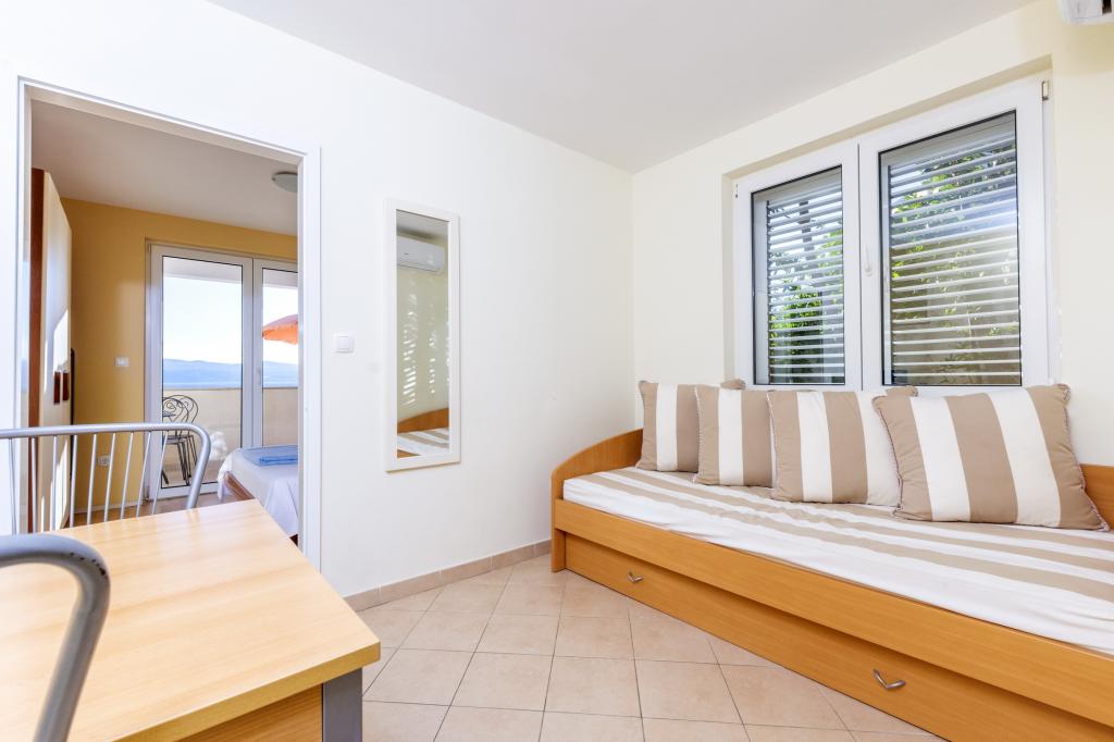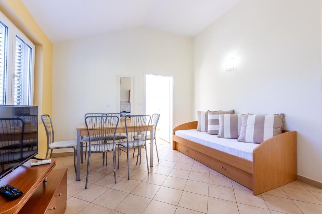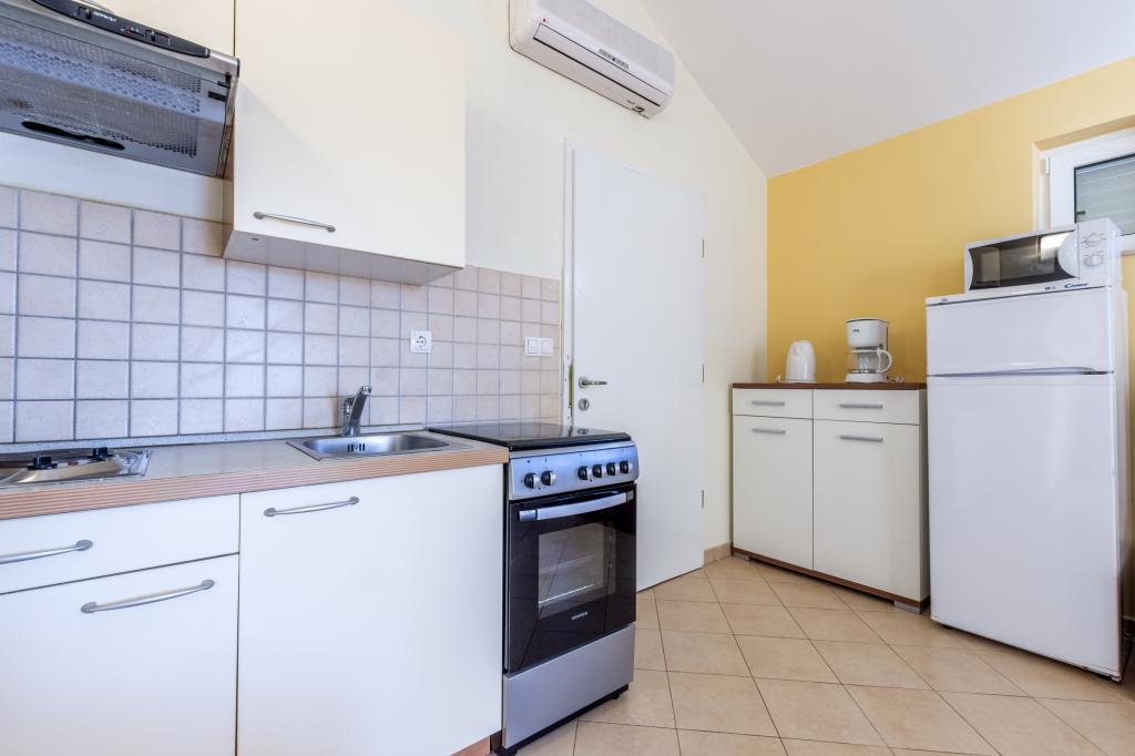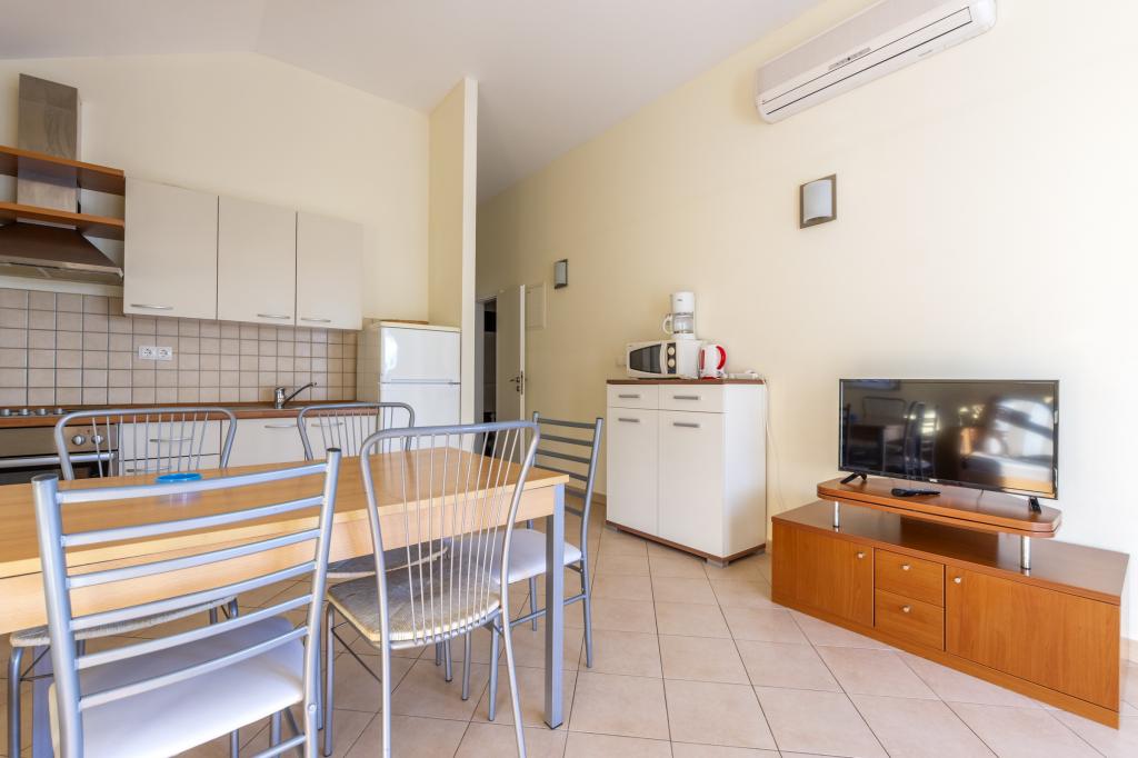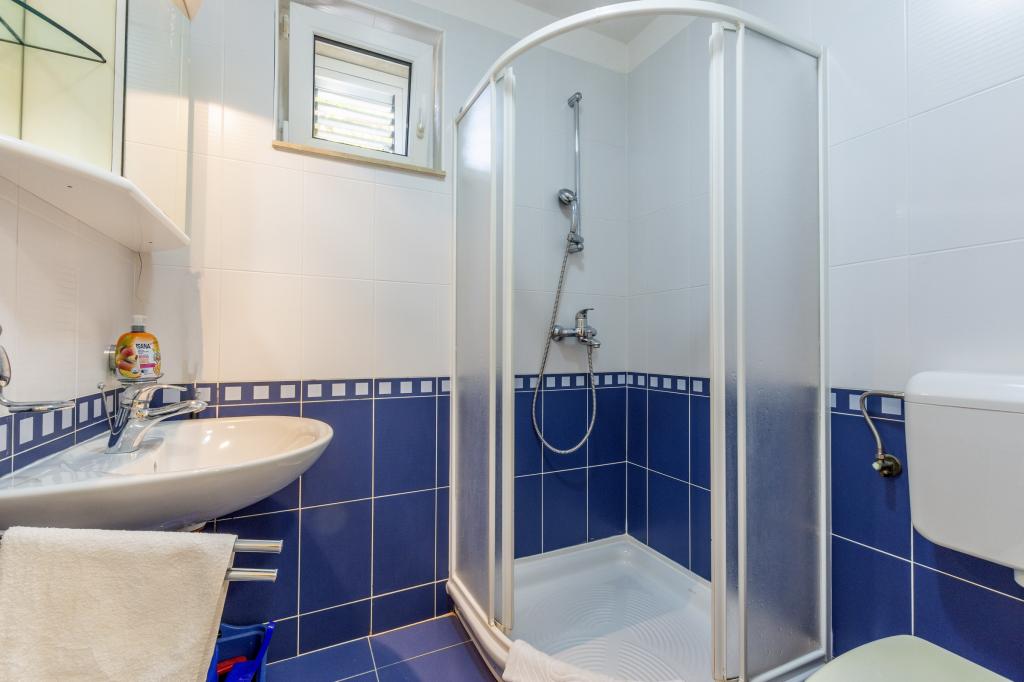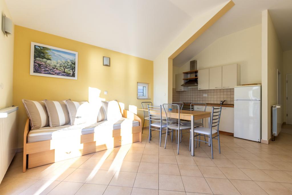 Cazare în apartamente nou construite, extrem de confortabile și superb echipate. Facilitatea este situată la 3 km de centrul orașului Omiš. Un total de opt apartamente, situate în primul rând la mare. Toate apartamentele au terase mari cu vedere la mare și la insula Brač. Locuri de parcare chiar lângă vilă. Apartamentele sunt situate sub drumul principal (300 de metri), chiar lângă mare și o plajă mare cu pietriș. Există patru tipuri de apartamente: -- tip 2+2 cu un dormitor dublu separat și un living cu două paturi, -- apartamente tip 2+2 studio mare, -- apartamente luxoase mari, tip 4+2, cu două dormitoare duble și un living mare cu două paturi extensibile și -- apartament de lux mare, tip 14+2, în realitate o vilă pe trei etaje, cu o suprafață de 300 m2, cu o piscină de 9x4 metri cu apă încălzită, cu șapte dormitoare duble, două livinguri mari cu balcoane și terase, patru băi, toaletă separată, grătar în aer liber, saună și sală de sport etc. Piscina este utilizată exclusiv de apartamentul A 14+2. Celelalte apartamente nu.