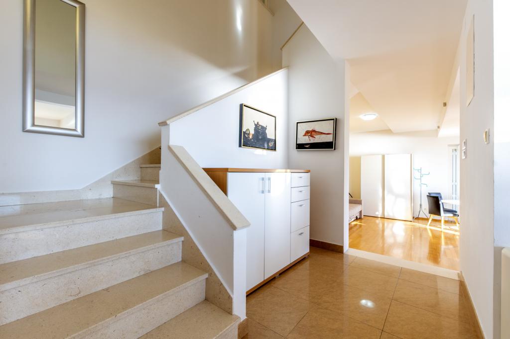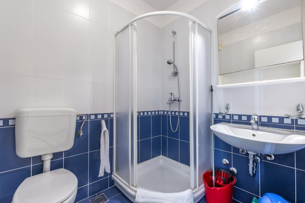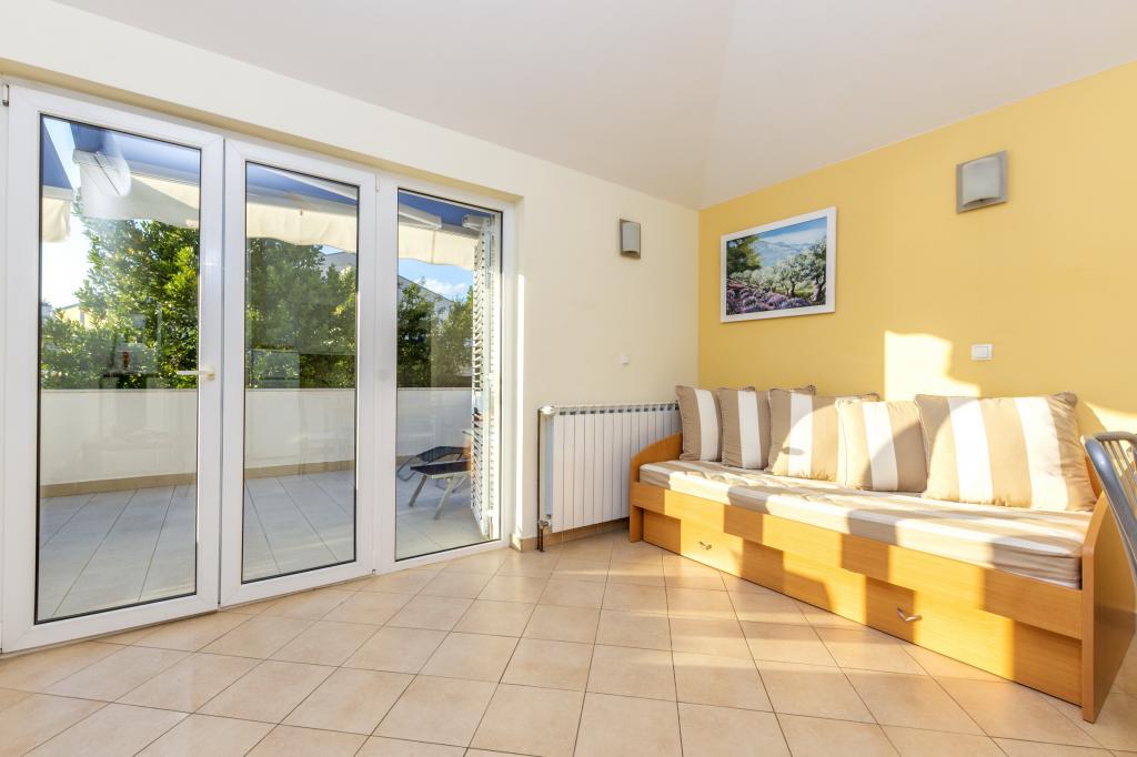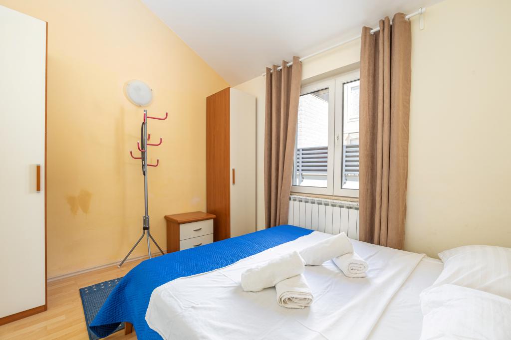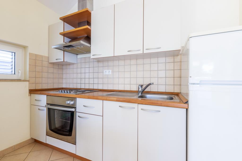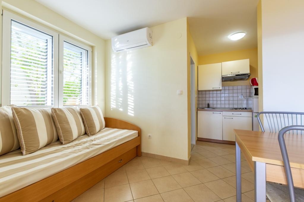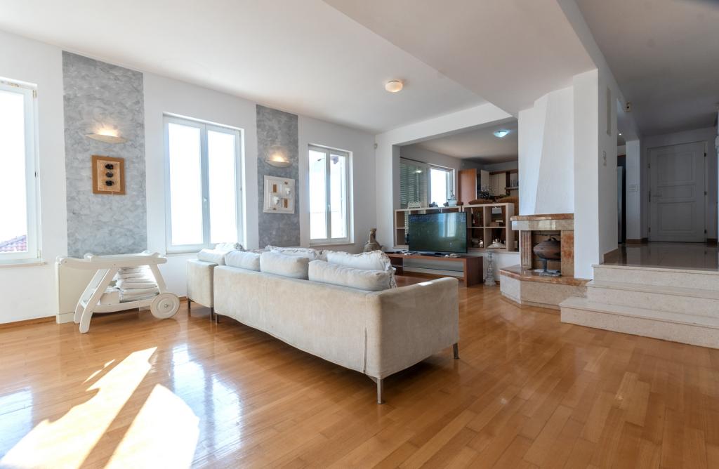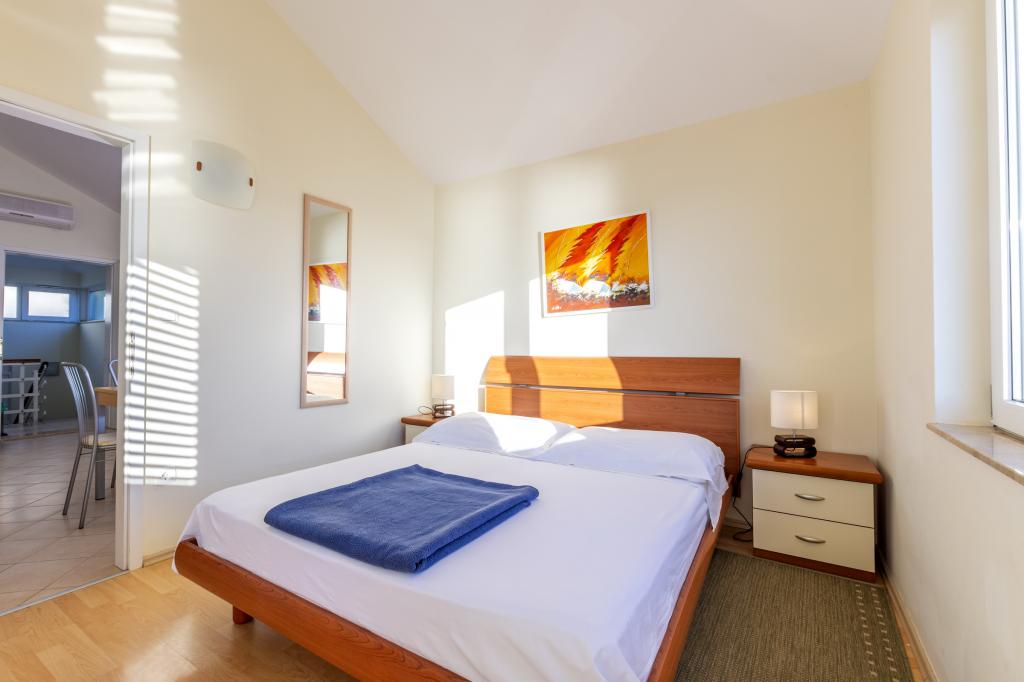 Cazare în apartamente nou construite, extrem de confortabile și superb echipate. Facilitatea este situată la 3 km de centrul orașului Omiš. Un total de opt apartamente, situate în primul rând la mare. Toate apartamentele au terase mari cu vedere la mare și la insula Brač. Locuri de parcare chiar lângă vilă. Apartamentele sunt situate sub drumul principal (300 de metri), chiar lângă mare și o plajă mare cu pietriș. Există patru tipuri de apartamente: -- tip 2+2 cu un dormitor dublu separat și un living cu două paturi, -- apartamente tip 2+2 studio mare, -- apartamente luxoase mari, tip 4+2, cu două dormitoare duble și un living mare cu două paturi extensibile și -- apartament de lux mare, tip 14+2, în realitate o vilă pe trei etaje, cu o suprafață de 300 m2, cu o piscină de 9x4 metri cu apă încălzită, cu șapte dormitoare duble, două livinguri mari cu balcoane și terase, patru băi, toaletă separată, grătar în aer liber, saună și sală de sport etc. Piscina este utilizată exclusiv de apartamentul A 14+2. Celelalte apartamente nu.