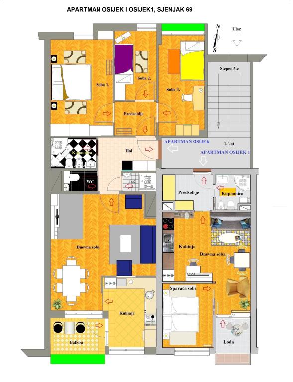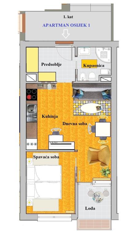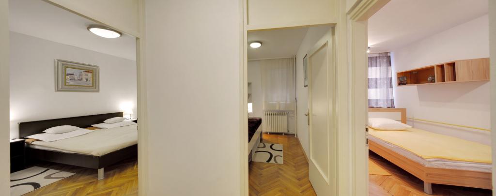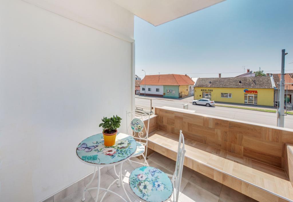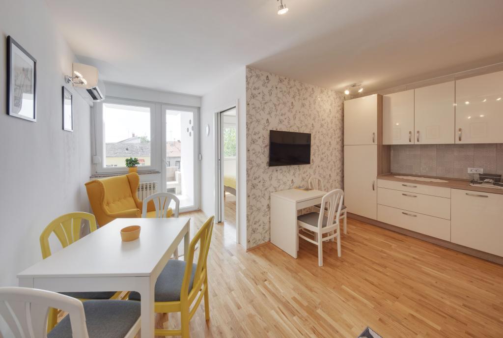 Apartamentele Osijek și Osijek 1 sunt situate la etajul 1 al unei clădiri din zona rezidențială liniștită din Sjenjak, lângă care se află o parcare mare gratuită și o stație de tramvai. Apartamentele sunt aproape de străzile și drumurile principale care leagă Osijek de orașele din jur și de autostrada A5. În apropiere se află: stadionul de fotbal și sala de sport „City Garden”, „City Pools”, restaurante și centrul istoric al orașului Osijek - Cetatea Barocă. Apartament Osijek este un apartament cu patru camere cu o suprafață de 92 m², cu o cameră de zi însorită și o zonă liniștită de nord pentru odihna nocturnă. Există o cameră cu un pat dublu, două camere single, un living cu o canapea extensibilă, două băi, o toaletă separată, o bucătărie și un balcon. Apartament Osijek 1 este un apartament cu două camere cu o suprafață de 40 m² și este situat lângă Apartamentul Osijek cu patru camere. Are un dormitor cu un pat dublu mare, care poate fi separat în două paturi separate. În camera de zi, care este conectată la sufragerie și la bucătărie, există o canapea: o canapea pliabilă, un fotoliu