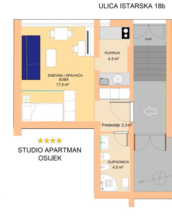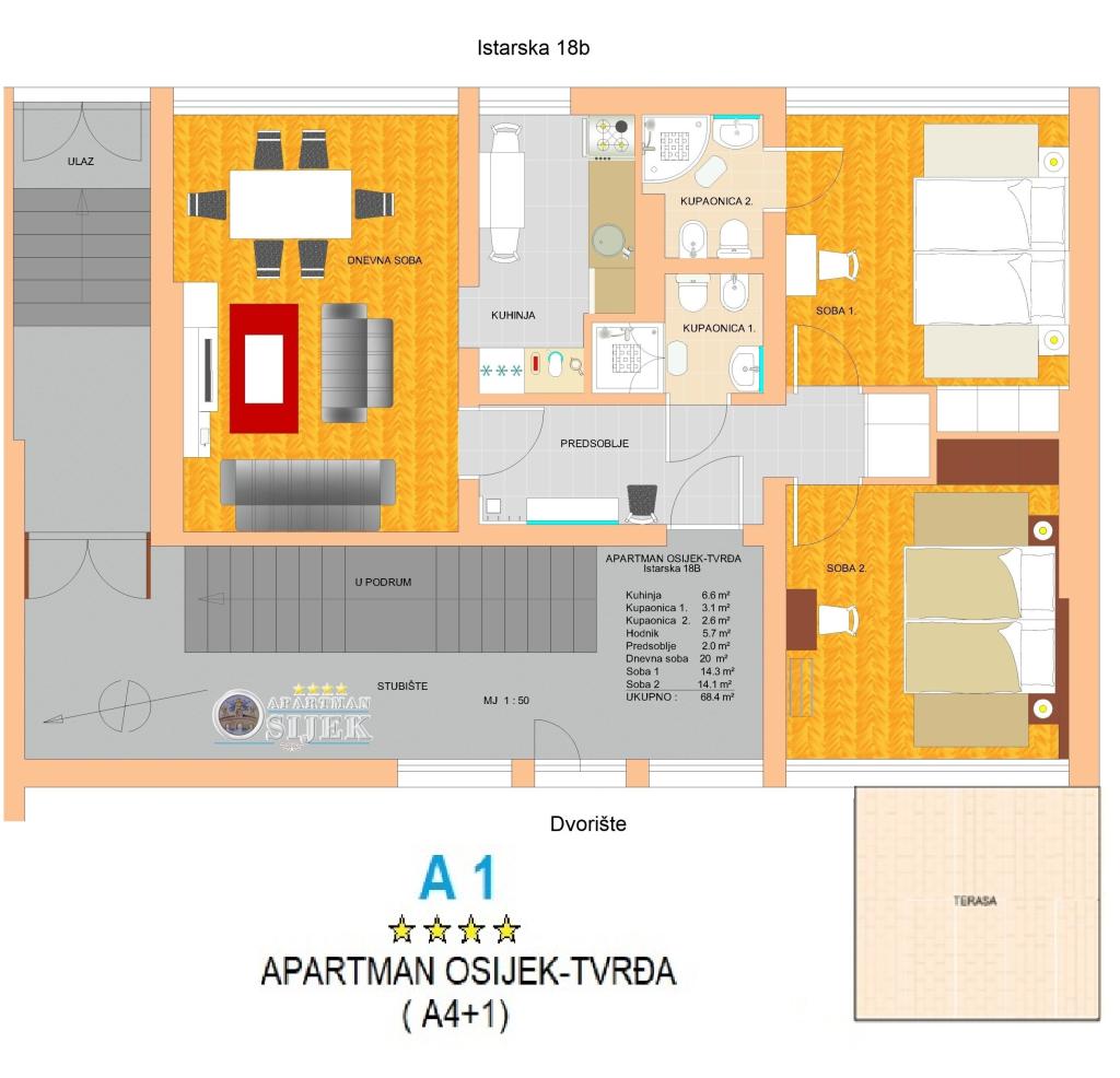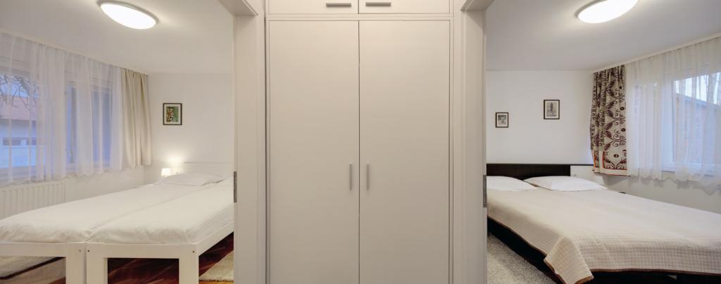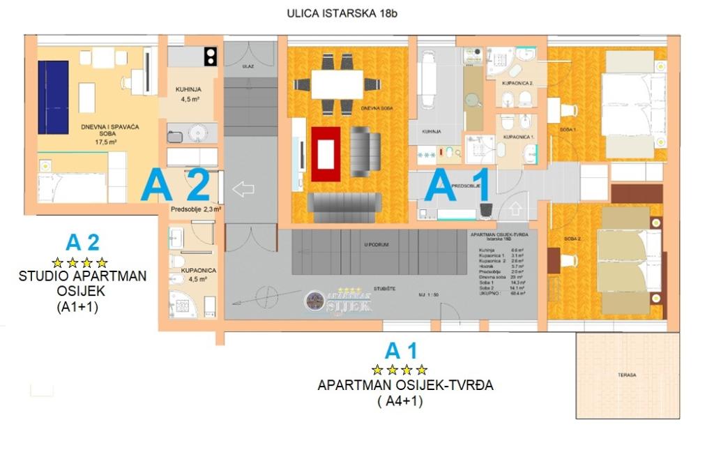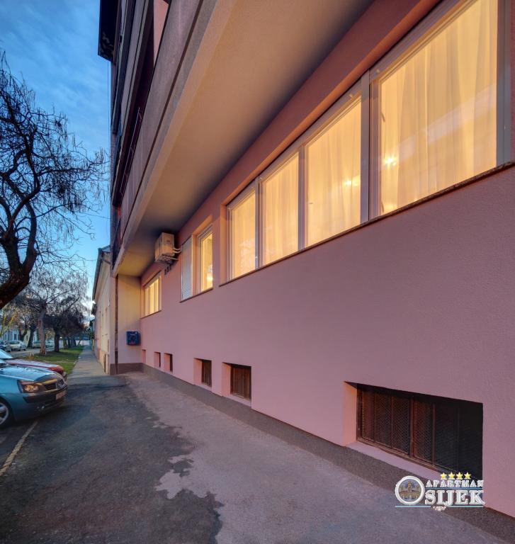 Apartamentul Tvrđa și Apartamentul Studio Osijek sunt situate la parterul înalt al clădirii din strada Istarska, lângă Eurodom, unde sunt oferite locuri de parcare. Apartamentele sunt aproape de străzile și drumurile principale care leagă Osijek de orașele din jur și de autostrada A5. În imediata apropiere a apartamentului se află stadionul de fotbal și sala de sport „City Garden”, „City Pools”, restaurante și centrul istoric al orașului Osijek - Cetatea Barocă. Apartment Tvrđa este un apartament cu trei camere cu o suprafață de 68 m². Aveți la dispoziție două camere duble și un living cu o canapea extensibilă, două băi, o bucătărie și o terasă. Apartamentul studio Osijek are o suprafață de 30 m². Este compus din hol de intrare, living, dormitor, bucatarie si baie. Dormitorul, in care se afla un pat, este separat de living printr-o usa glisanta acoperita cu oglinzi. În living există o canapea extensibilă. Un loc de parcare este asigurat în garajul subteran al Eurodomului, în imediata apropiere a clădirii.