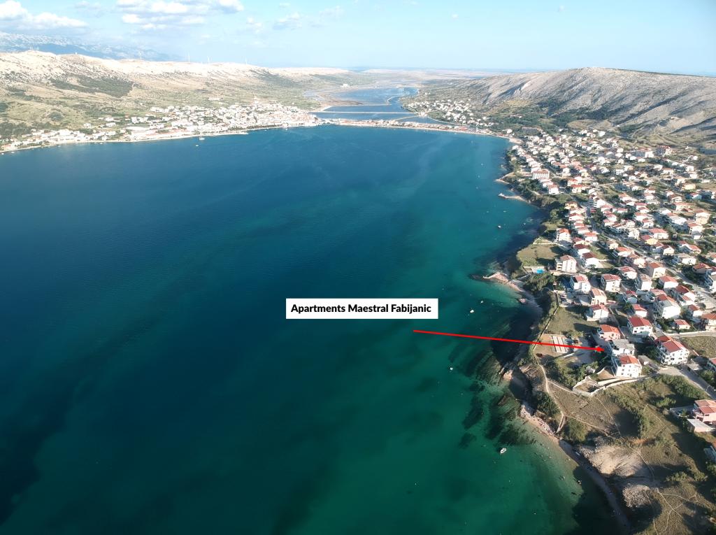 Apartamente Maestral Fabijanić, primul rând la mare, cu trei plaje în termen de 50 - 150 m. Situat într-o zonă liniștită din Pag, la aproximativ 2 km de centrul orașului. Cazarea in unitatea noastra (gradina de 525 m2 si parcare de 1000 m2) consta in apartamente moderne si bine echipate, concepute pentru a oferi confort si practic maxim. Fiecare apartament este decorat cu gust, mobilier confortabil și o serie de facilități care asigură un sejur plăcut. Fie că călătoriți cu familia, prietenii sau în cuplu, avem apartamentul perfect care vă va satisface nevoile. Apartamentele noastre sunt spațioase și includ facilități precum aer condiționat, TV Led cu programe prin satelit cu WIFI gratuit (50 Mbit), bucătărie complet utilată și băi private. Apartamentele au terase mari cu o vedere frumoasă la Marea Adriatică, orașul Pag, muntele Velebit, permițându-vă să vă treziți la sunetul liniștitor al valurilor și să vă bucurați de apusuri pitorești din confortul propriului balcon sau terasă. Așteptăm cu nerăbdare sosirea dumneavoastră!