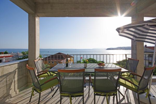 Apartament frumos curat, complet utilat, cu terasa, gratar si vedere minunata la mare. Pe acoperiș - o altă terasă, există o vedere și mai frumoasă asupra mării cu șezlonguri, scaune, grătar și jacuzzi. Marea este la doar câțiva pași de apartament, frumos turcoaz. Plaja este cu pietriș, dar puteți găsi și nisip alb și scoici în mare. Acasă Ivanka este foarte blândă, caldă, mereu dispusă. Il recomand atat familiilor mici cat si familiilor mari. Suntem mulțumiți, cu siguranță vom reveni cândva.