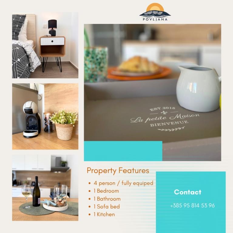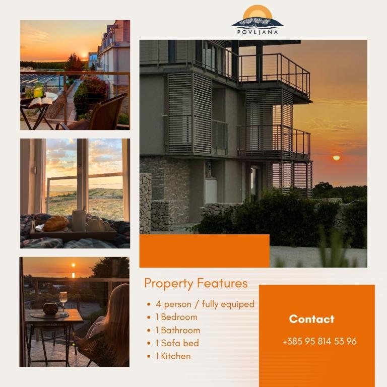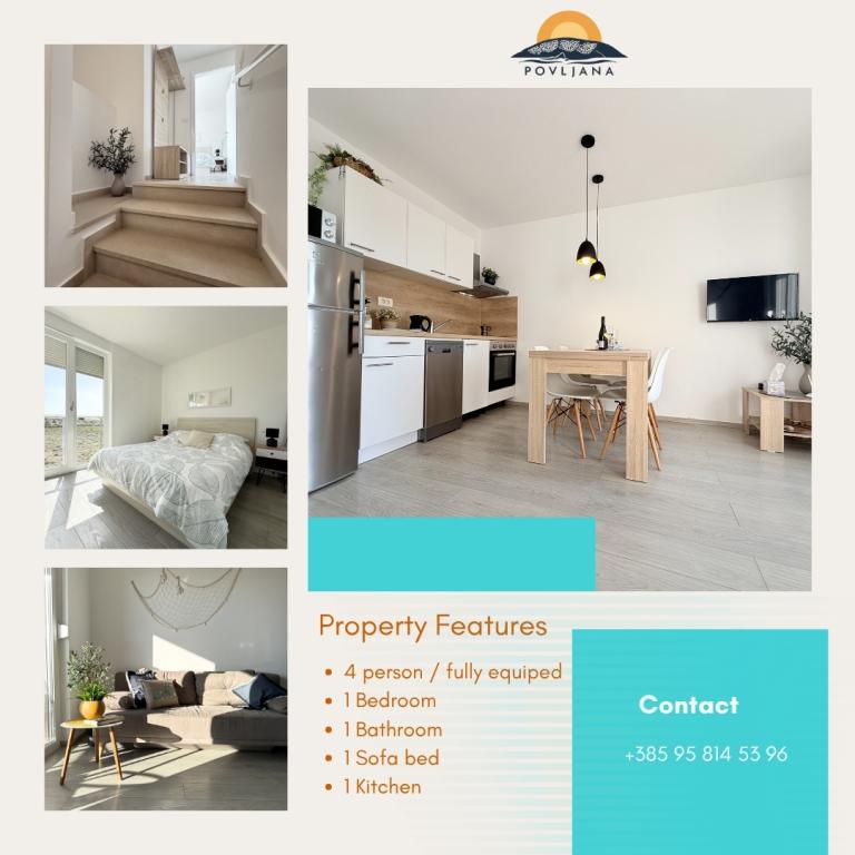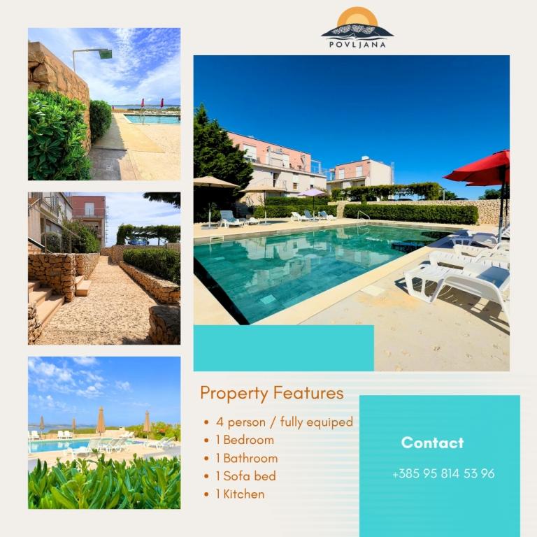 Apartament modern echipat pe peninsula Rastavac, cu vedere la Povljana și Velebit, în cadrul complexului Lijepi otok. Apartamentul este complet echipat pentru un sejur confortabil. Acesta este format dintr-un dormitor cu pat dublu și un pat extensibil suplimentar pentru 2 persoane în living. Oaspeții apartamentului au la dispoziție parcare gratuită, piscină, grătar și o zonă de joacă comună (leagăne, tenis de masă). O plajă liniștită cu nisip se află chiar sub complex, la 150 m distanță. Plajele cu pietriș și alte plaje publice cu nisip se află la 2-4 km distanță. În imediata vecinătate (200 m) se află campingul Amines Avalon, recent deschis, intrarea în camping fiind gratuită (facilități disponibile: magazin, sală de sport, brutărie, restaurant, parc acvatic). Centrul orașului Povljana este la 4 km distanță. Dacă sunteți în căutarea unei vacanțe liniștite, răsărituri și apusuri care vă vor lăsa fără suflare, mare limpede și natură neatinsă - Povljana este alegerea potrivită pentru dumneavoastră.
