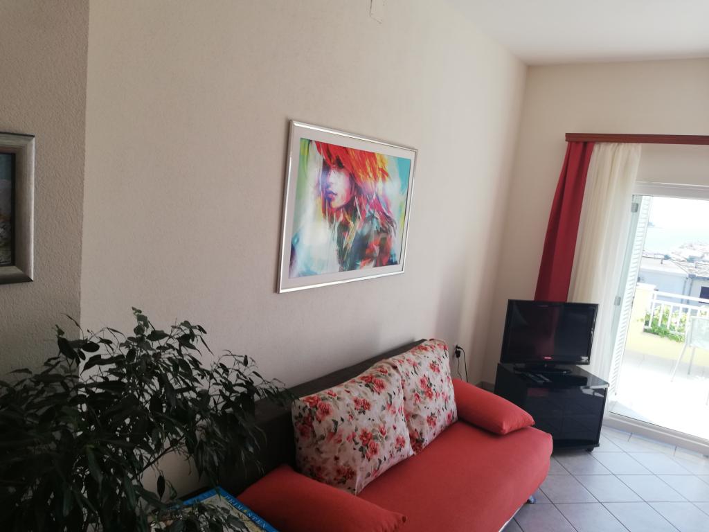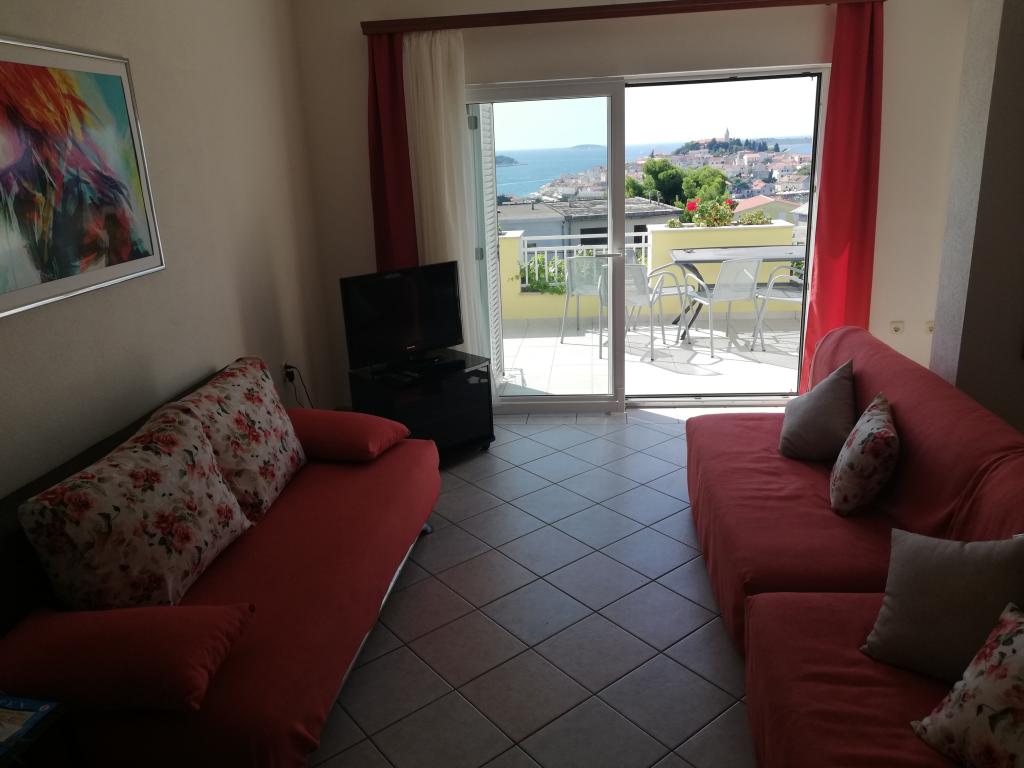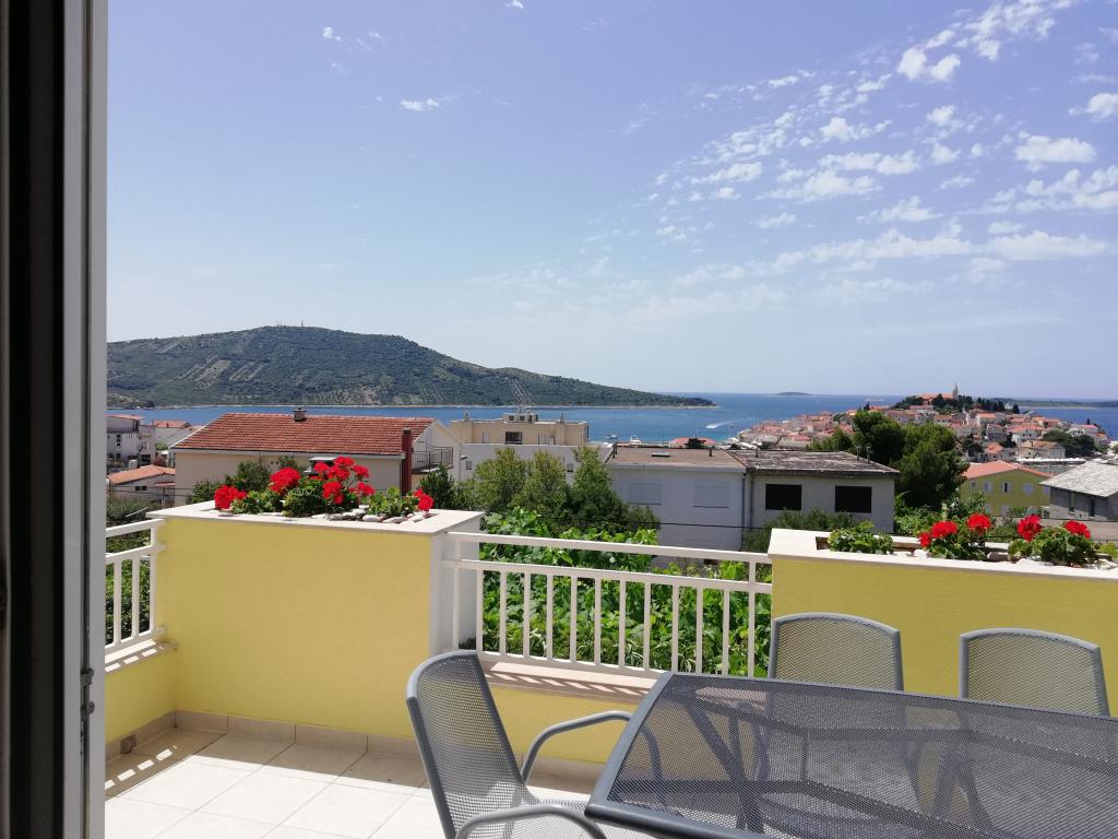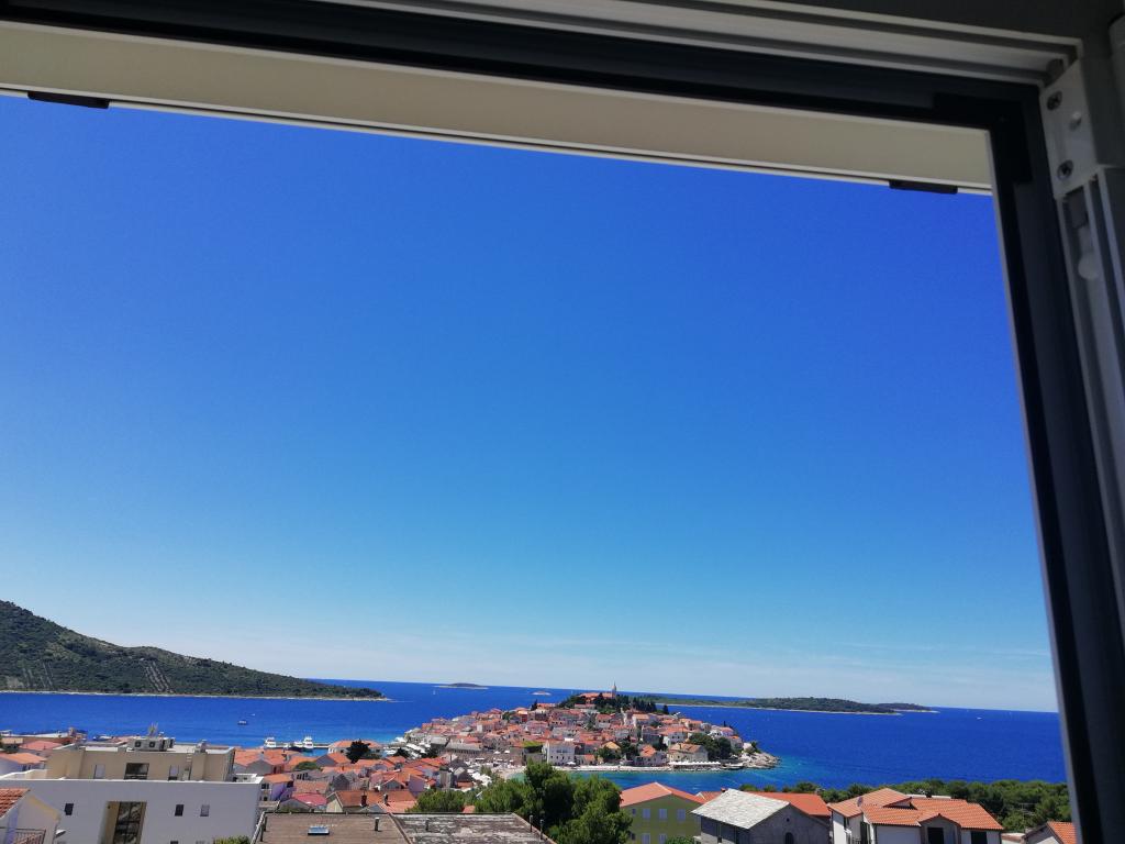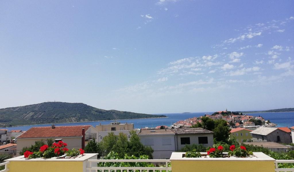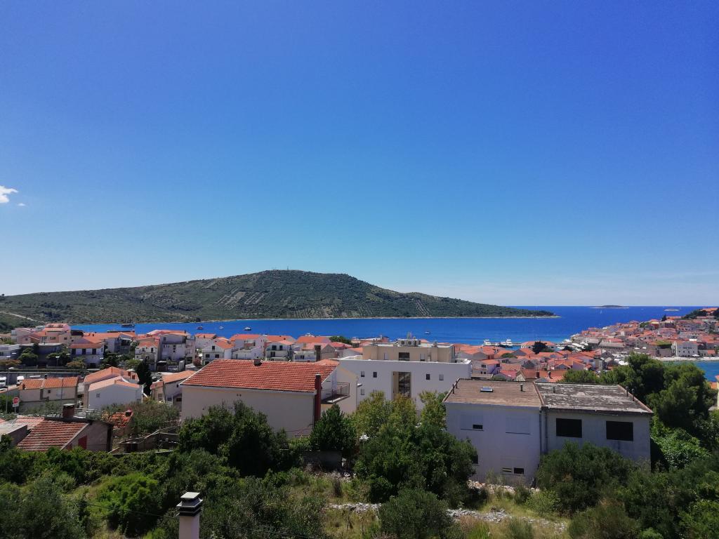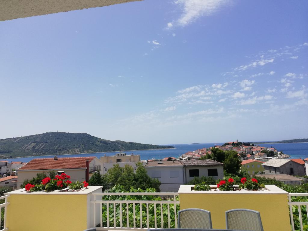 Un apartament confortabil și frumos decorat, situat pe o mică altitudine deasupra drumului în cățelușul Primo. Apartamentul și terasa oferă o vedere frumoasă la mare și orașul vechi. La doar 8 minute de mers pe jos de plajă, de asemenea, din centrul orașului. Apartamentul este format dintr-un dormitor pentru două persoane, bucătărie cu living, baie și terasă. În sufragerie există o canapea extensibilă pentru două persoane. Potrivit pentru cuplul căsătorit cu copii mici. Apartamentul este situat la etajul 1.