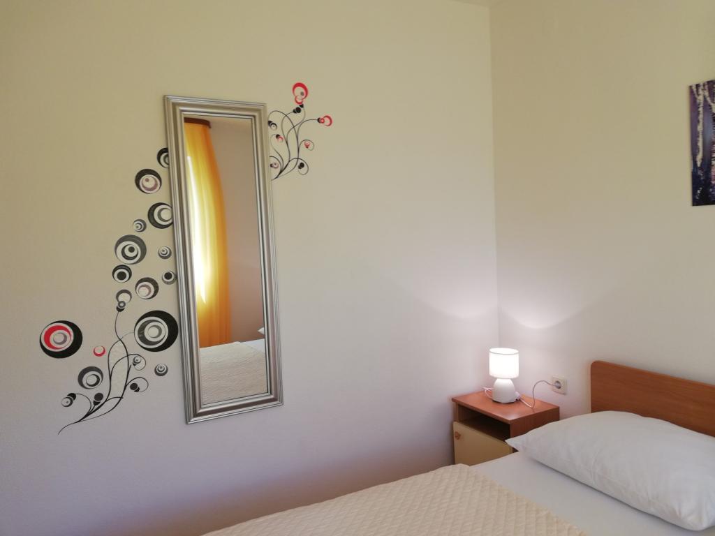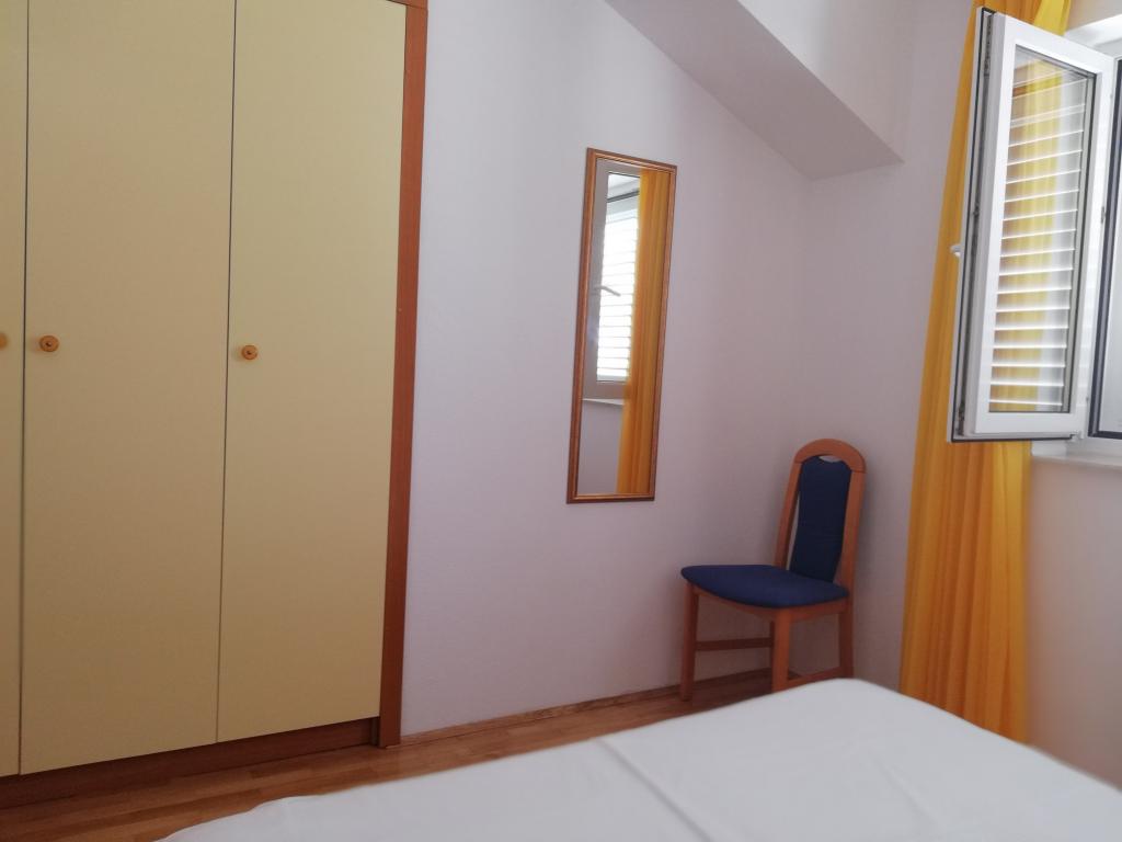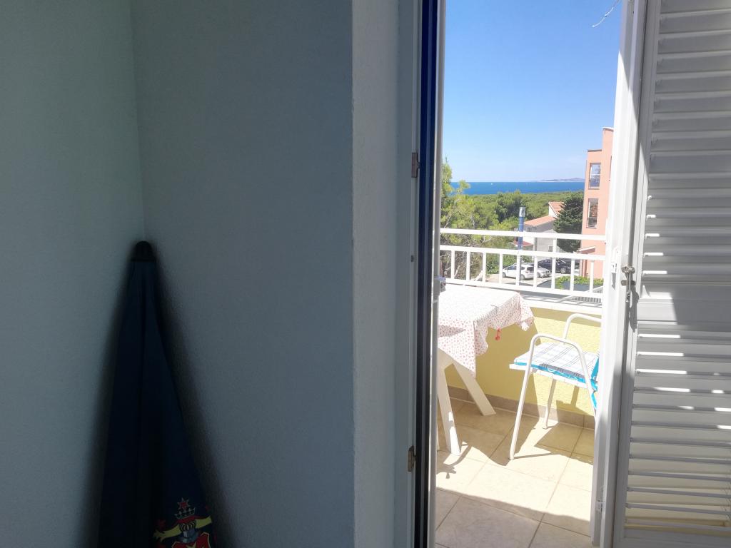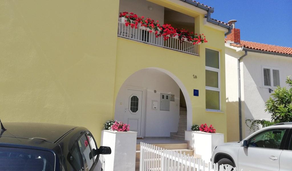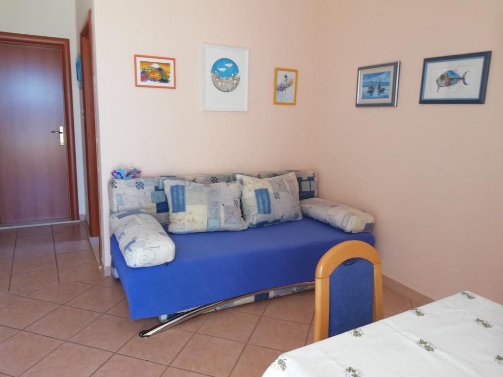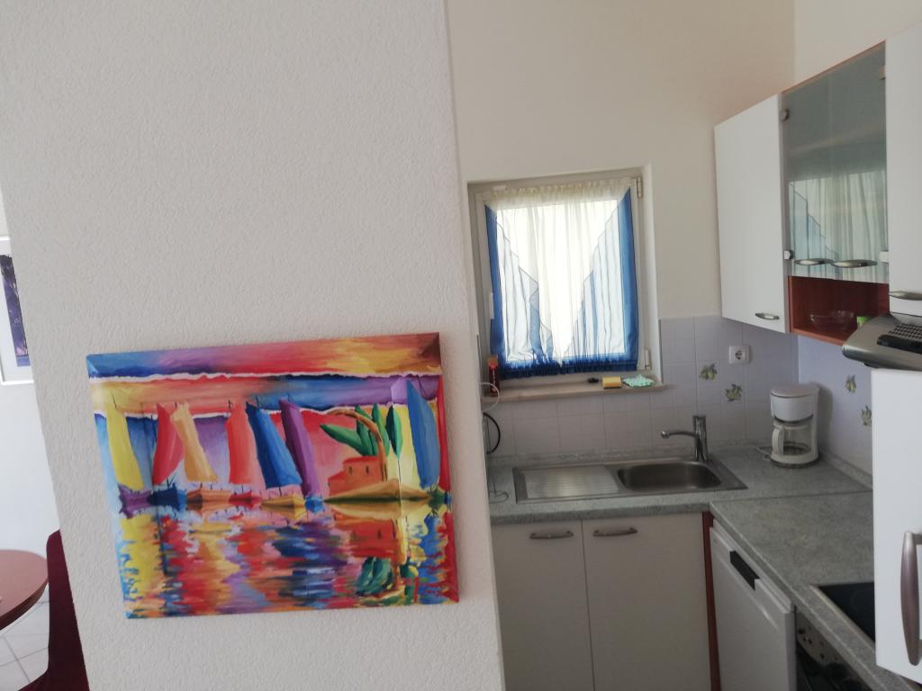 Un apartament confortabil și frumos decorat, situat pe o mică altitudine deasupra drumului în cățelușul Primo. Apartamentul și terasa oferă o vedere frumoasă la mare și orașul vechi. La doar 8 minute de mers pe jos de plajă, de asemenea, din centrul orașului. Apartamentul este format dintr-un dormitor pentru două persoane, bucătărie cu living, baie și terasă. În sufragerie există o canapea extensibilă pentru două persoane. Potrivit pentru cuplul căsătorit cu copii mici. Apartamentul este situat la etajul 1.
