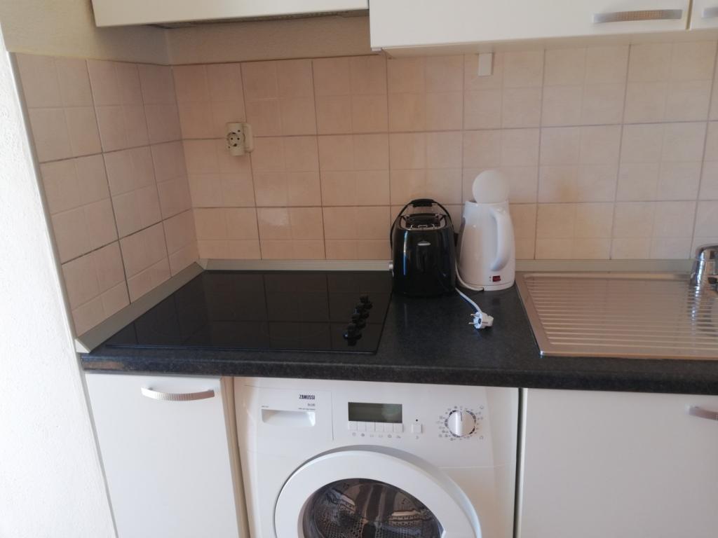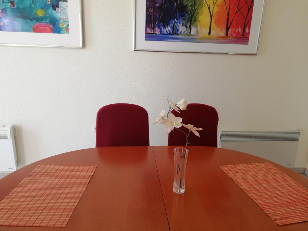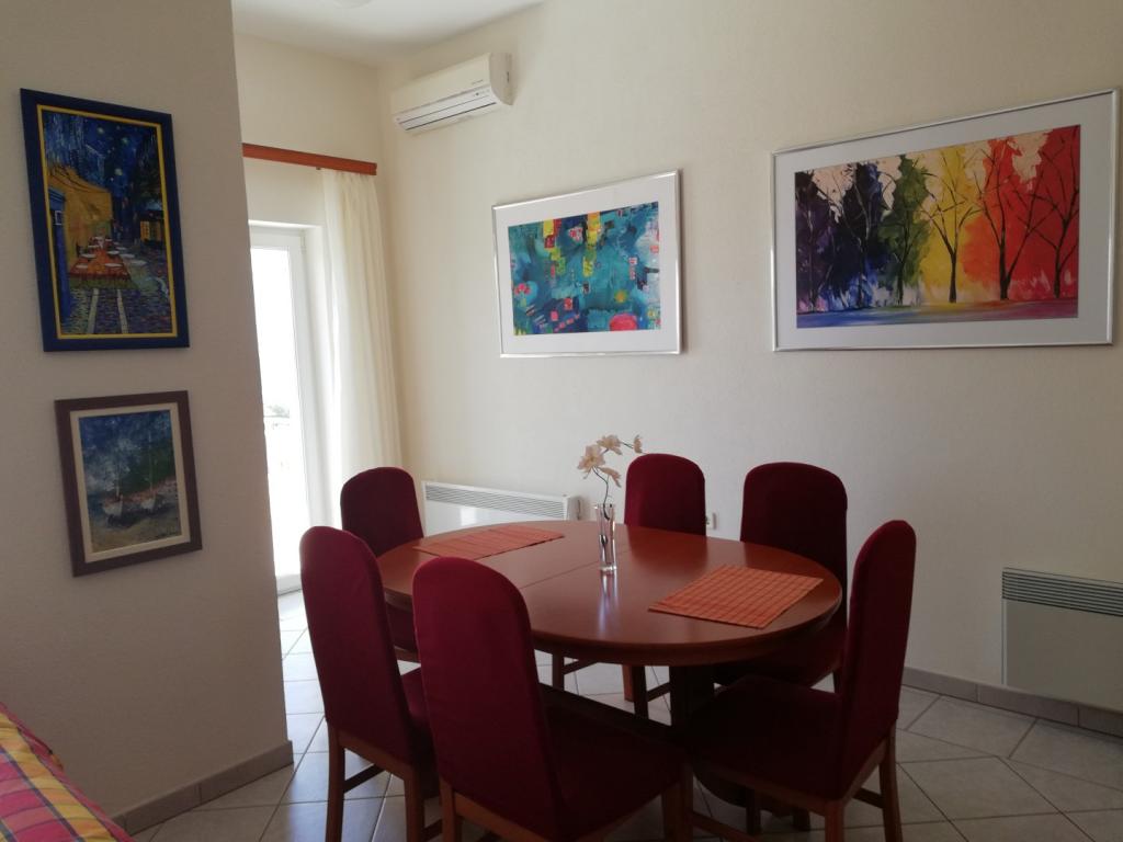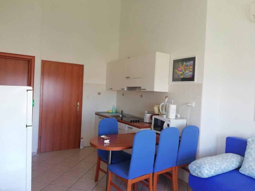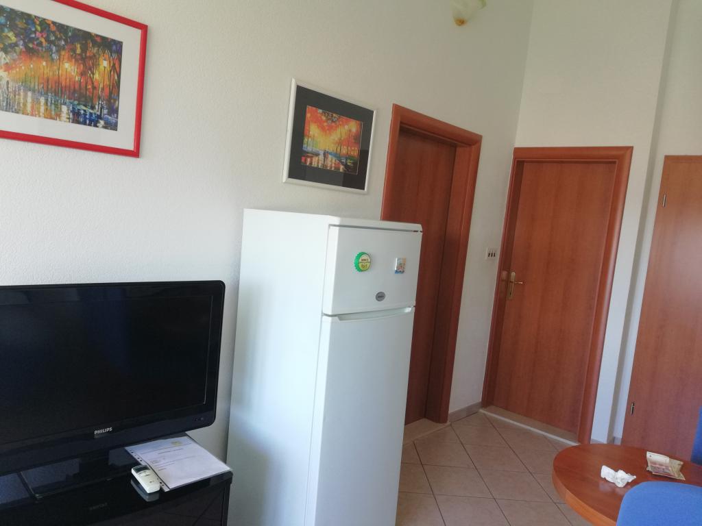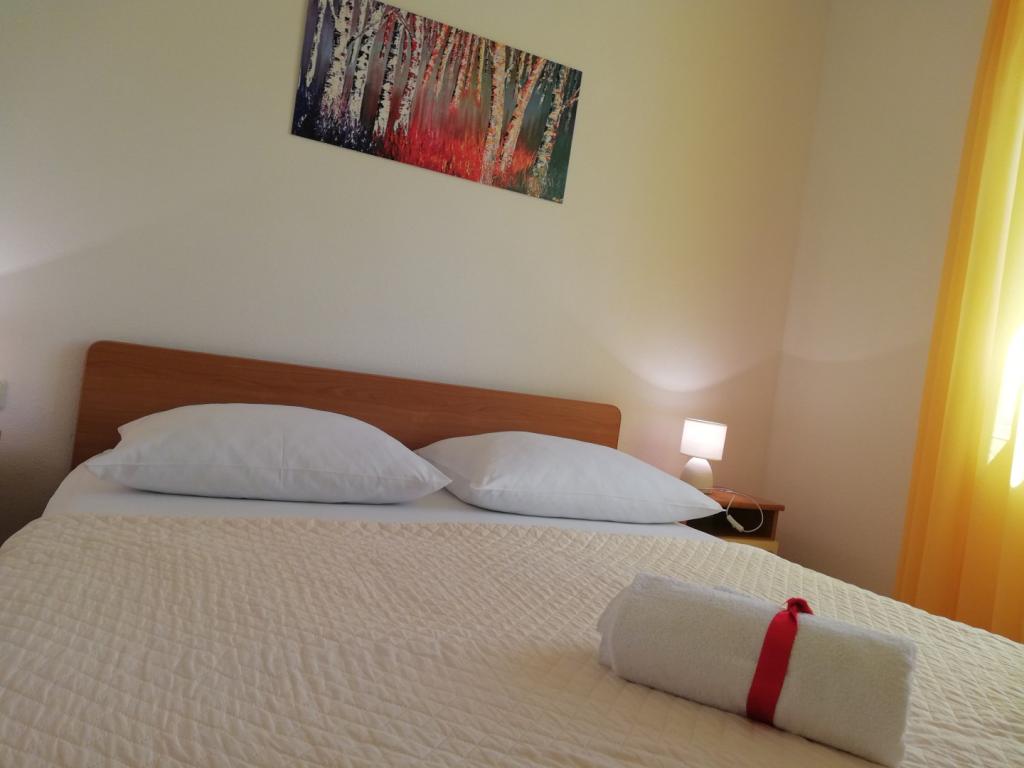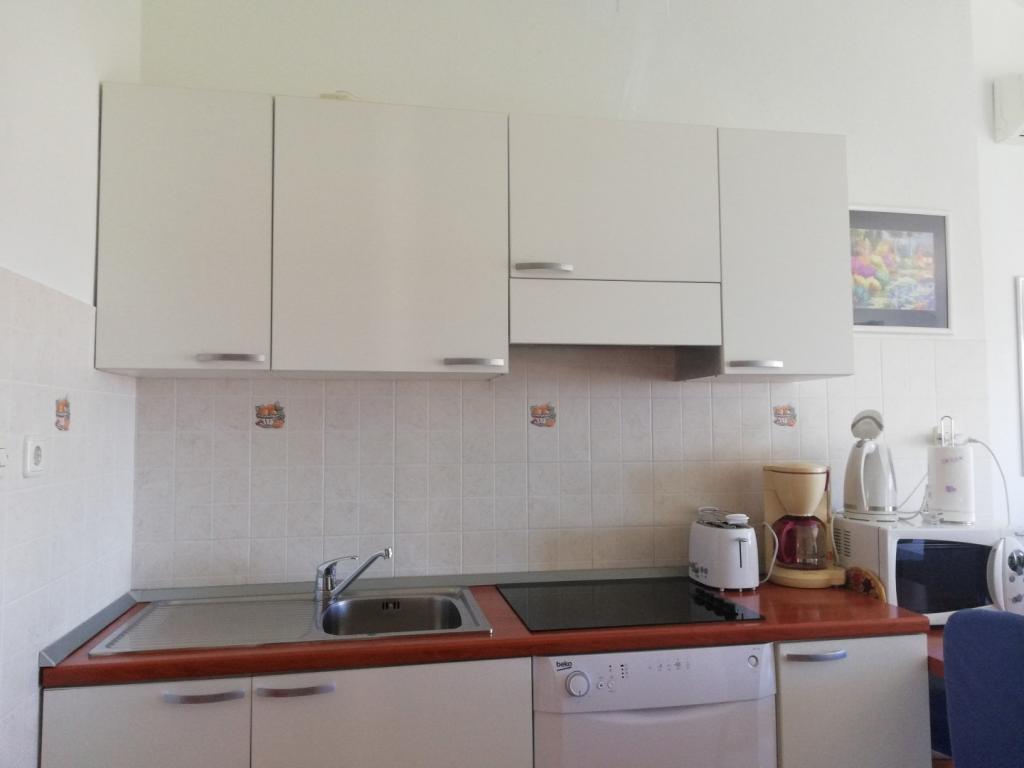 Un apartament confortabil și frumos decorat, situat pe o mică altitudine deasupra drumului în cățelușul Primo. Apartamentul și terasa oferă o vedere frumoasă la mare și orașul vechi. La doar 8 minute de mers pe jos de plajă, de asemenea, din centrul orașului. Apartamentul este format dintr-un dormitor pentru două persoane, bucătărie cu living, baie și terasă. În sufragerie există o canapea extensibilă pentru două persoane. Potrivit pentru cuplul căsătorit cu copii mici. Apartamentul este situat la etajul 1.