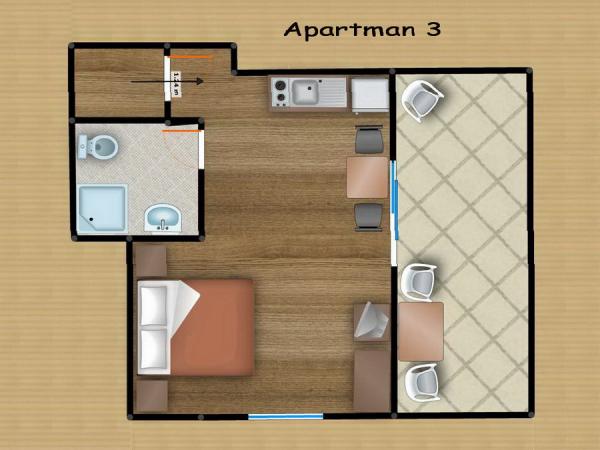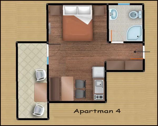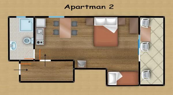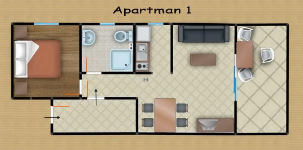 Apartamente confortabile pentru două-trei persoane. cu terasă, aer condiționat, parcare și TV prin satelit și conexiune la internet, la 400 m de plajă și mare, într-un mediu liniștit și relaxant. Incluse în preț: Aer condiționat, Parcare, WI-FI, TV, SAT, Taxă de turist, lenjerie de pat, prosoape, veselă pentru pregătirea și consumul meselor, tacâmuri.