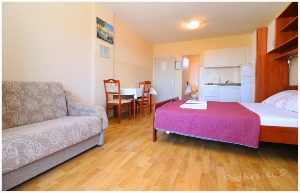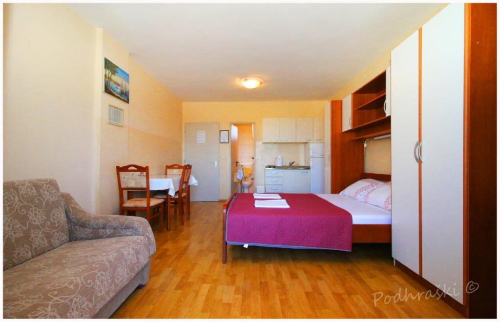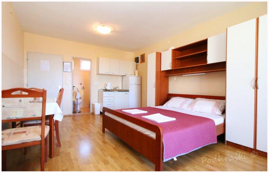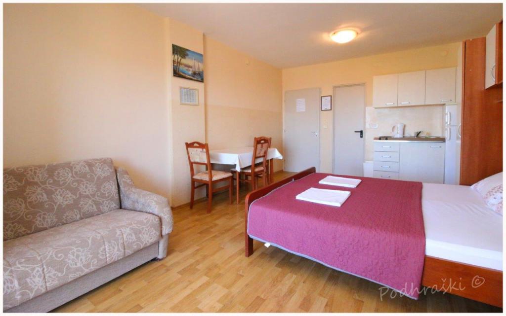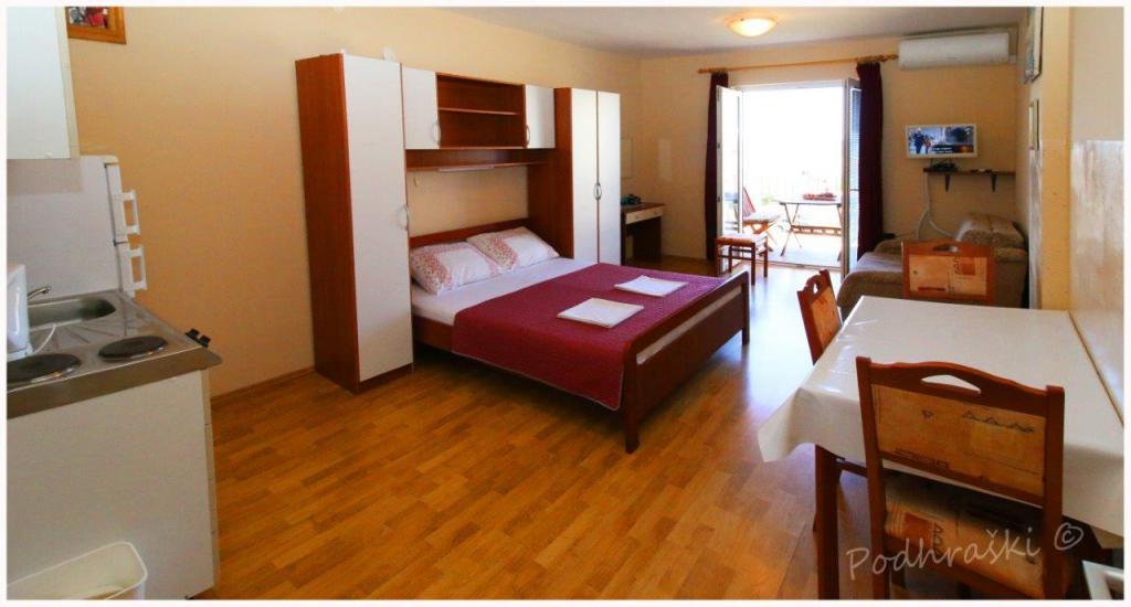 Închiriați 4 apartamente studio in Primosten într-o locație liniștită, 4min mers pe jos de piața principală, mers pe jos 2-3min de plajă. Plajele sunt de nisip, cu păduri de pin. Capacitatea 2 adulți și 2 copii mai mici pe apartament Apartamentele sunt noi, cu mobilier nou și sunt situate în noua casă. Pretul include un loc de parcare, utilizarea de curte, de aer condiționat și grătare, precum și taxele locale. Fiecare apartament are la internet (Wi-Fi), frigider, televizor LCD, aer condiționat, un pat dublu, canapea extensibilă, baie, bucatarie, balcon, etc ...