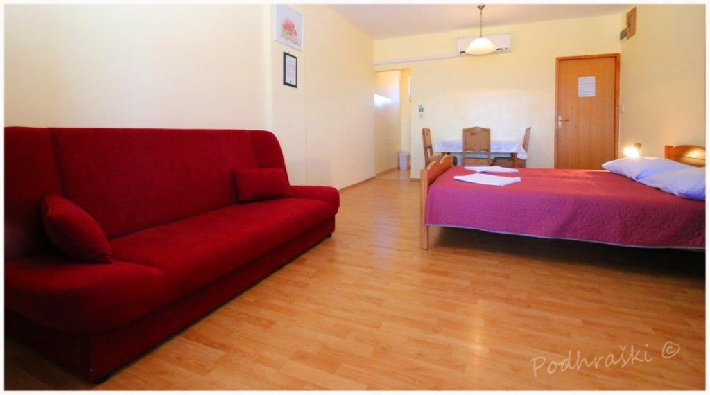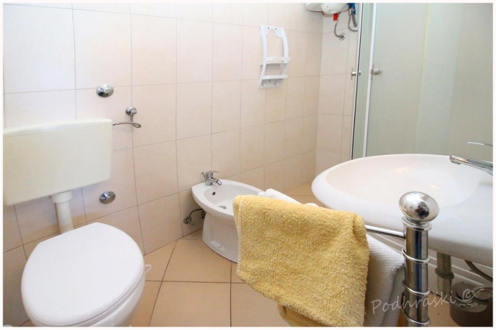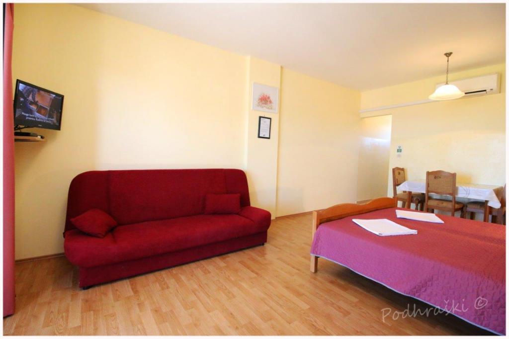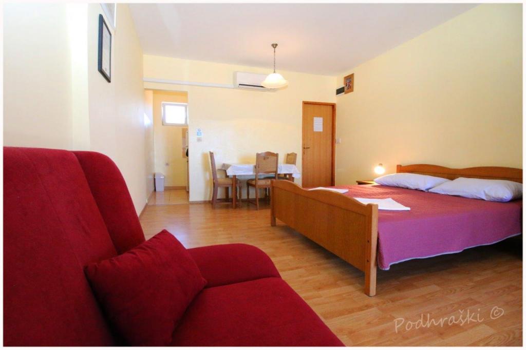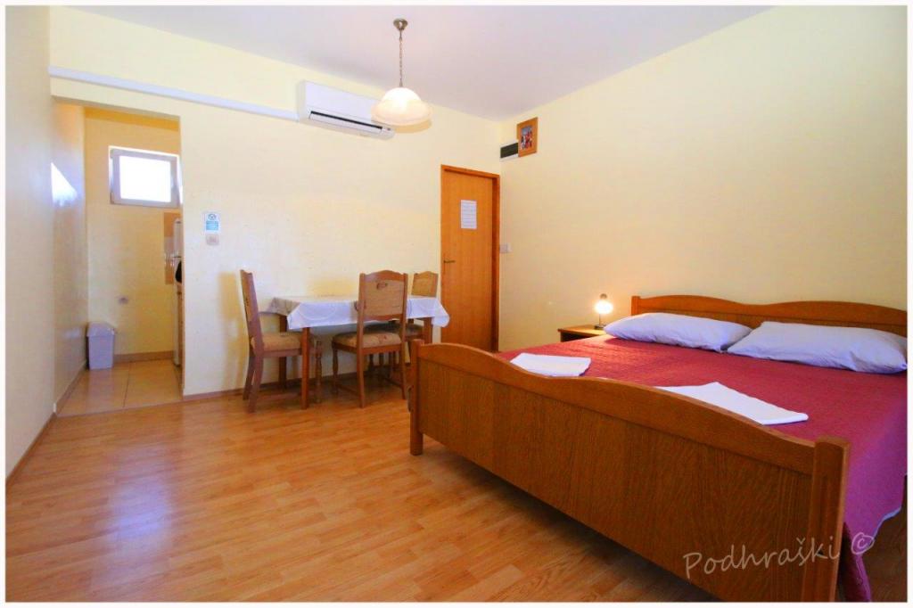 Închiriați 4 apartamente studio in Primosten într-o locație liniștită, 4min mers pe jos de piața principală, mers pe jos 2-3min de plajă. Plajele sunt de nisip, cu păduri de pin. Capacitatea 2 adulți și 2 copii mai mici pe apartament Apartamentele sunt noi, cu mobilier nou și sunt situate în noua casă. Pretul include un loc de parcare, utilizarea de curte, de aer condiționat și grătare, precum și taxele locale. Fiecare apartament are la internet (Wi-Fi), frigider, televizor LCD, aer condiționat, un pat dublu, canapea extensibilă, baie, bucatarie, balcon, etc ...