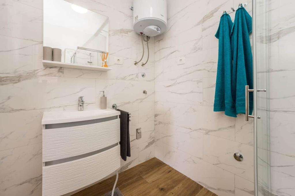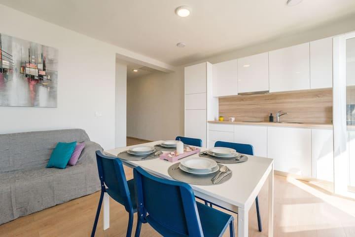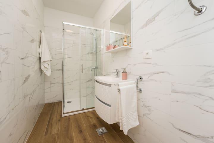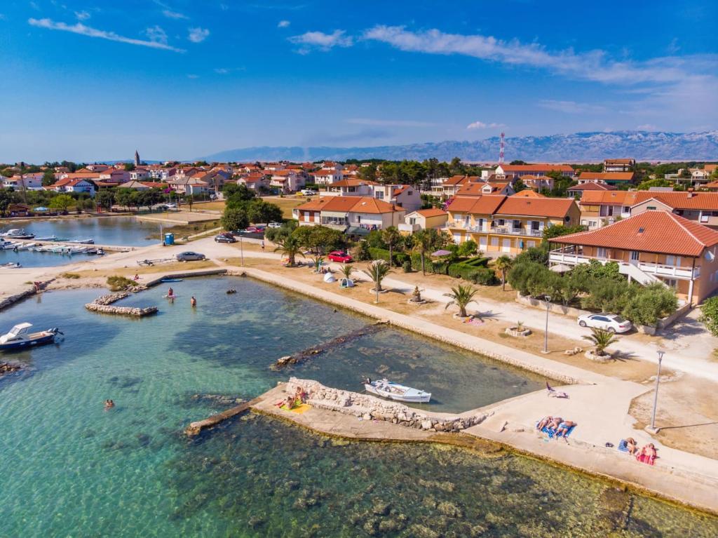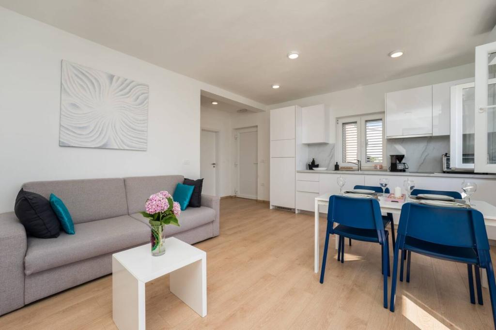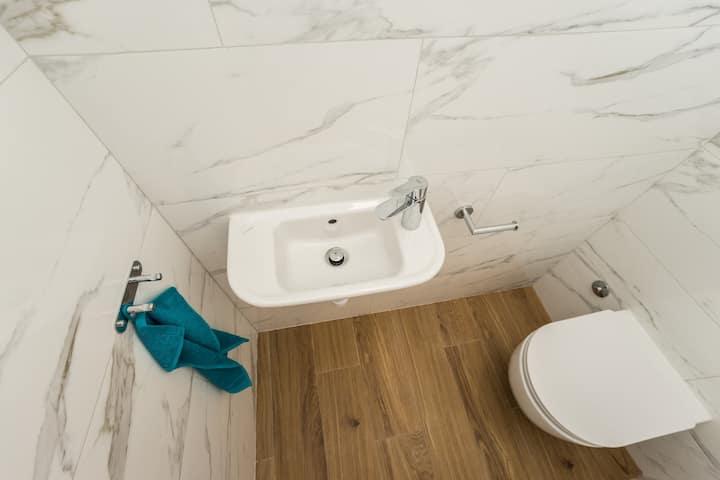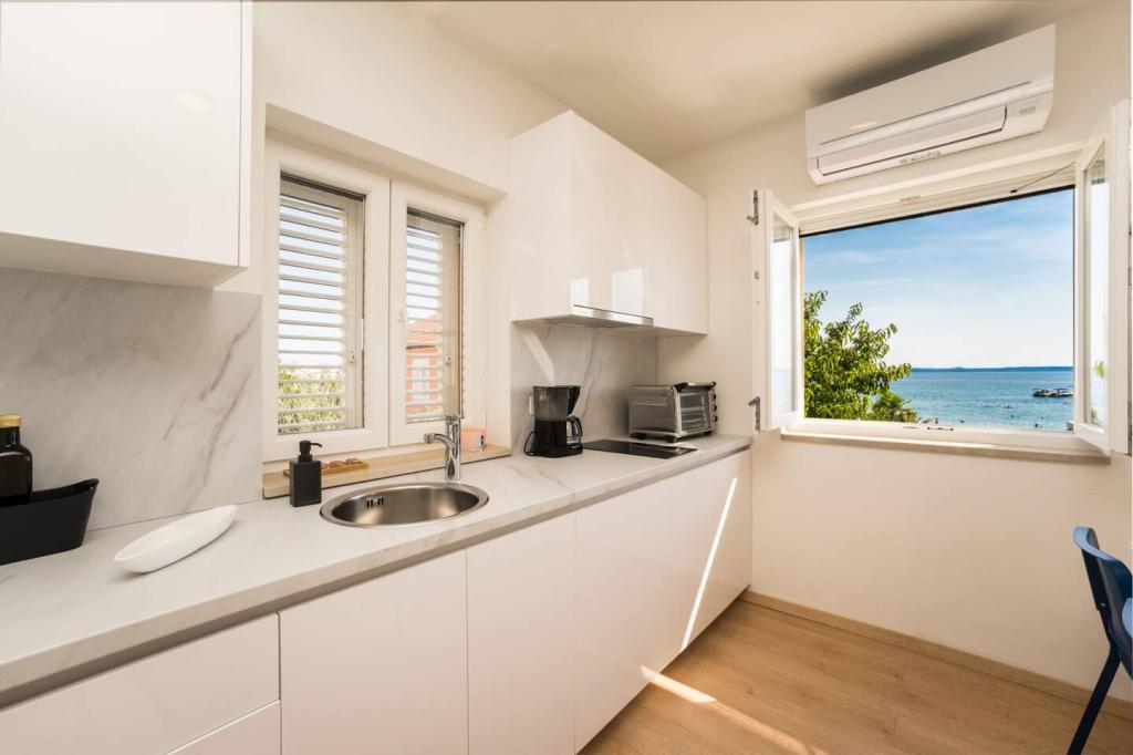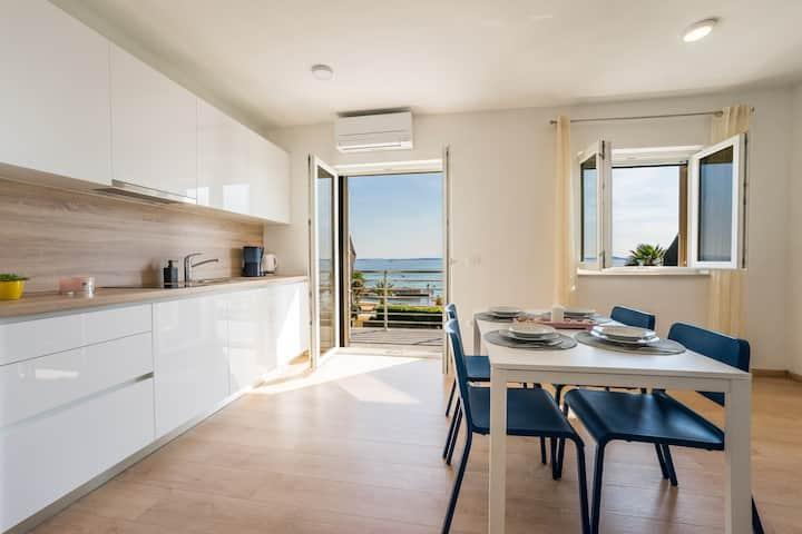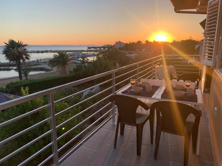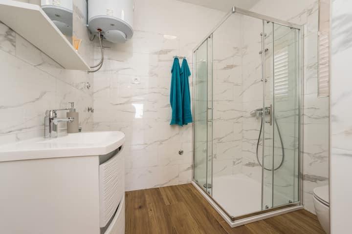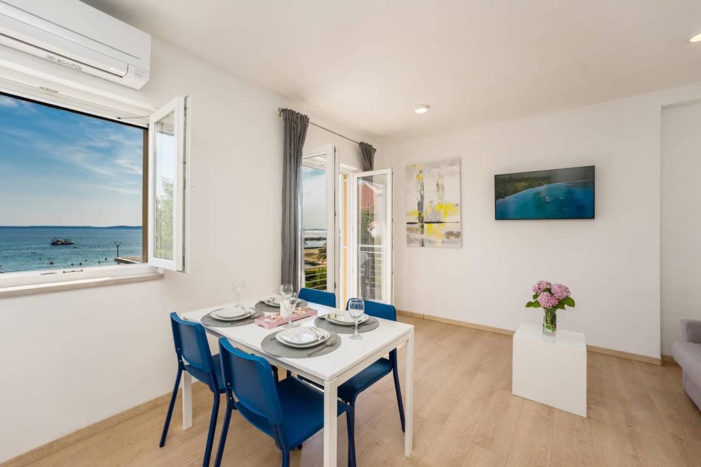 Apartamente noi și moderne într-o casă în imediata apropiere a mării, cu o vedere frumoasă la mare. Plaja de nisip este în apropiere și puteți înota în fața casei. Este disponibil Wi-Fi gratuit, există aparate de aer condiționat în 2 camere, iar parcarea este disponibilă în spatele sau în fața casei. În apropiere există magazine, cafenele și restaurante. Fiecare apartament are 1 dormitor și o canapea în living. Livingul este conectat la bucătărie. Are o baie și o toaletă separată. Există o terasă drăguță cu o vedere extraordinară la mare și o măsuță unde puteți savura micul dejun dimineața sau seara cu apusul soarelui. Bucurați-vă de vacanța relaxantă în aceste apartamente frumoase.