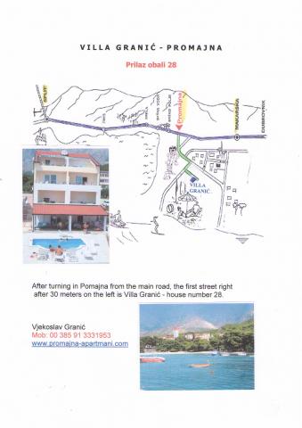 Vila Granić este situată în orașul turistic Promajna, într-un mediu frumos amenajat, la doar 100 de metri de plaja cu nisip și pădure de pini, și este potrivită pentru familiile cu copii. Vila are piscină proprie, curte mare și parcare închisă. Fiecare apartament are o terasă mare cu vedere la mare, cu o masă și scaune spațioase. În apropiere se află 6 restaurante, magazine și locuri de joacă pentru copii. Lângă casă se află un teren de sport pentru baschet și minifotbal, care este gratuit.