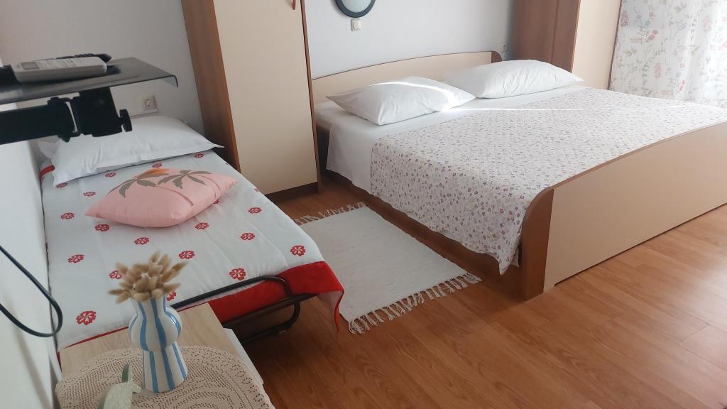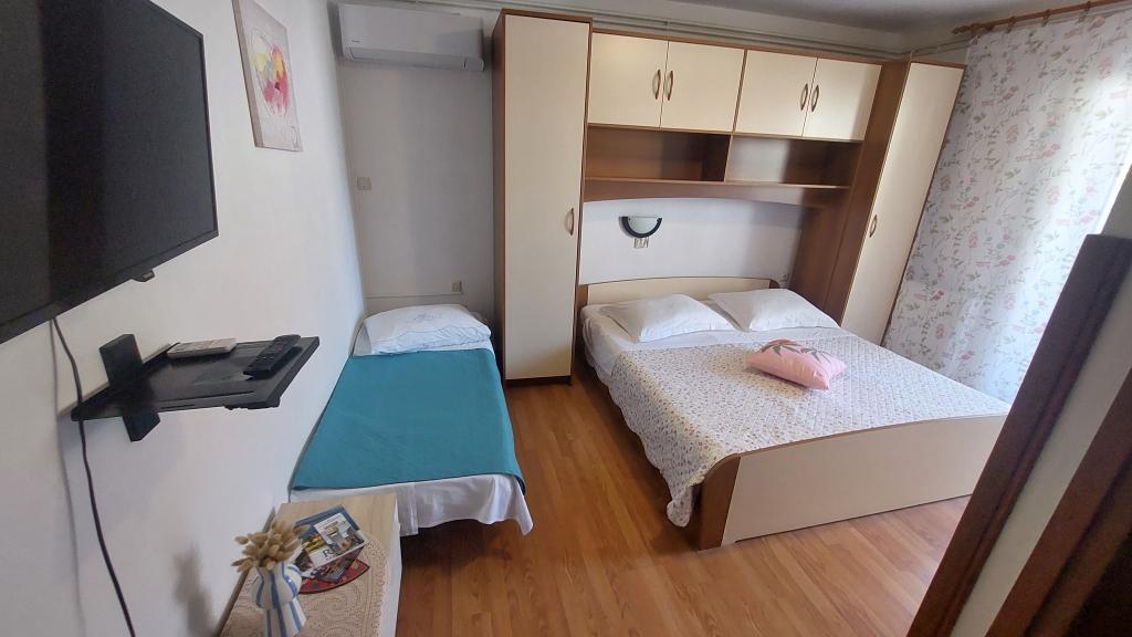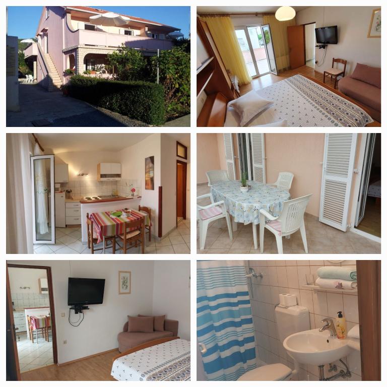 Inchiriem apartamente complet utilate si cu aer conditionat (pentru 2-5 persoane) + SAT/LCD TV, fiecare cu terasa sau balcon propriu + loc de parcare in curte si internet de mare viteza. Va oferim si camere cu aer conditionat pentru 2-3 persoane, fiecare cu terasa proprie, toaleta/WC, si posibilitatea de a folosi o bucatarie complet utilata, sala de mese (SAT/LCDTV) si terasa exterioara placuta cu mobilier de gradina. Ne aflăm în apropierea unei frumoase plaje de nisip-pietriș (200-250m) și a tuturor celorlalte facilități necesare unei vacanțe de vară fără griji și plăcute (magazine, restaurante, pizzerii, baruri și cafenele pe plajă, facilități de agrement, programe pentru copii...) . Din centrul vechi al orașului Rab, cu istoria sa bogată, ne aflăm la doar 20 de minute de mers pe jos de-a lungul unei frumoase promenade pe malul mării.