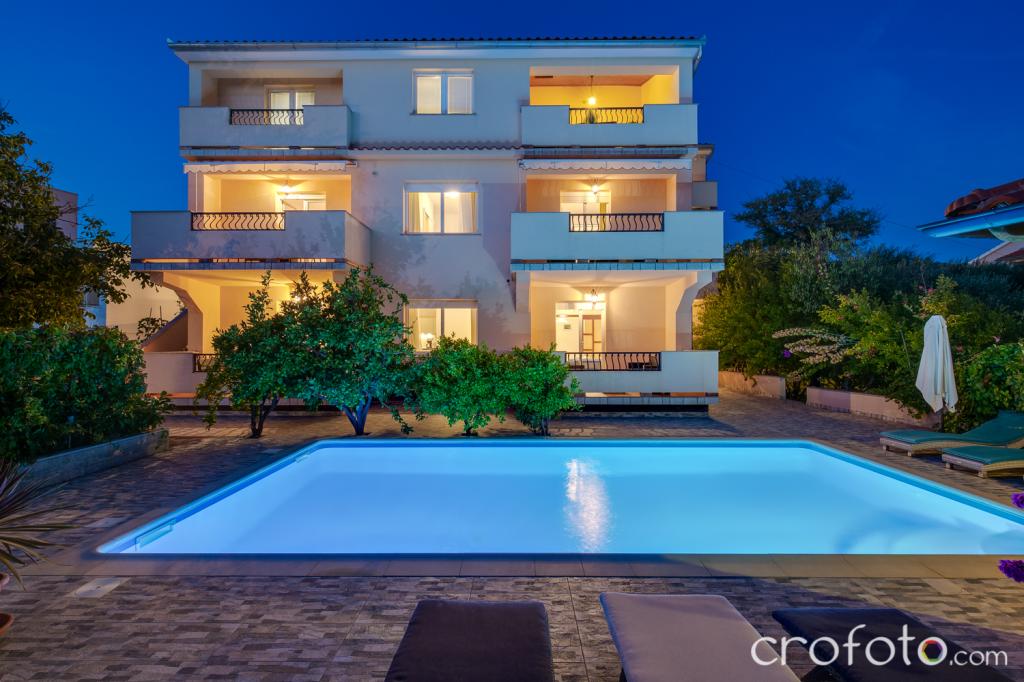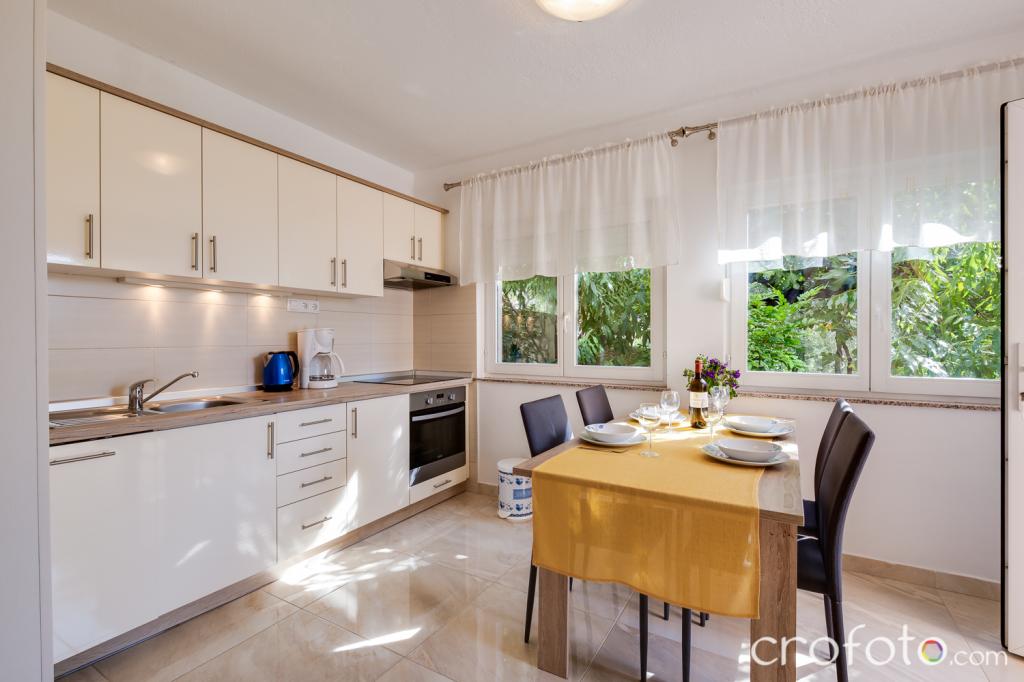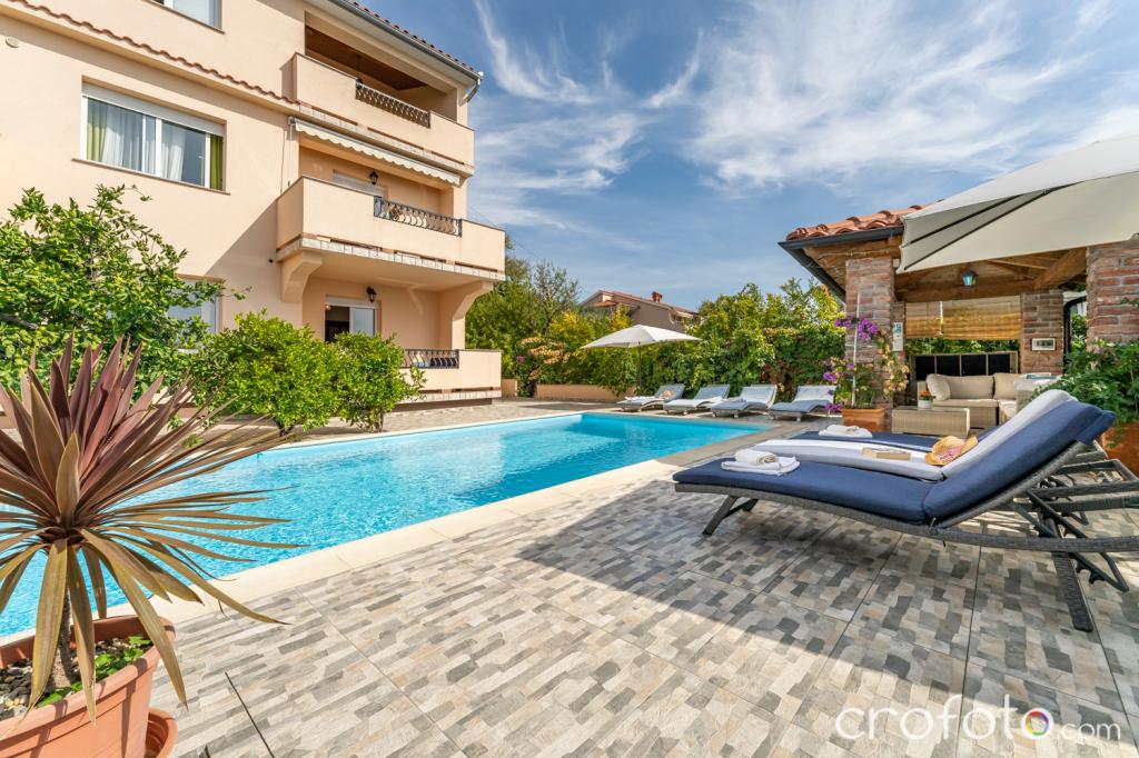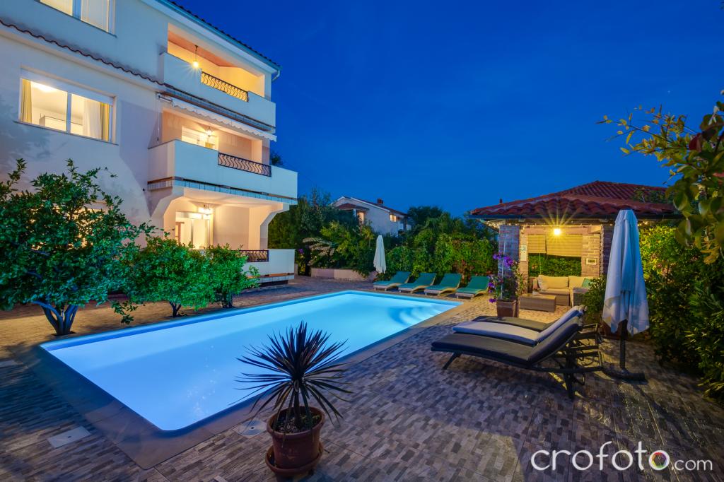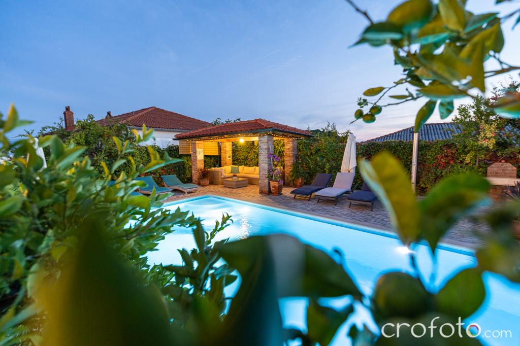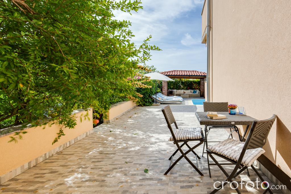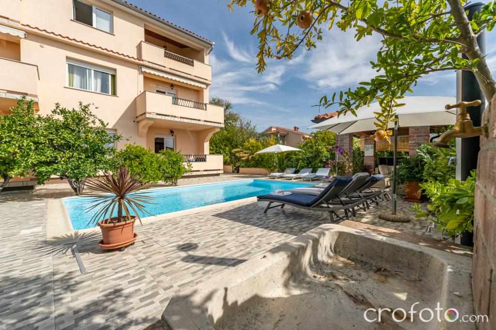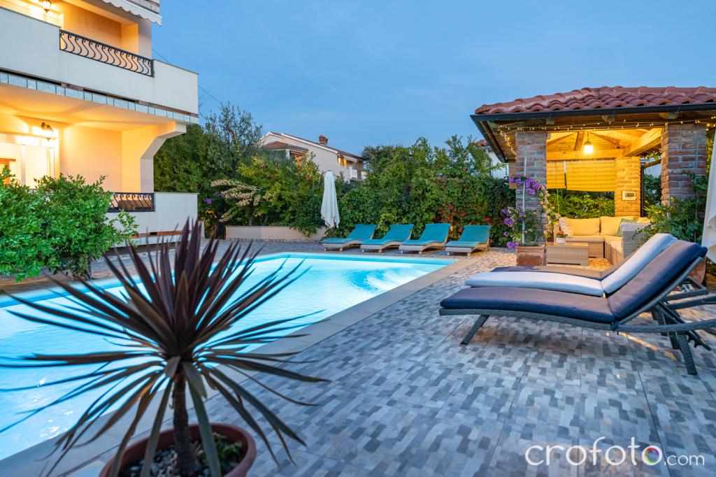 Casa APARTAMENTE JURIĆ are o locație excelentă, aproape de centru și de cele mai renumite restaurante, aproape de mare, aproape de parc. Ceea ce câștigă cu adevărat este departe de aglomerație, într-o locație liniștită, cu piscină proprie și grădină cu foișor separat cu șemineu și o masă mare, pe care am pus-o la dispoziția dragilor noștri oaspeți. Zonă plăcut amenajată și mobilată în jurul piscinei, cu locuri confortabile la umbra unui foișor intim, șezlonguri confortabile, înconjurată de verdeață înaltă. În grădină, măslini, ierburi mediteraneene, plante ornamentale și flori conferă o atmosferă specială. Atmosfera este foarte plăcută, potrivită pentru o vacanță liniștită și relaxare.