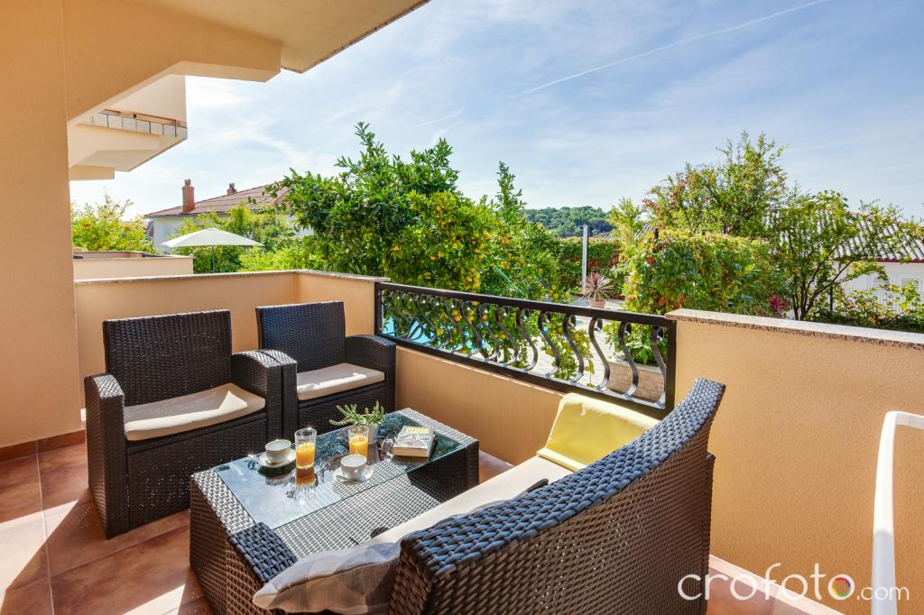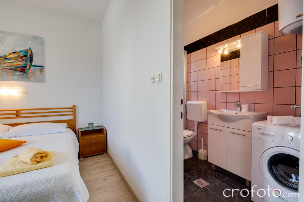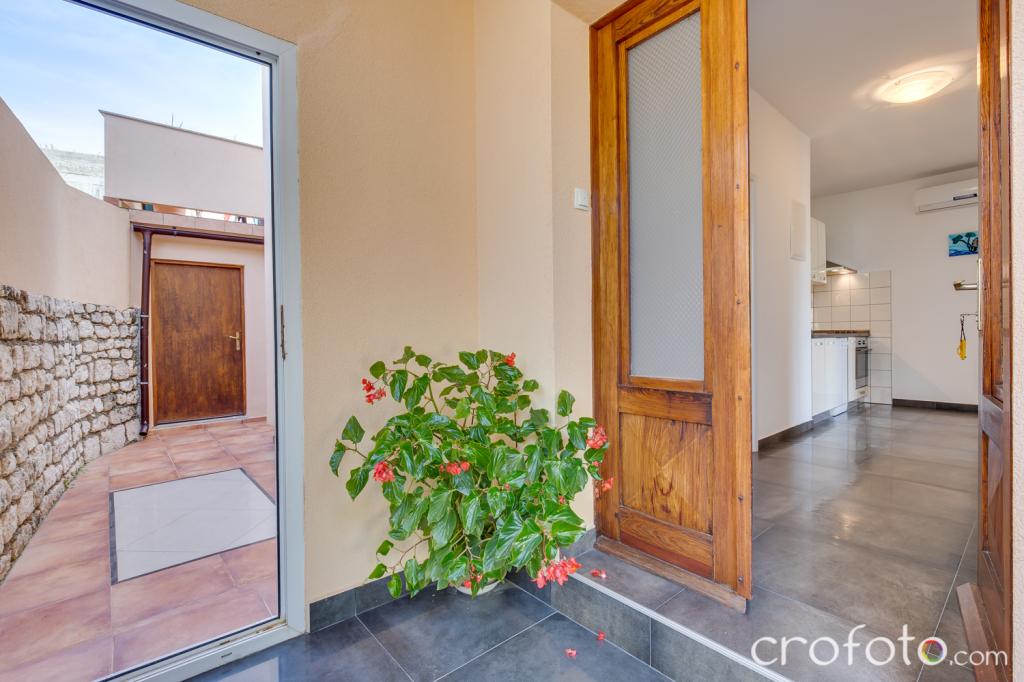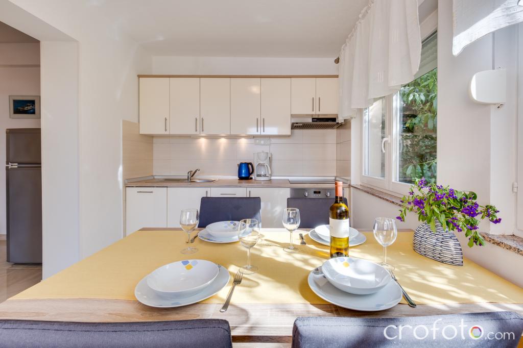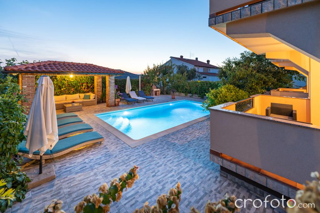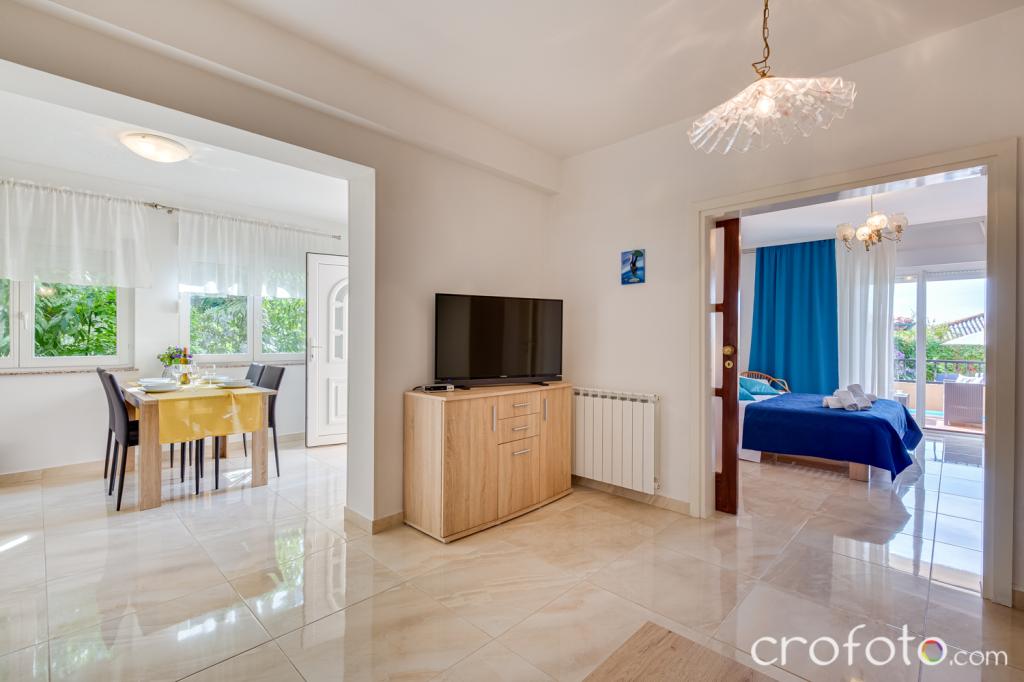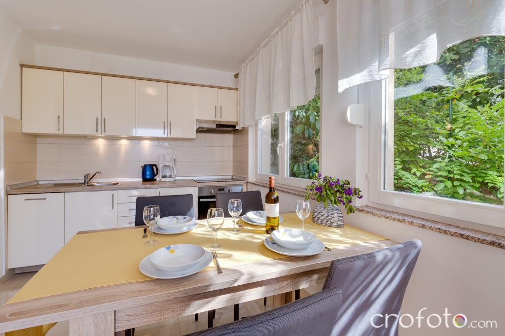Casa APARTAMENTE JURIĆ are o locație excelentă, aproape de centru și de cele mai renumite restaurante, aproape de mare, aproape de parc. Ceea ce câștigă cu adevărat este departe de aglomerație, într-o locație liniștită, cu piscină proprie și grădină cu foișor separat cu șemineu și o masă mare, pe care am pus-o la dispoziția dragilor noștri oaspeți. Zonă plăcut amenajată și mobilată în jurul piscinei, cu locuri confortabile la umbra unui foișor intim, șezlonguri confortabile, înconjurată de verdeață înaltă. În grădină, măslini, ierburi mediteraneene, plante ornamentale și flori conferă o atmosferă specială. Atmosfera este foarte plăcută, potrivită pentru o vacanță liniștită și relaxare.