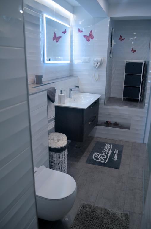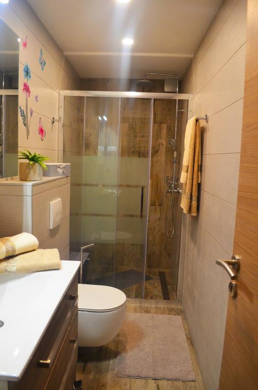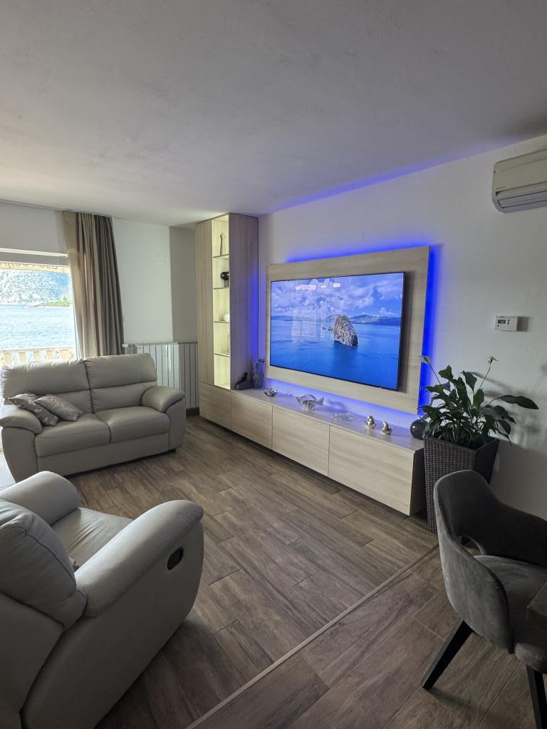 Apartamentul in care ne-am cazat este foarte frumos si spatios, are o terasa mare cu vedere superba la mare. Am primit o primire foarte plăcută când am ajuns. Locul în care sunt situate apartamentele este foarte liniștit, cu o mare frumoasă și limpede și este ideal pentru familiile cu copii.