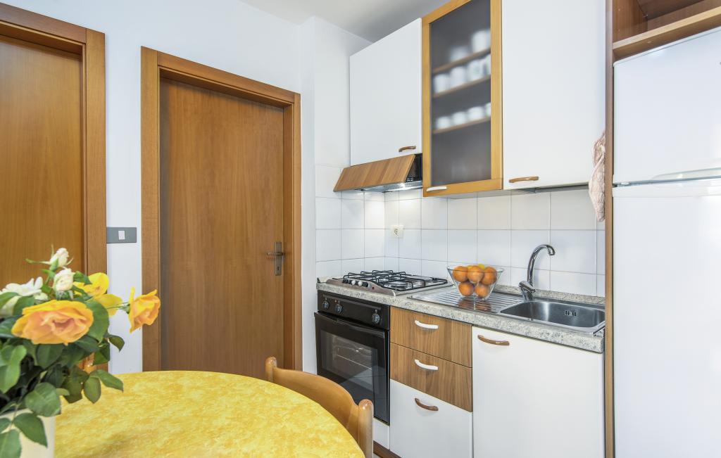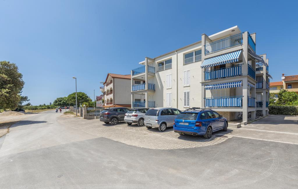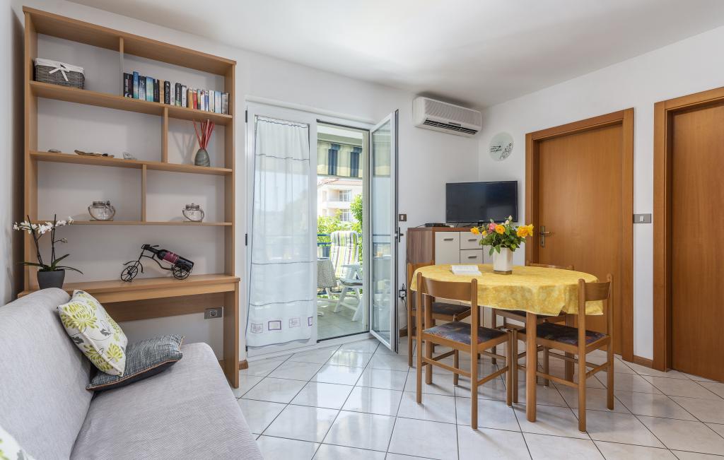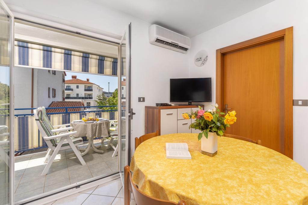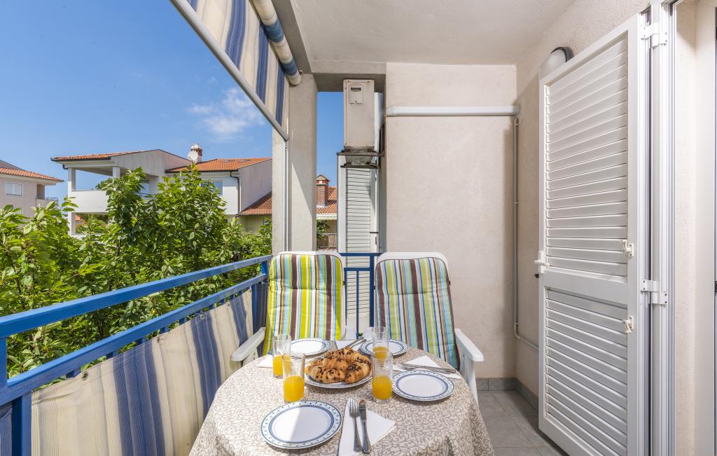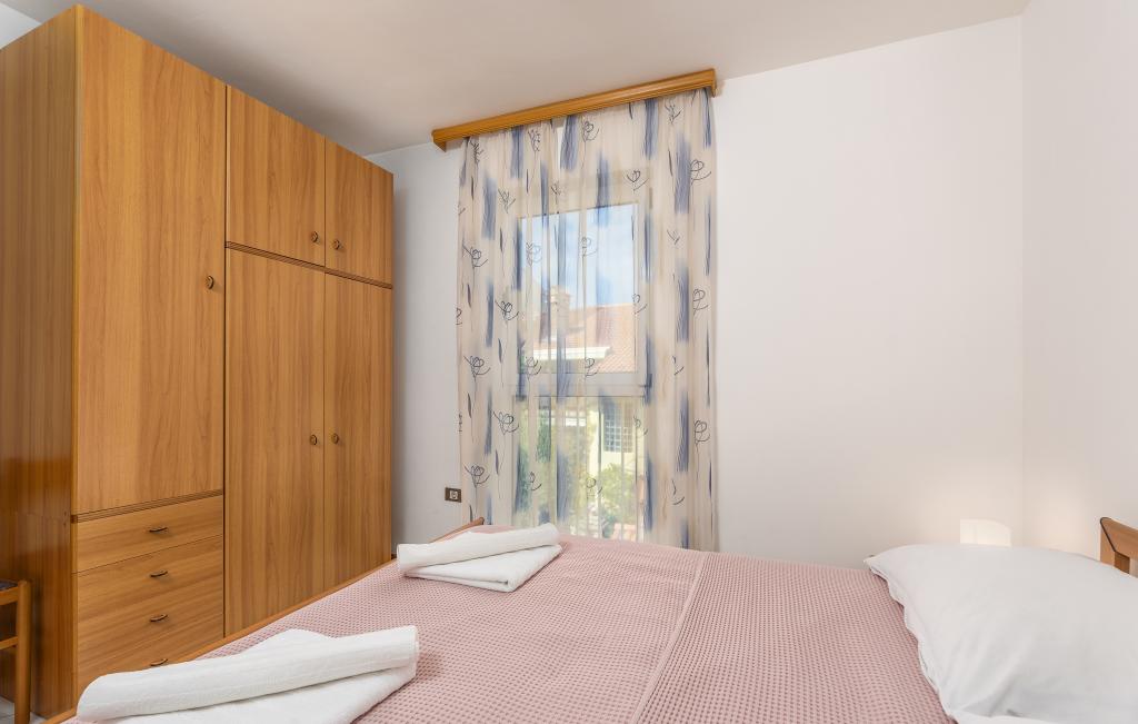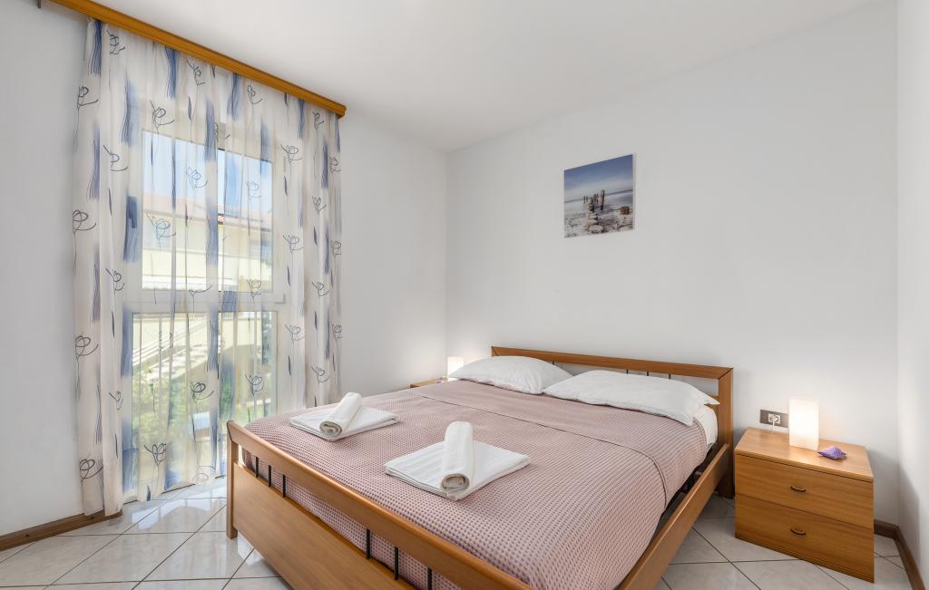 Apartamentul este situat la doar 400 m de mare (5 minute de mers pe jos) și la 20 de minute de mers pe jos de centrul orașului (800 m). Apartamentul este situat la etajul 1 al clădirii și este format din două dormitoare duble: unul cu pat dublu și celălalt cu două paturi de o persoană. Bucătăria, sufrageria și livingul au acces la un balcon frumos cu vedere la verdeață și la zona înconjurătoare. Bucătăria este complet utilată: 3 plite pe gaz, 1 plită electrică, prăjitor de pâine, cuptor, fierbător. Livingul are TV prin satelit, aer condiționat. Baia este dotată cu duș, mașină de spălat, bideu. Există parcare în fața clădirii (contra cost, 7 euro pe zi). Există un studio de fitness și pilates chiar în clădire. Acest apartament vă oferă un sejur complet relaxant și plăcut lângă frumoasele plaje din Rovinj, unde aproape că nu trebuie să folosiți o mașină, iar noi vă stăm la dispoziție pentru orice întrebări!
