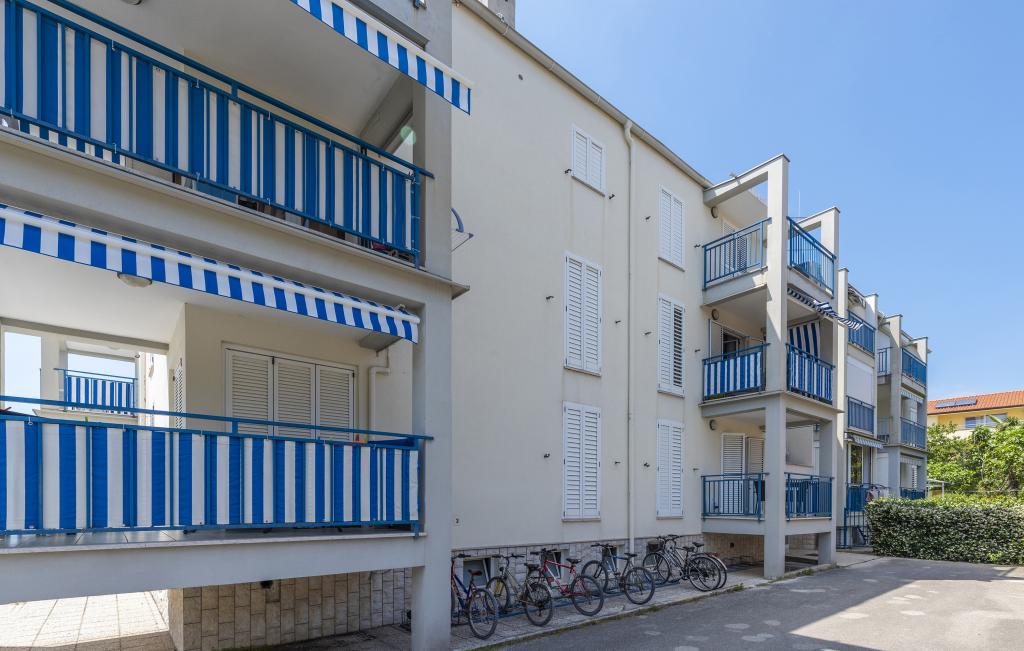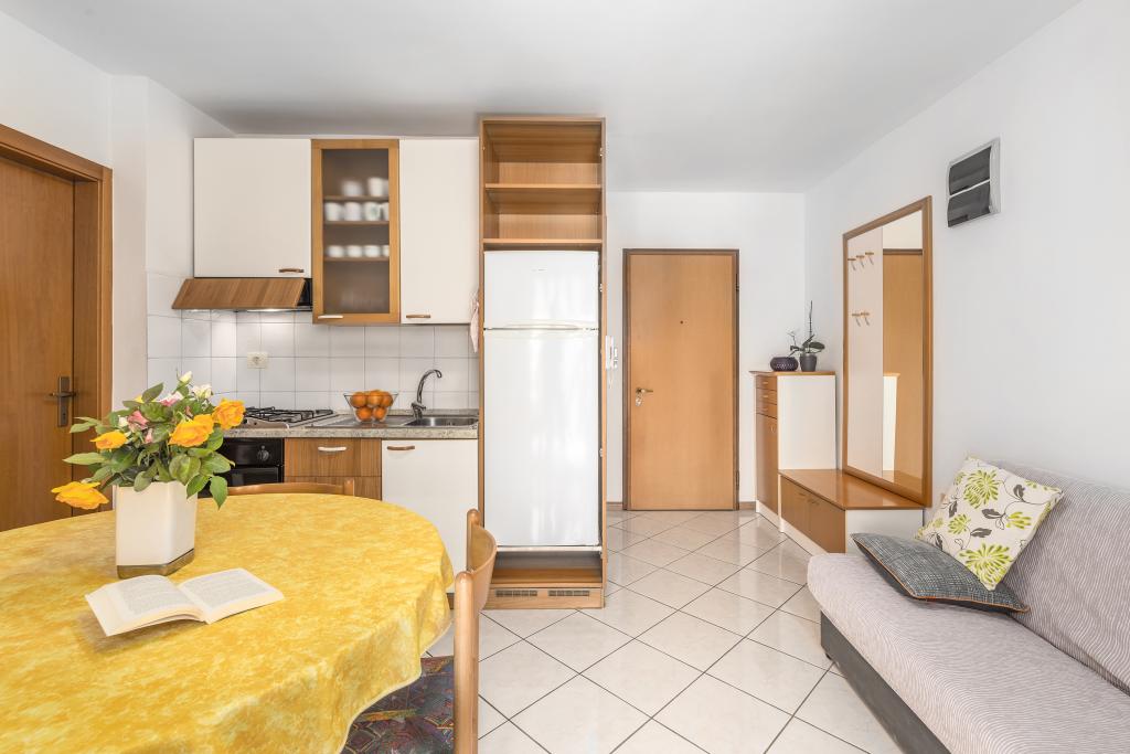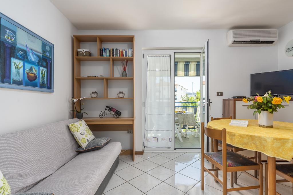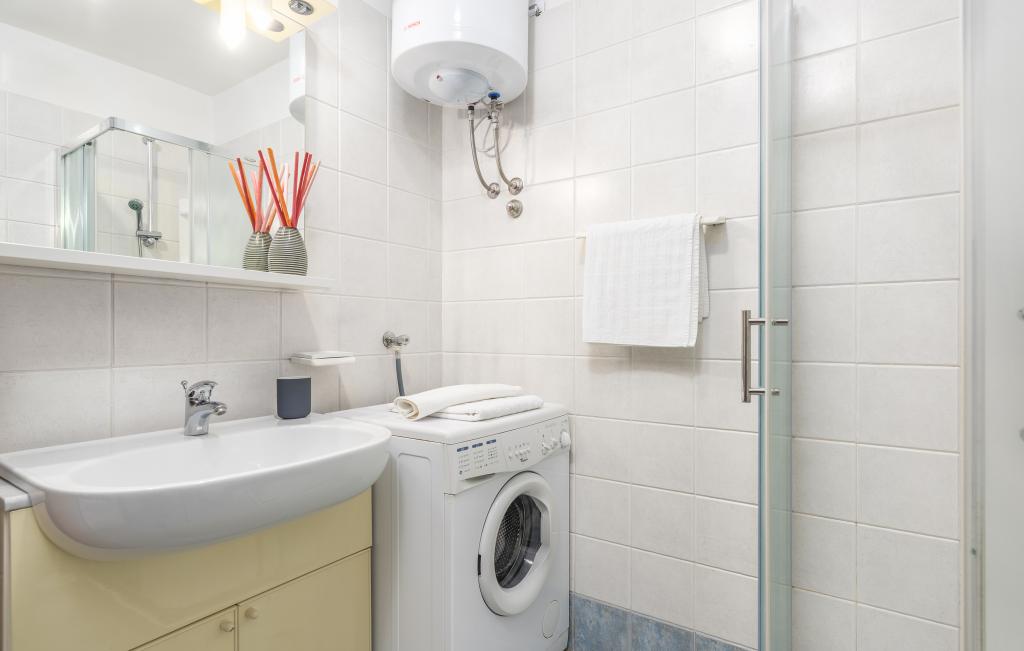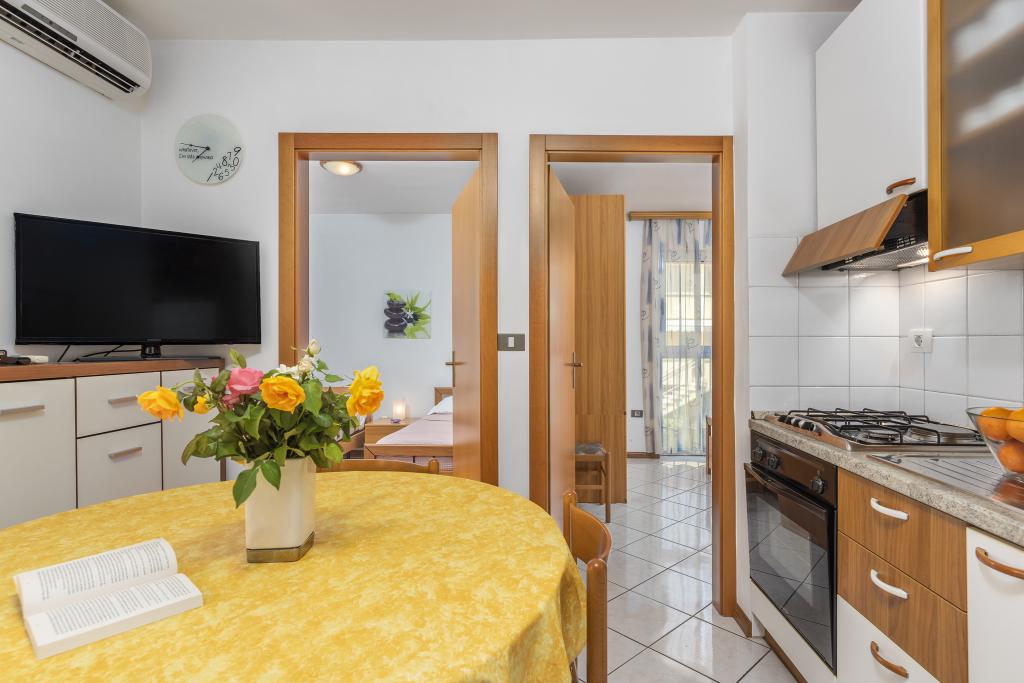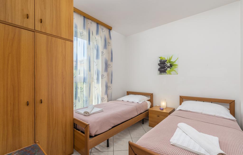 Apartamentul este situat la doar 400 m de mare (5 minute de mers pe jos) și la 20 de minute de mers pe jos de centrul orașului (800 m). Apartamentul este situat la etajul 1 al clădirii și este format din două dormitoare duble: unul cu pat dublu și celălalt cu două paturi de o persoană. Bucătăria, sufrageria și livingul au acces la un balcon frumos cu vedere la verdeață și la zona înconjurătoare. Bucătăria este complet utilată: 3 plite pe gaz, 1 plită electrică, prăjitor de pâine, cuptor, fierbător. Livingul are TV prin satelit, aer condiționat. Baia este dotată cu duș, mașină de spălat, bideu. Există parcare în fața clădirii (contra cost, 7 euro pe zi). Există un studio de fitness și pilates chiar în clădire. Acest apartament vă oferă un sejur complet relaxant și plăcut lângă frumoasele plaje din Rovinj, unde aproape că nu trebuie să folosiți o mașină, iar noi vă stăm la dispoziție pentru orice întrebări!