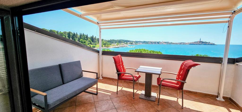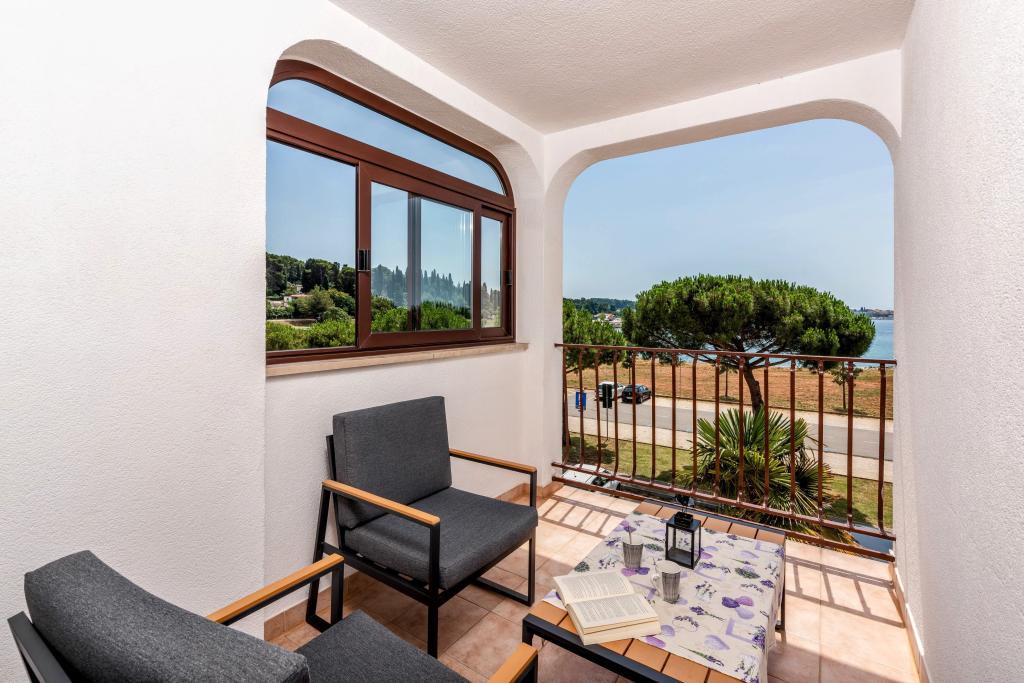 La 40 de metri de mare și plajă, 3 apartamente noi în Rovinj, primul rând! Vedere frumoasă asupra mării, a golfului Rovinj și a orașului vechi Rovinj! Fiecare apartament are o terasă cu vedere la mare și la Rovinj, o masă și scaune și protecție solară.