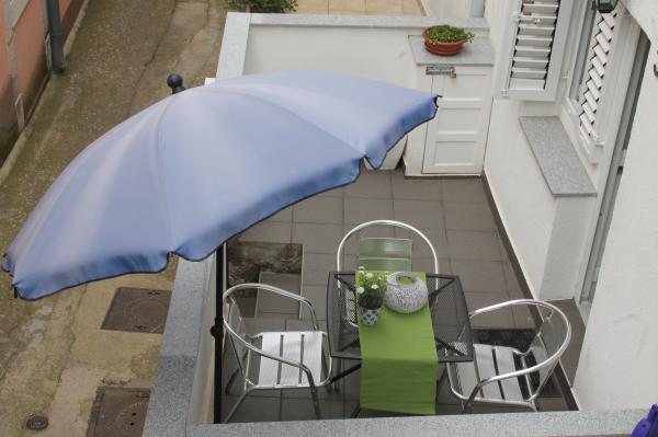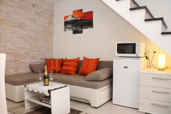 Apartament modern echipat pe două etaje (casă decomandată la rând) cu terasă proprie în orașul vechi într-o locație foarte liniștită și la doar 50 m distanță de centru, în apropiere de supermarketuri, oficii poștale, case de schimb valutar, cafenele și restaurante. distanță de plajă 100 m. La etajul superior există un dormitor cu un pat dublu 160x200 și o baie, iar la etajul inferior există un living cu o bucătărie și o canapea de colț care este folosită ca pat suplimentar 160x200 . Apartamentul este complet echipat cu totul pentru o vacanță plăcută. În fața intrării se află o terasă de 10 m2 care poate fi folosită ca sufragerie de vară sau ca loc de relaxare. Fumatul nu este permis în casă Animalele de companie nu sunt permise. Pentru oaspeți este asigurată parcarea pentru un vehicul, la 5 minute de mers pe jos de apartament. După plecarea oaspeților, apartamentul este dezinfectat în detaliu și se iau toate măsurile pentru a proteja oaspeții de infecții. În caz de nevoie, există asistență medicală în apropiere, disponibilă nonstop.