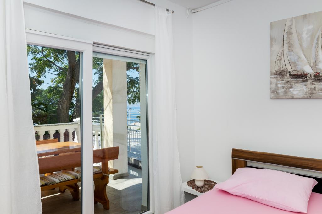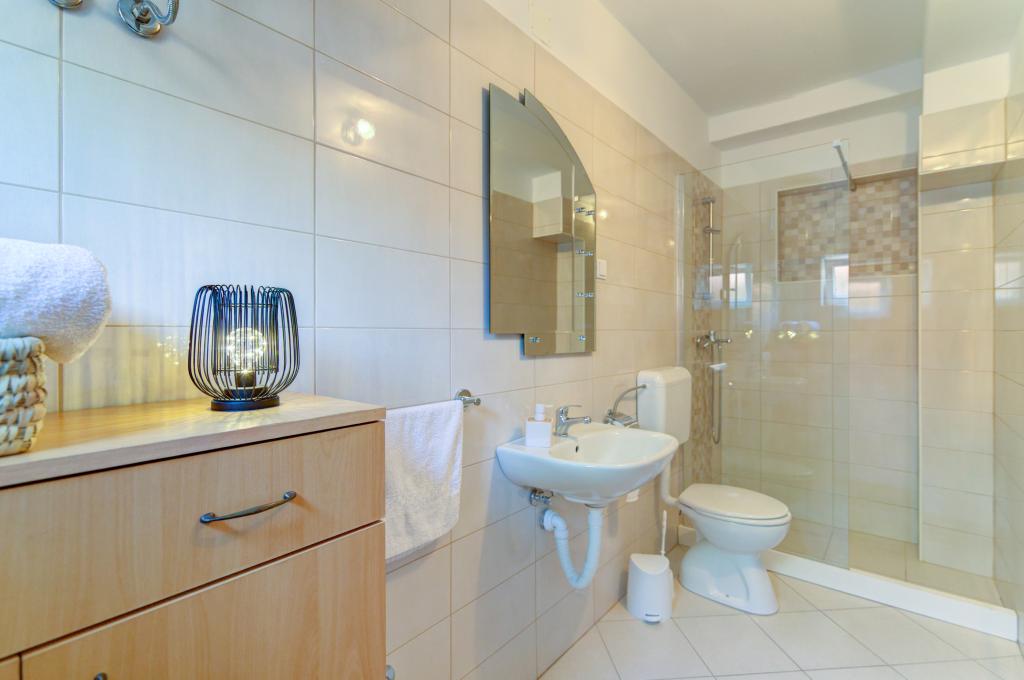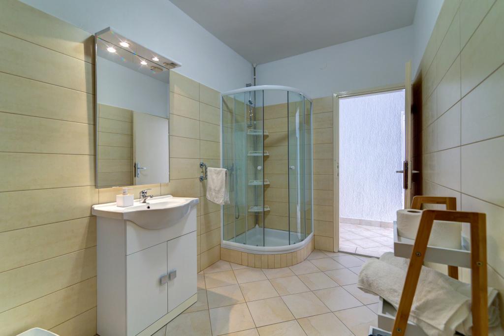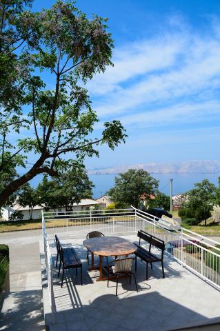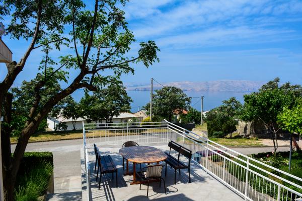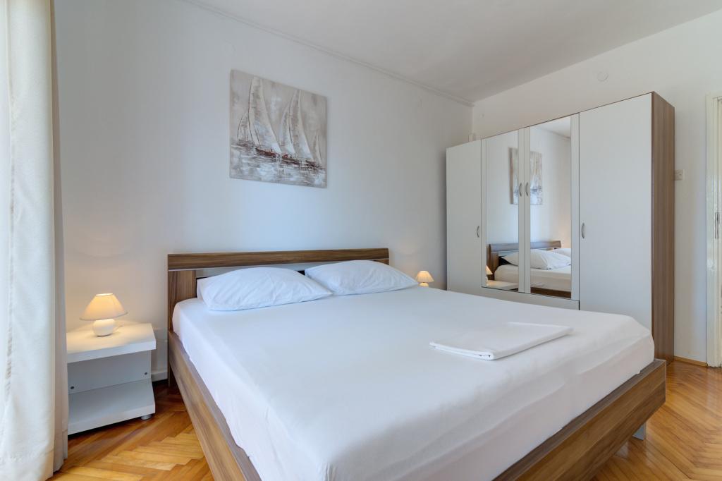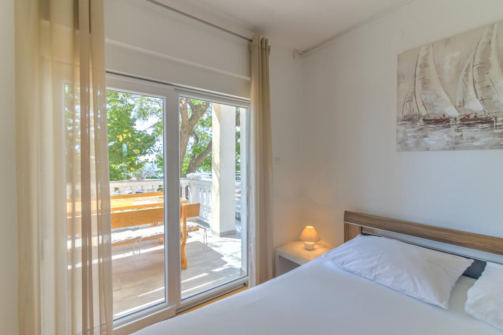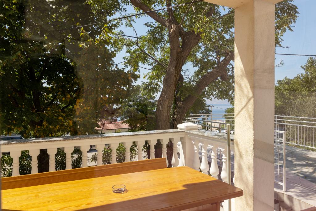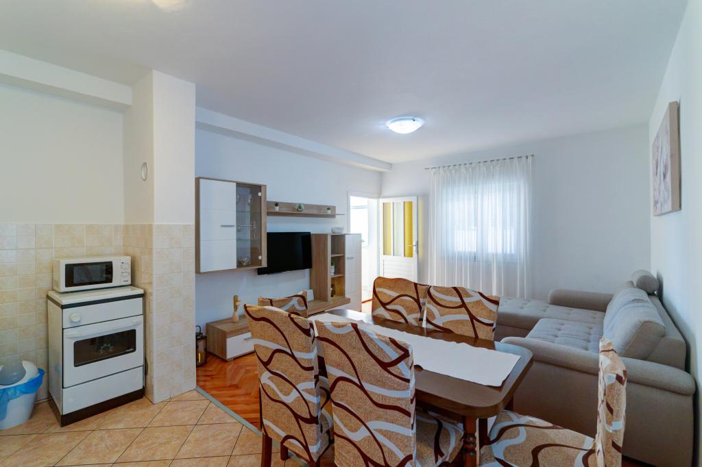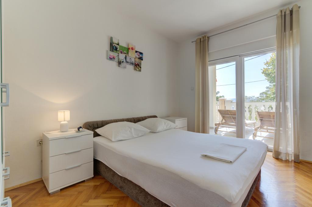 Apartamentul Marta dotat modern (suprafață 100 m2) pentru 7 persoane este situat la parterul unei case de familie înconjurate de verdeață și are două camere mari cu paturi duble cu o vedere frumoasă la mare, o cameră spațioasă cu trei paturi, două băi cu duș și WC, living spațios cu un pat suplimentar, sufragerie și bucătărie conectată la un foișor acoperit și grătar. Un foișor mare acoperit (suprafață 40 m2) cu grătar și locuri pentru 8 persoane și două terase (suprafață 50 m2) cu vedere la mare dotate cu scaune și două șezlonguri sunt destinate doar oaspeților acestui apartament. In fata apartamentului se afla o gradina amenajata cu doi copaci mari, iarba si flori si trei locuri de parcare gratuite. Facilitatea este situată într-o zonă liniștită a orașului, la 10 minute de mers pe jos de prima plajă și de centrul orașului.