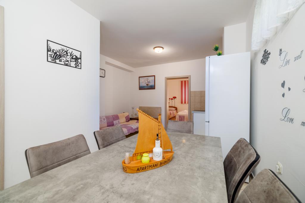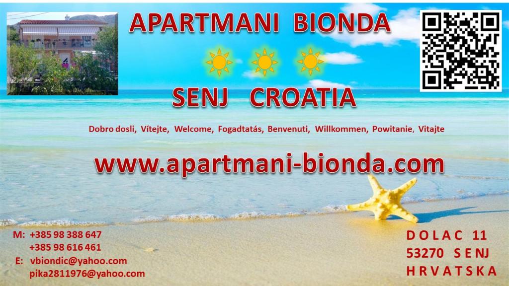 Apartamentele BIONDA sunt construite recent, complet și modern utilate, într-o zonă liniștită a orașului Senj. Sunt situate într-o clădire separată, adică o casă detașată. Fiecare apartament are intrare separată, balcon sau terasă proprie, masă și scaune pentru balcon la dispoziția dumneavoastră, TV prin satelit, internet wireless, WI-FI, minibar, aer condiționat, panouri electrice de încălzire și parcare pentru mașina dumneavoastră. În imediata vecinătate a orașului Senj se află Parcul Național Lacurile Plitvice, parcurile naturale Velebit, Zavratnica, insulele Goli, Grgur, Prvić, Krk și Rab. Apartamentele sunt închiriate pe tot parcursul anului.