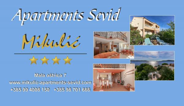 Sevid na moru, suficient de ascuns de mulțimea orașului, dar suficient de aproape pentru a vedea totul. Un colț însorit și ascuns de natură neatinsă, ideal pentru o adevărată vacanță mediteraneană. Deși mic, Sevid are tot ce ai nevoie de magazine, restaurante, cafenele, mare limpede și plaje frumoase; Ideal pentru familiile cu copii în zilele toride de vară, precum și iarna. Apartamentele Mikulić sunt situate în partea de est a peninsulei Sevid, la 20 de metri de mare, cu o vedere frumoasă la mare, insulele din jur și o grădină plină de verdeață. Apartamentele au 4 stele și pot fi numite o adevărată vilă de vacanță de lux. Oaspeții au acces la o grădină cu grătar, o grădină mediteraneană, parcare, o plajă cu doc pentru bărci. Plaja de nisip este foarte aproape de casa. oferim posibilitatea de a inchiria o barca cu apartamentul (barca cu motor sau barca mica). oferim de asemenea hidrobiciclete, jet ski-uri, sup boards, biciclete de inchiriat. Bun venit!!!