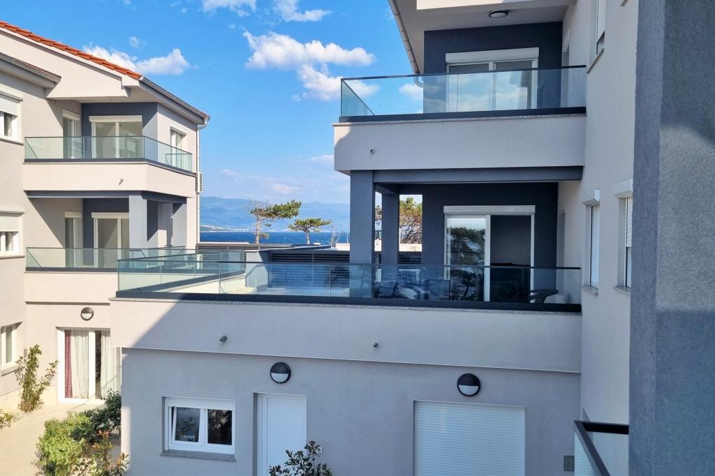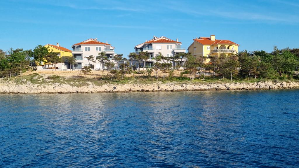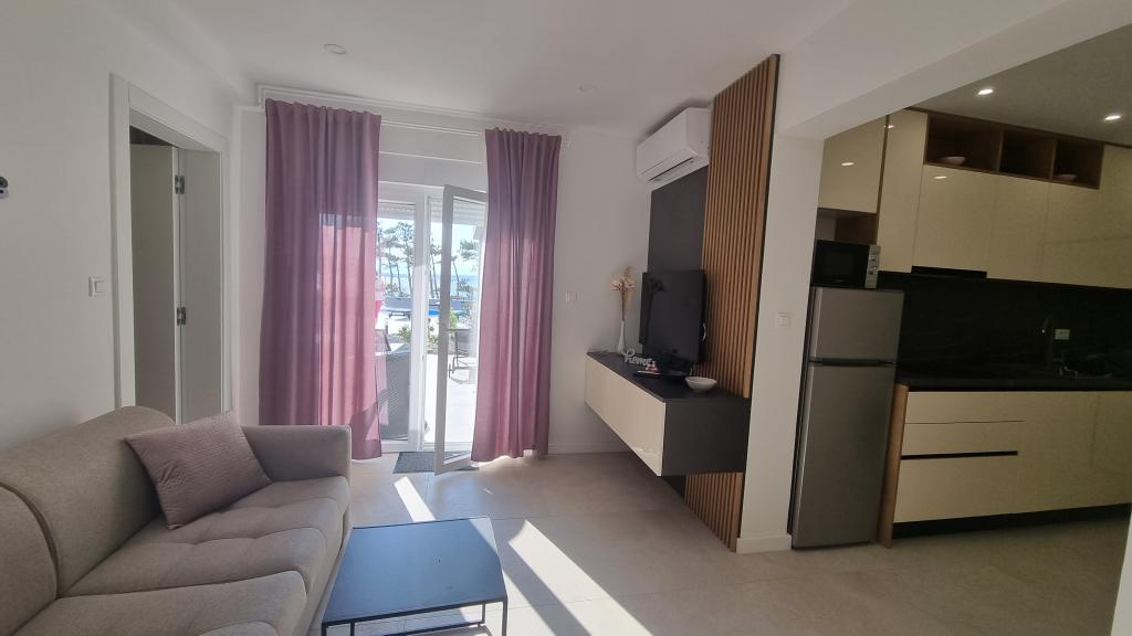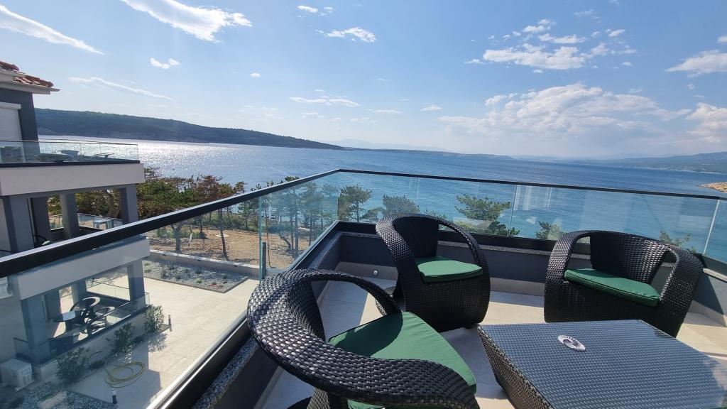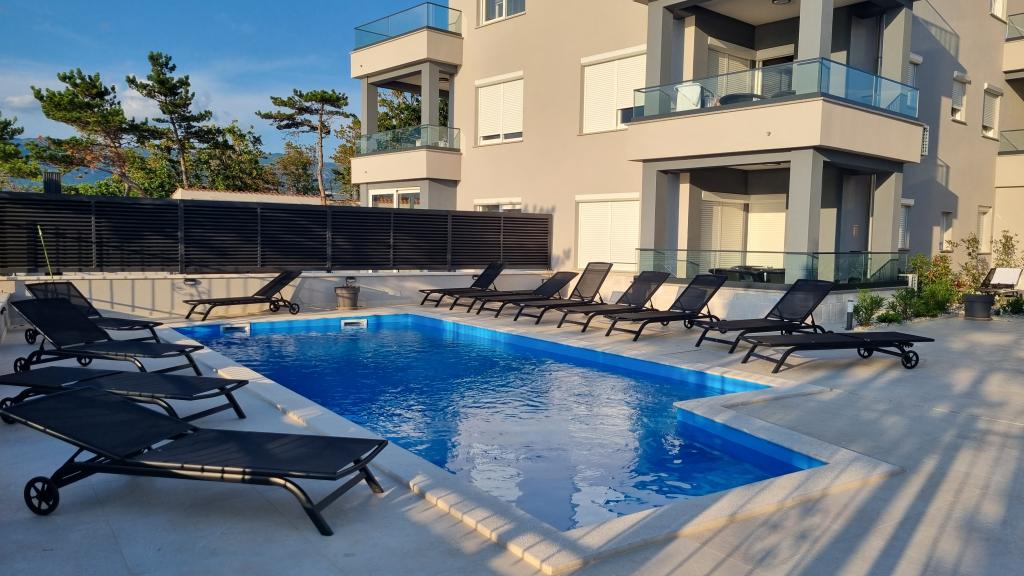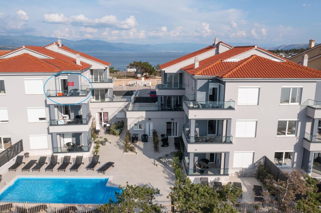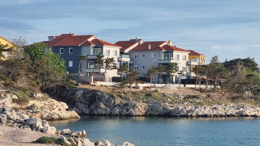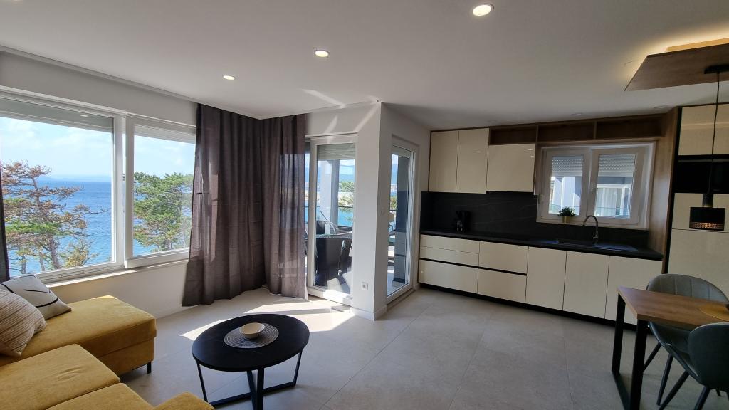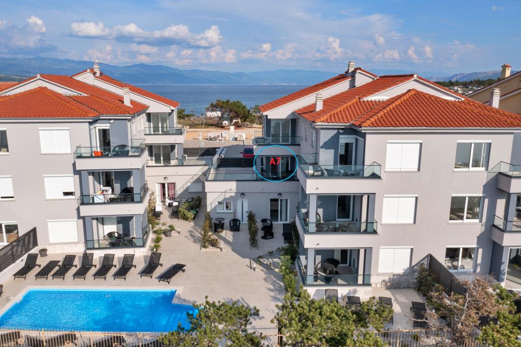 Aceste apartamente de lux cu vedere la mare sunt situate într-un complex de clădiri într-o locație liniștită. Toate apartamentele sunt dotate modern cu două sau chiar trei aparate de aer condiționat și televizoare inteligente în sufragerie și dormitoare. Cladirea dispune de o piscina mare cu apa sarata (36 m2) de uz comun, si este deschisa din mai pana in octombrie, cu temperaturi care ajung de obicei la 20-26°C Cladirea are in total 12 apartamente. Imobilul dispune de parcare privată complet împrejmuită. În imediata apropiere se află o plajă mare cu pietriș, iar în clădirea alăturată se află un restaurant excelent care oferă și o selecție de specialități locale. Toate apartamentele sunt dotate cu plită cu inducție, frigider cu congelator, ceainic, filtru de cafea, prăjitor de pâine, mașină de spălat vase și cuptor cu microunde. Zona de lângă piscină este dotată cu șezlonguri, umbrele și duș în aer liber. Wi-Fi este disponibil gratuit în întreaga clădire.