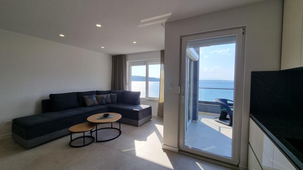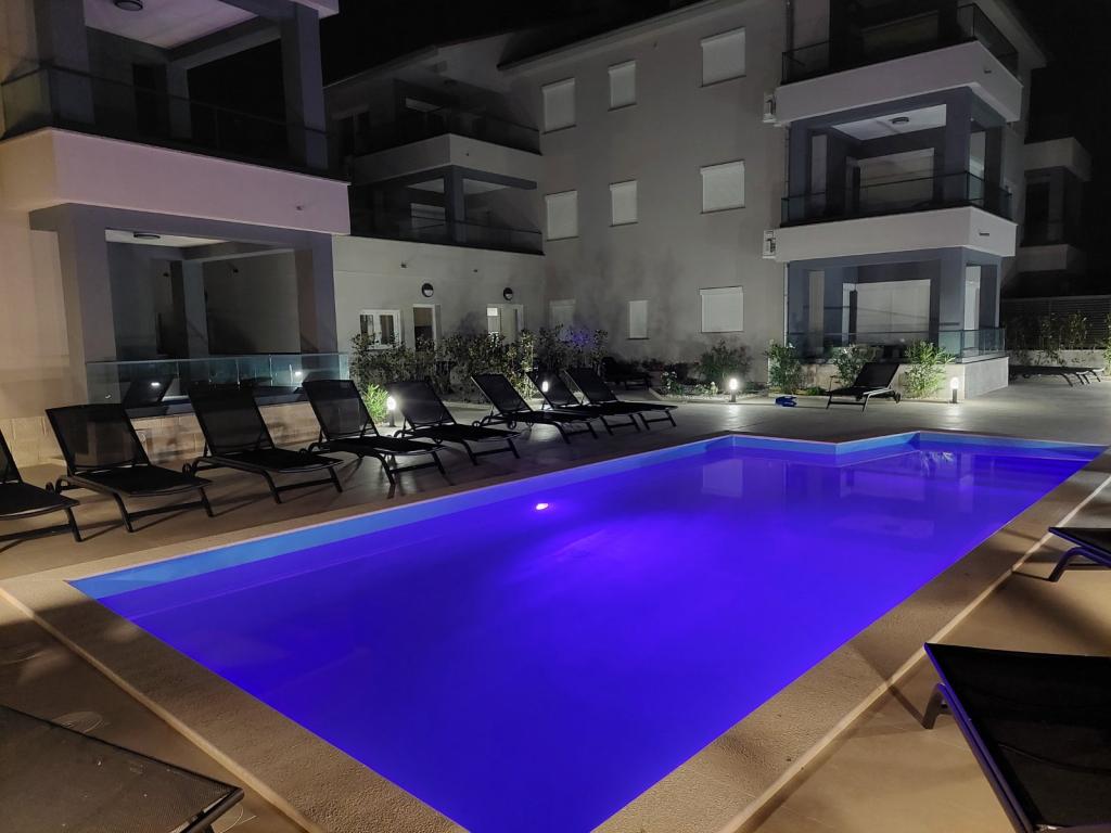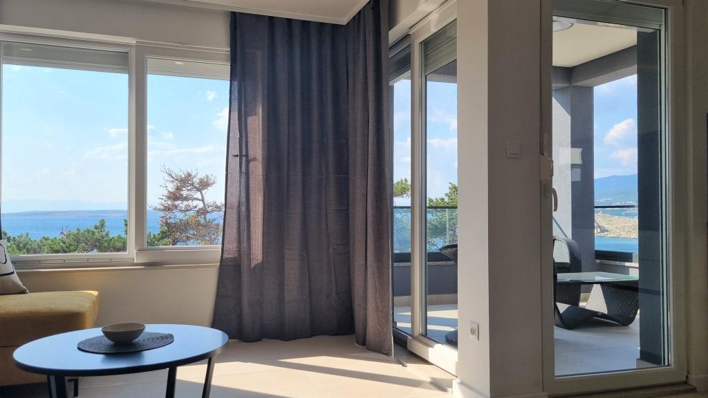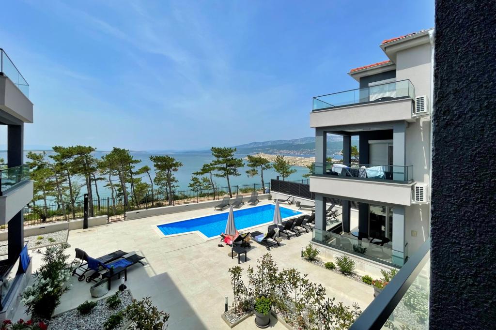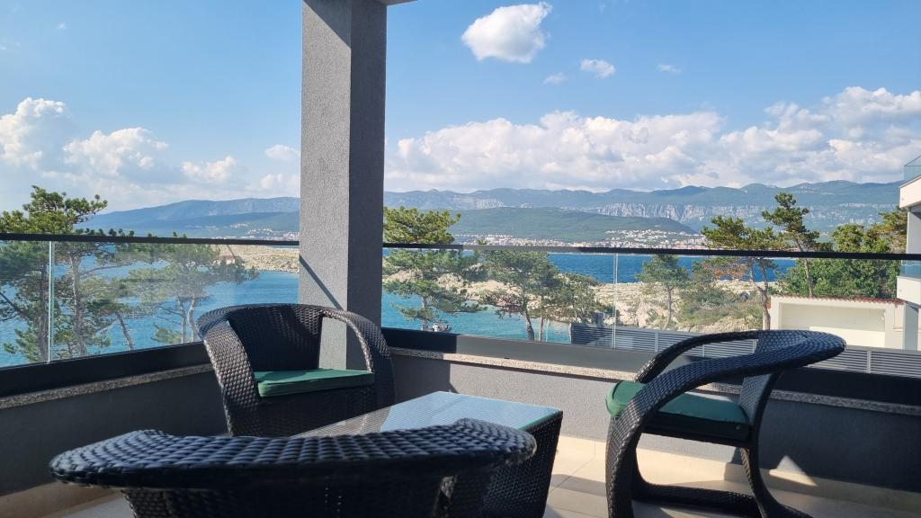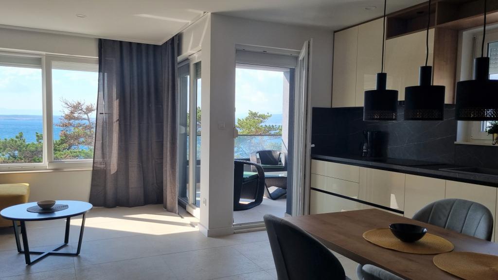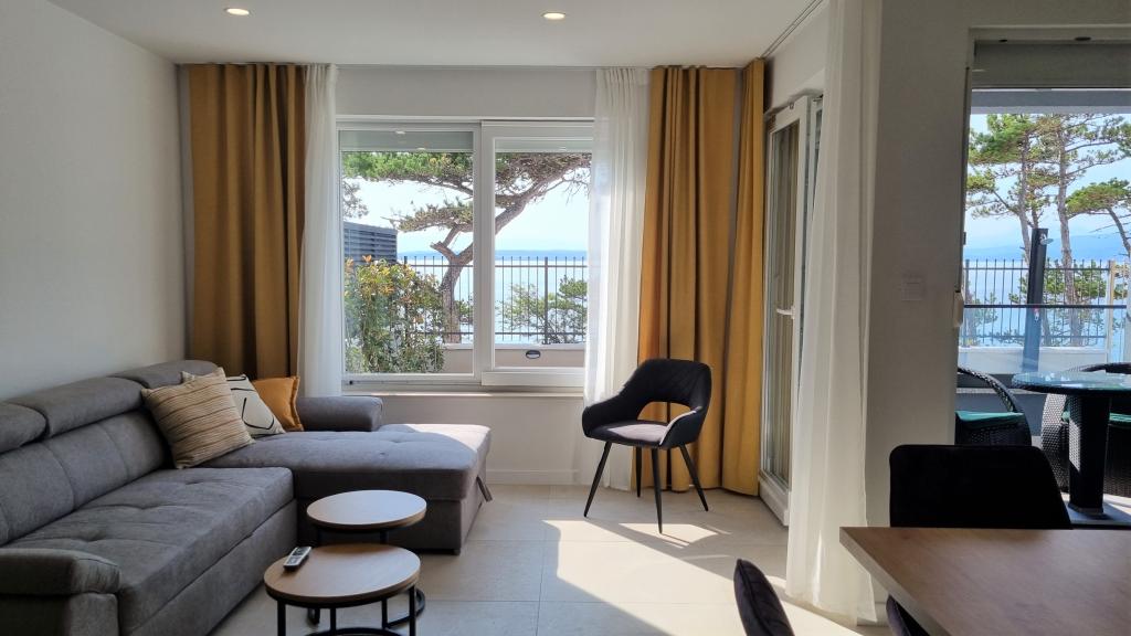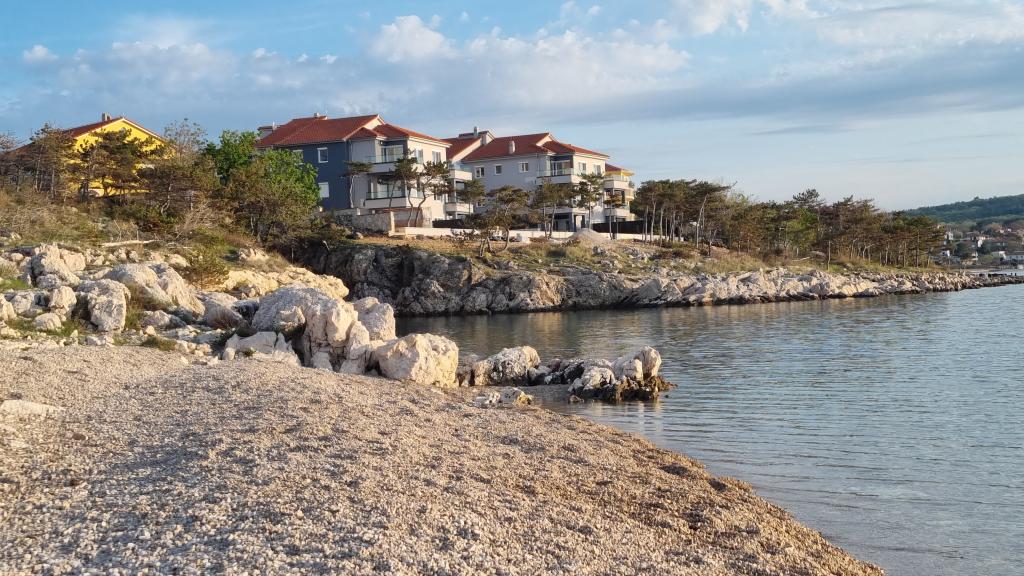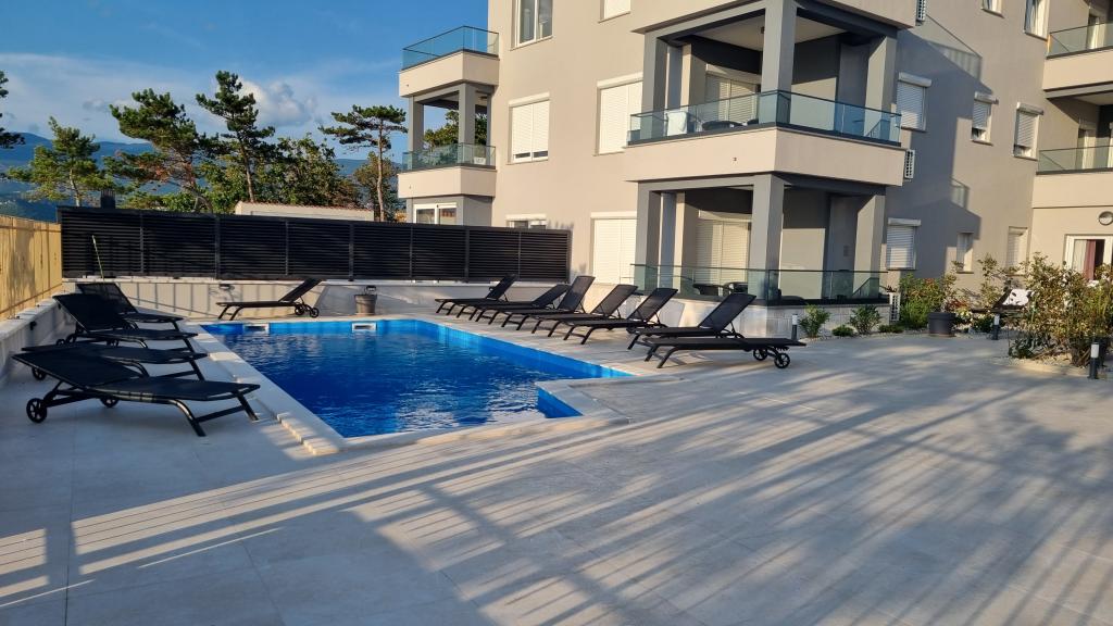 Aceste apartamente de lux cu vedere la mare sunt situate într-un complex de clădiri într-o locație liniștită. Toate apartamentele sunt dotate modern cu două sau chiar trei aparate de aer condiționat și televizoare inteligente în sufragerie și dormitoare. Cladirea dispune de o piscina mare cu apa sarata (36 m2) de uz comun, si este deschisa din mai pana in octombrie, cu temperaturi care ajung de obicei la 20-26°C Cladirea are in total 12 apartamente. Imobilul dispune de parcare privată complet împrejmuită. În imediata apropiere se află o plajă mare cu pietriș, iar în clădirea alăturată se află un restaurant excelent care oferă și o selecție de specialități locale. Toate apartamentele sunt dotate cu plită cu inducție, frigider cu congelator, ceainic, filtru de cafea, prăjitor de pâine, mașină de spălat vase și cuptor cu microunde. Zona de lângă piscină este dotată cu șezlonguri, umbrele și duș în aer liber. Wi-Fi este disponibil gratuit în întreaga clădire.